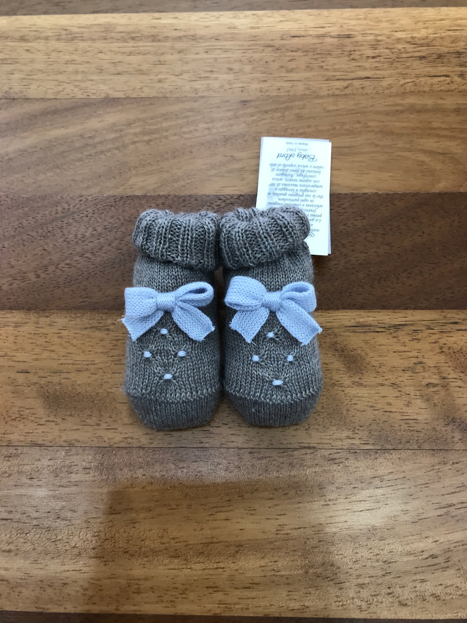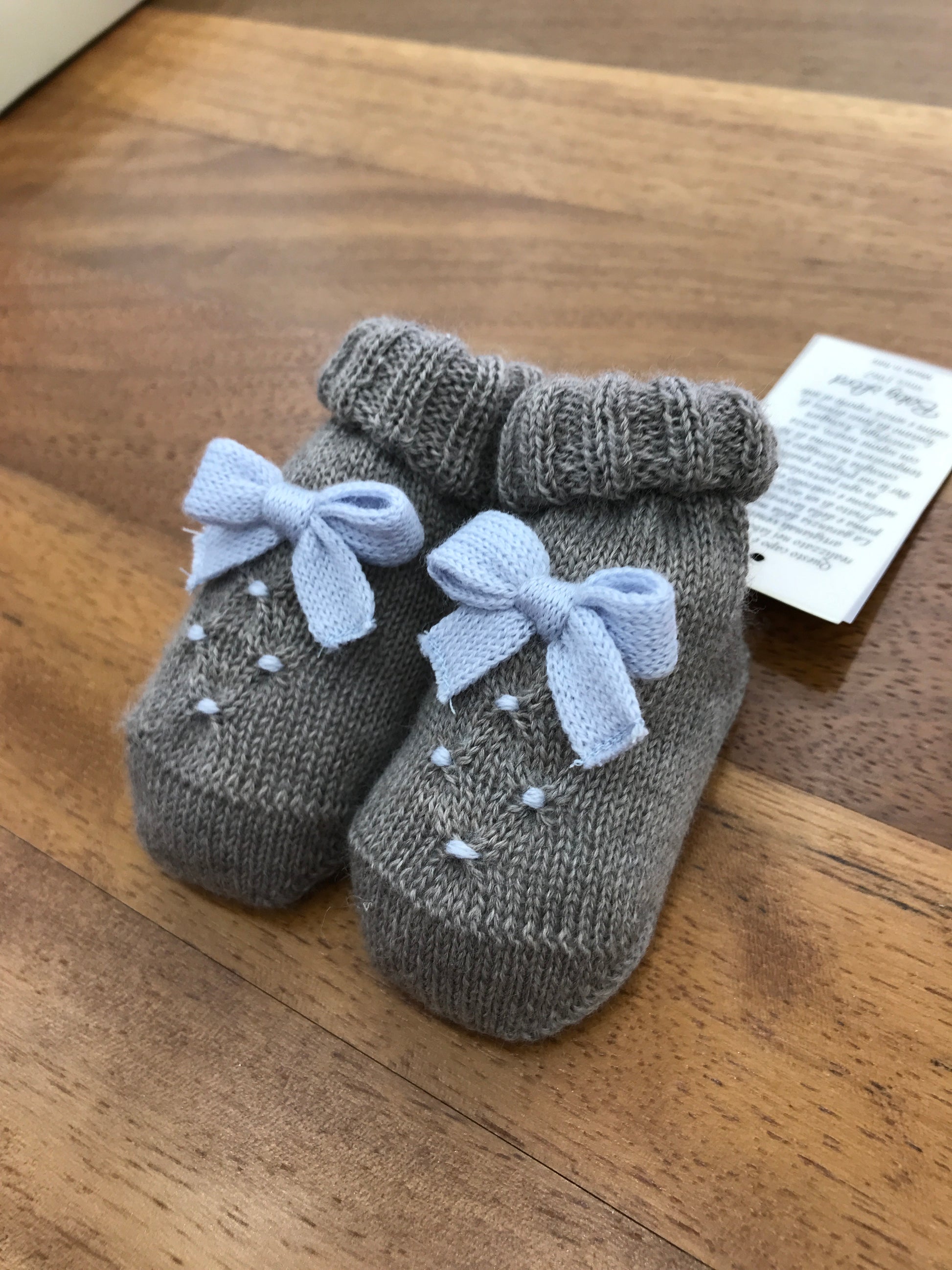 Babbucce realizzate in lana di colore grigio scuro, impreziosite da un fiocco azzurro e da un dettaglio smock sulla parte anteriore.