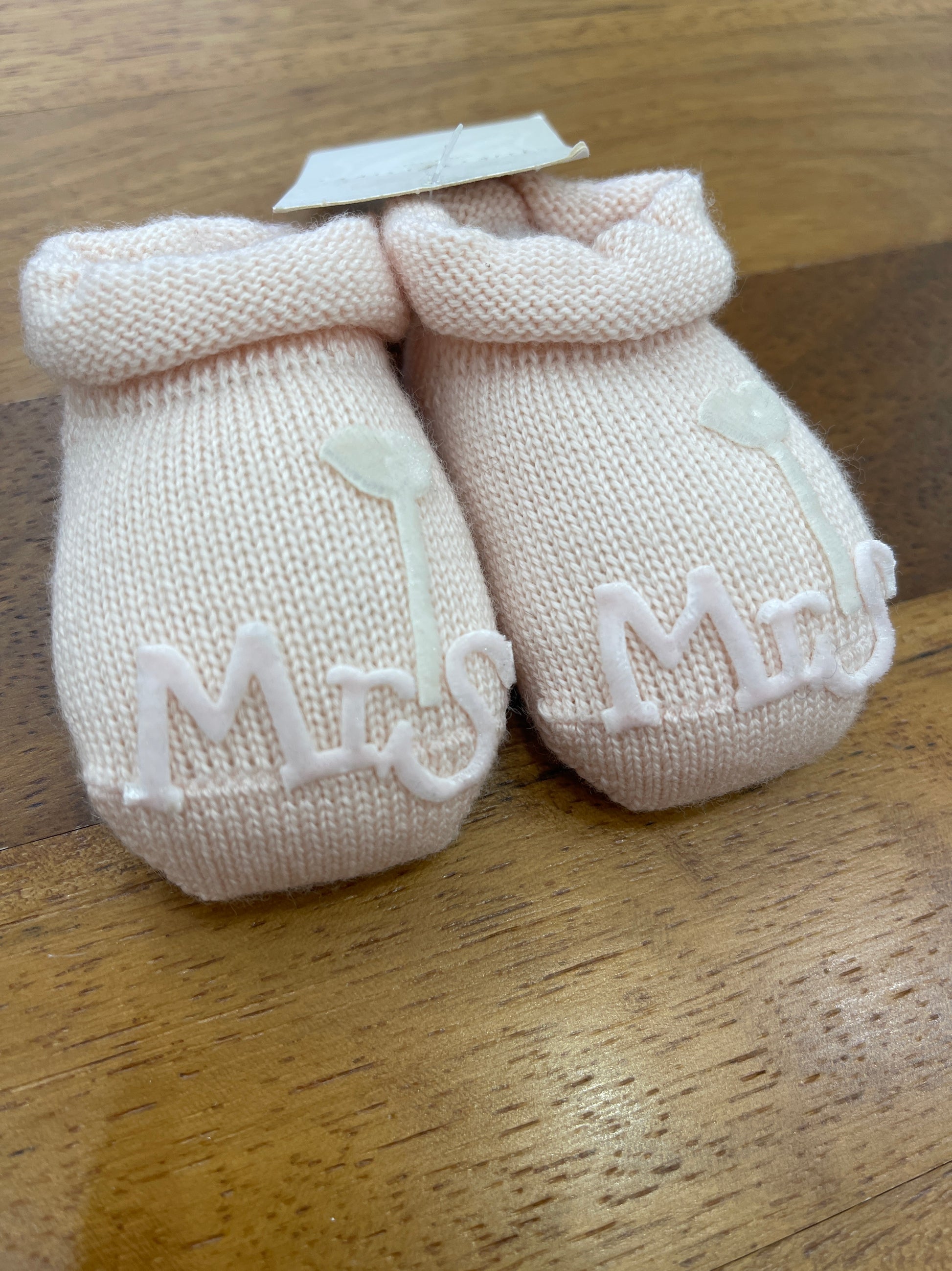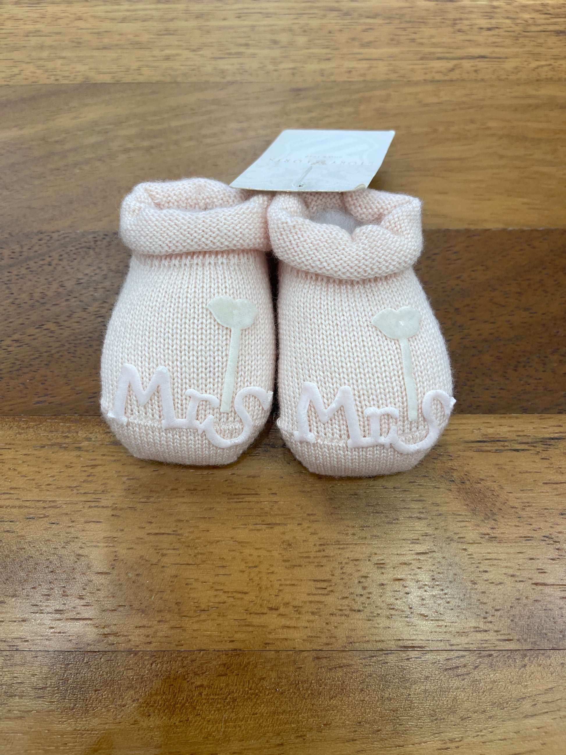 Babbucce rosa pastello in lana con piccolo risvolto e dettaglio in velluto con la scritta “mrs”.