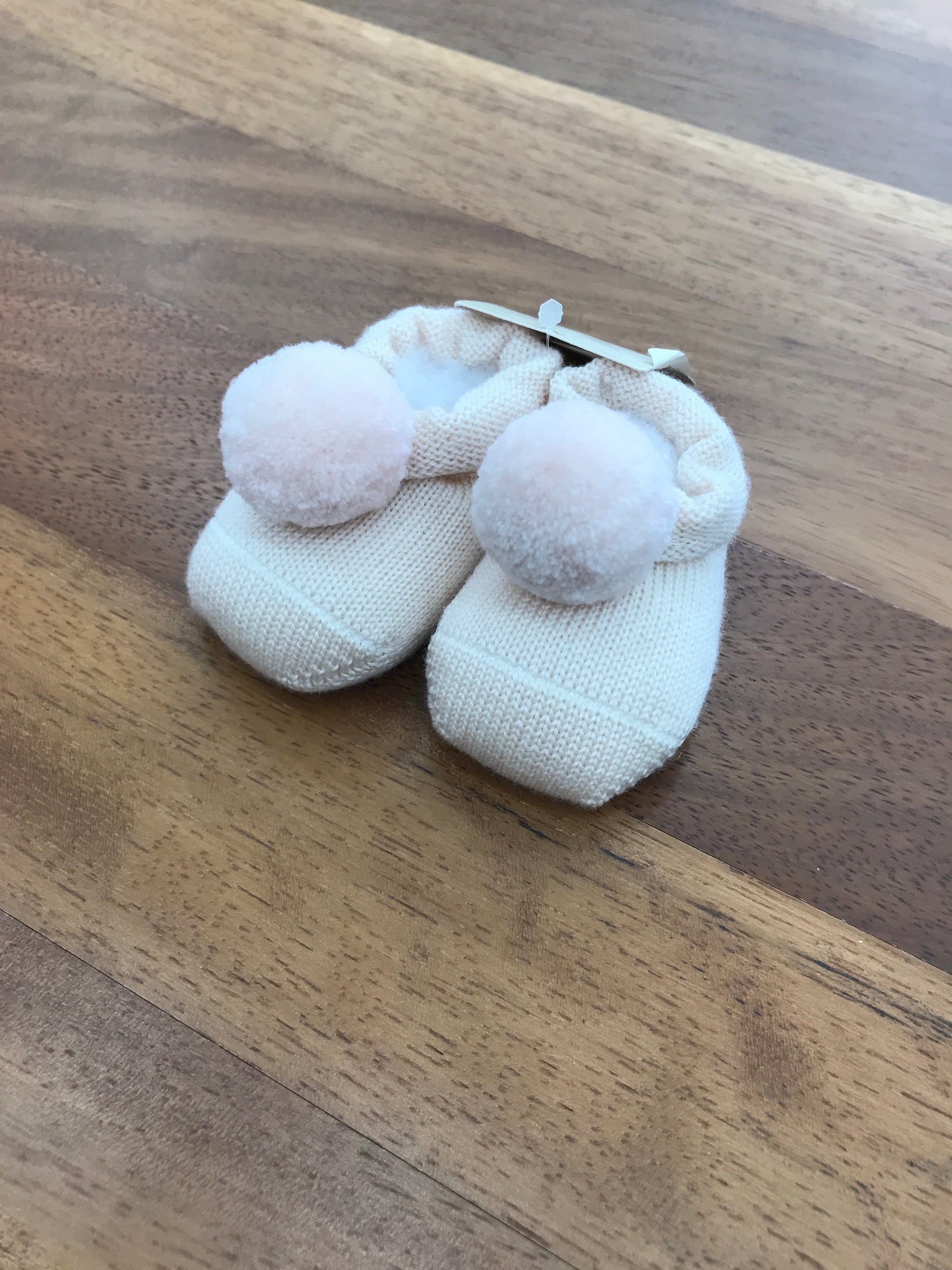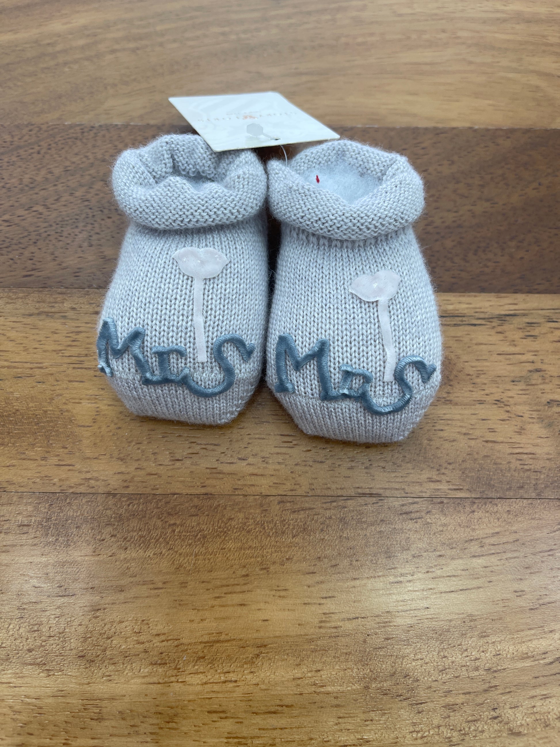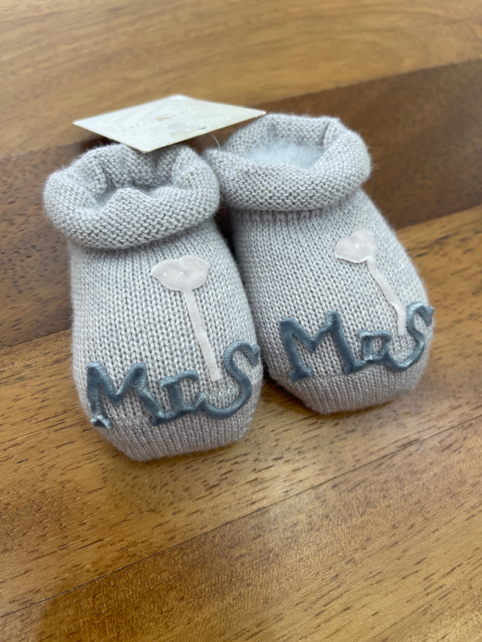 Babbucce in lana grigia dotate di un piccolo risvolto e una scritta in velluto applicata sulla parte frontale (mrs.mas.).