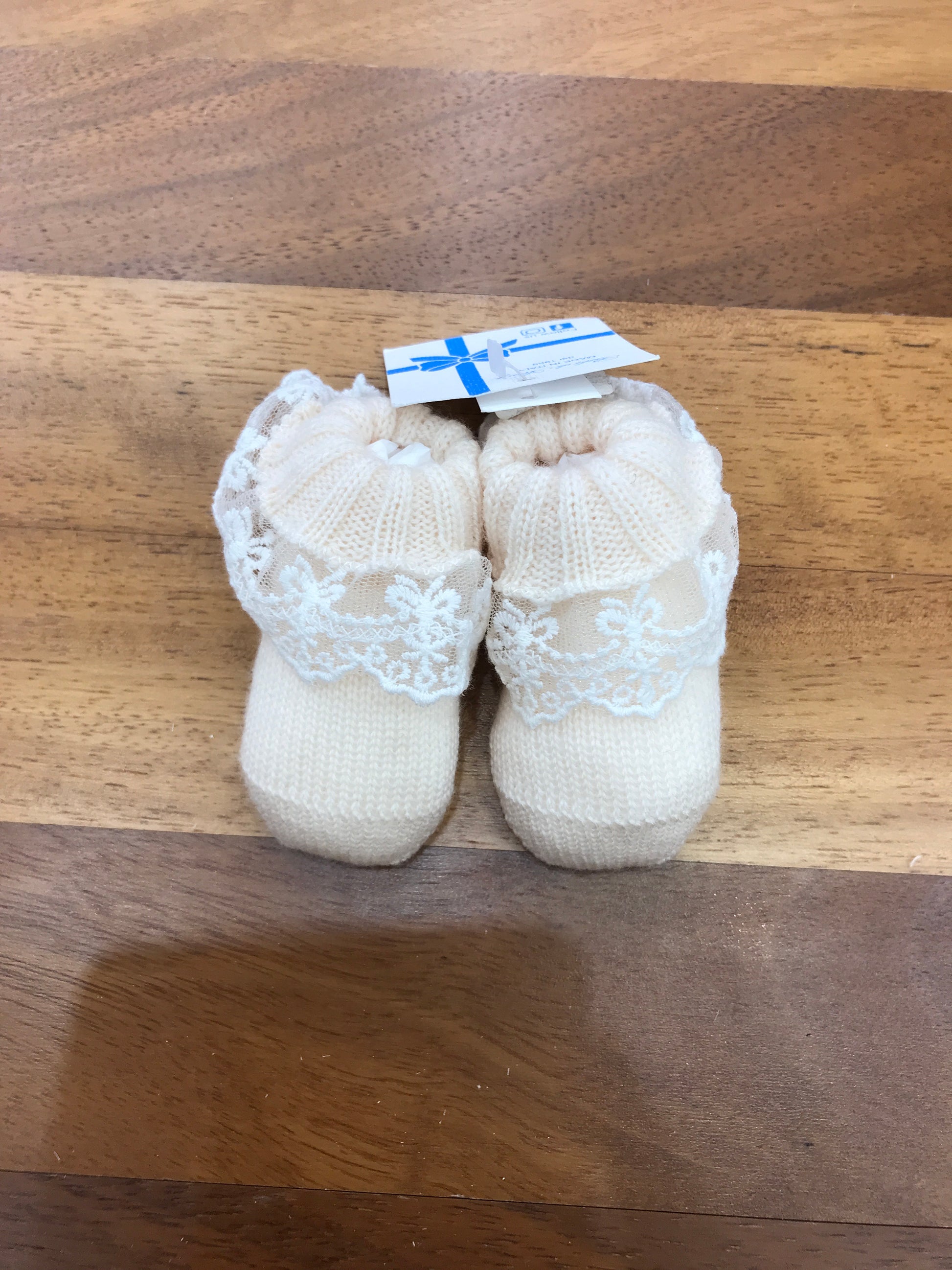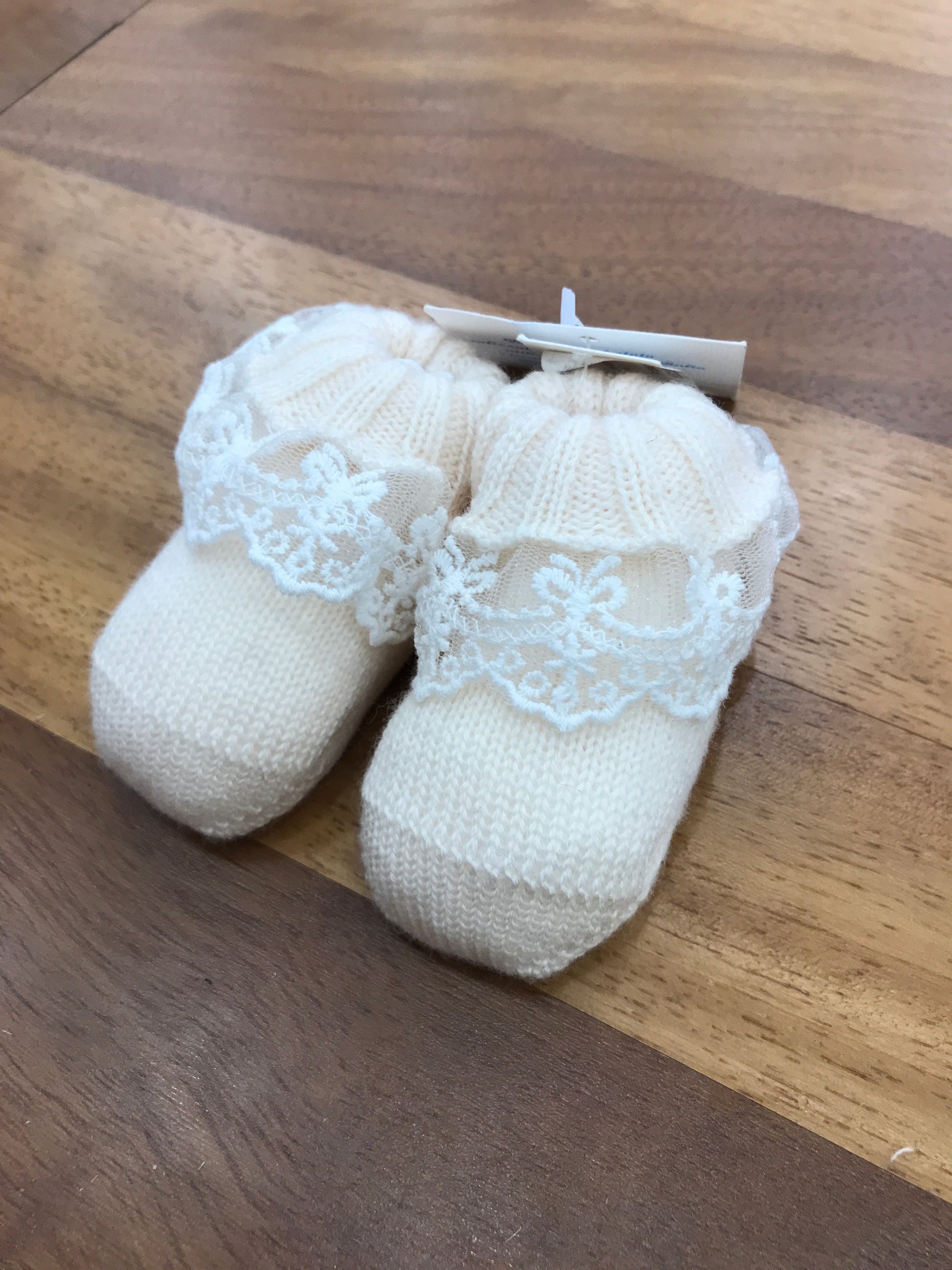 Morbide babbucce color panna realizzate in lana, dotate di un delicato risvolto impreziosito da un elegante merletto.