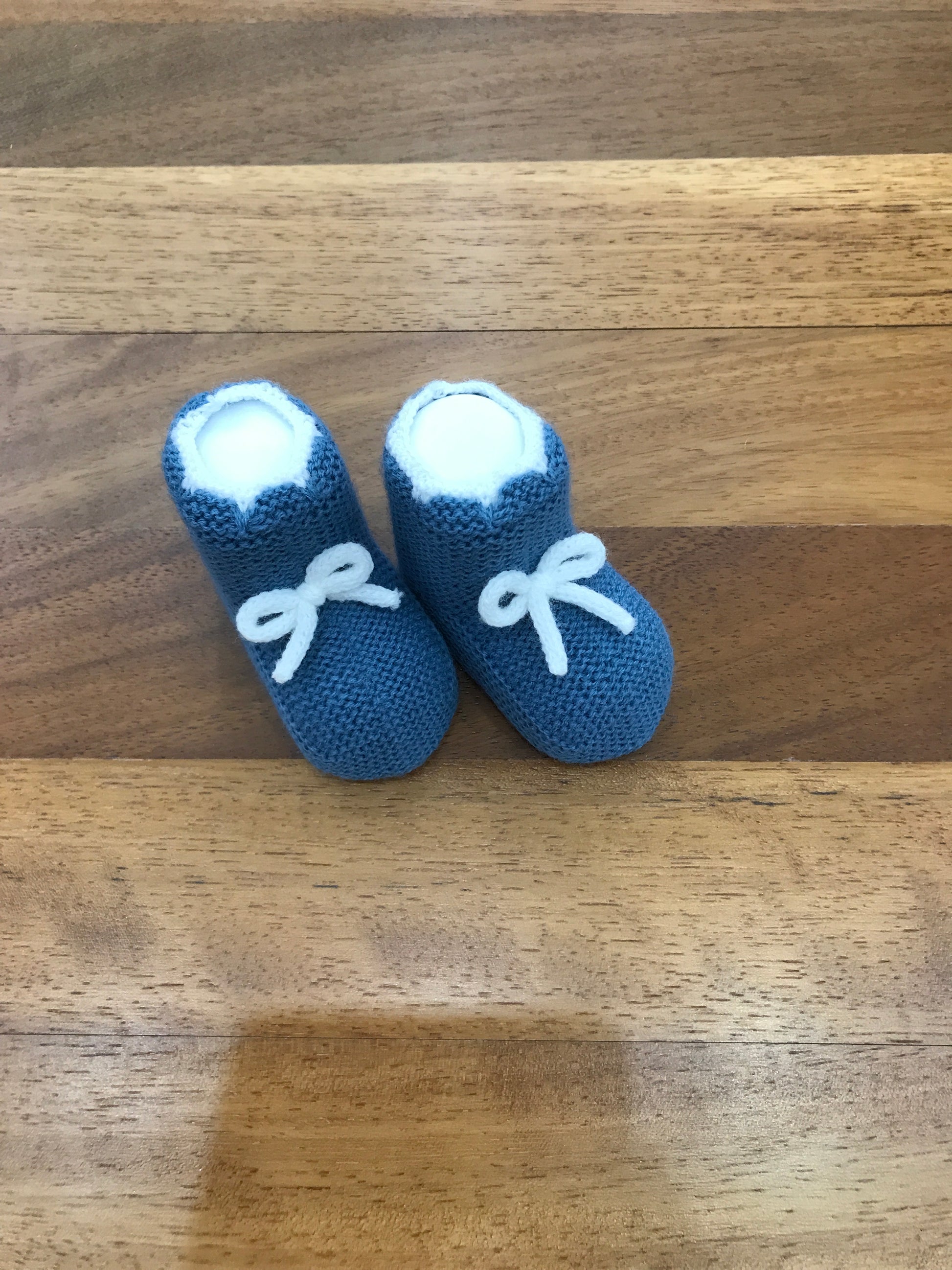 Babbucce color petrolio caratterizzate da un delicato ricamo bianco nella parte superiore e un fiocchetto bianco applicato sulla parte frontale.