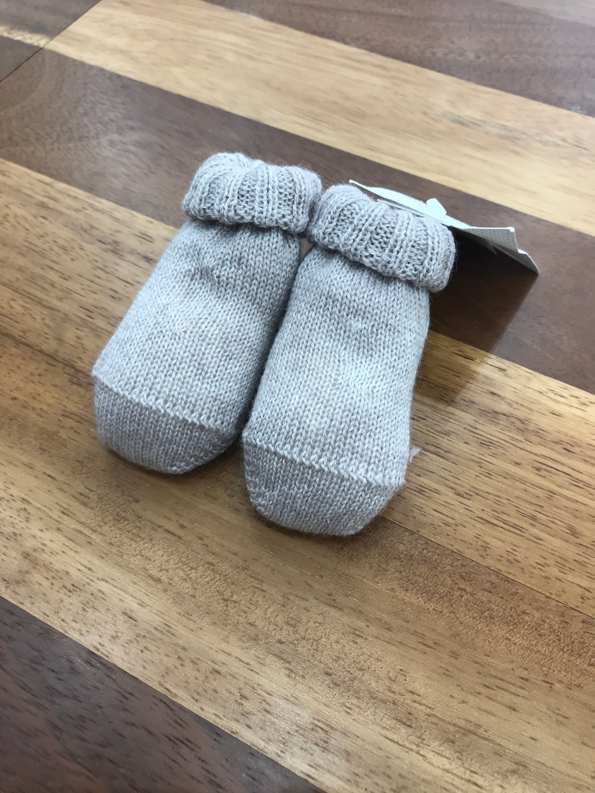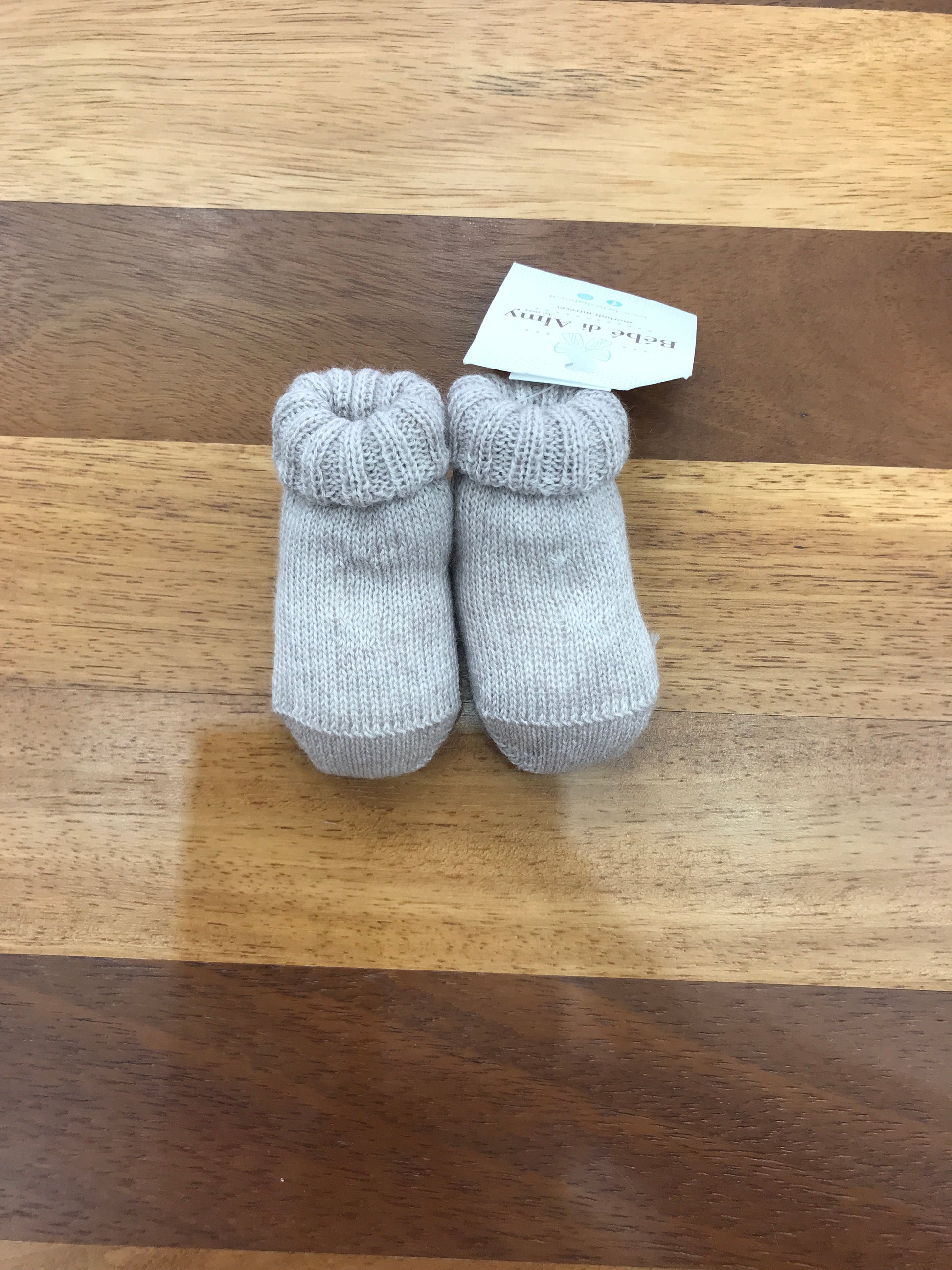 Morbide pantofoline in pura lana vergine nella tonalità tortora, caratterizzate da un delicato risvolto coordinato che esalta la semplicità del design monocromatico. Ideali per mantenere i piedini del neonato al caldo con massima traspirabilità, queste babbucce combina praticità e eleganza senza tempo.