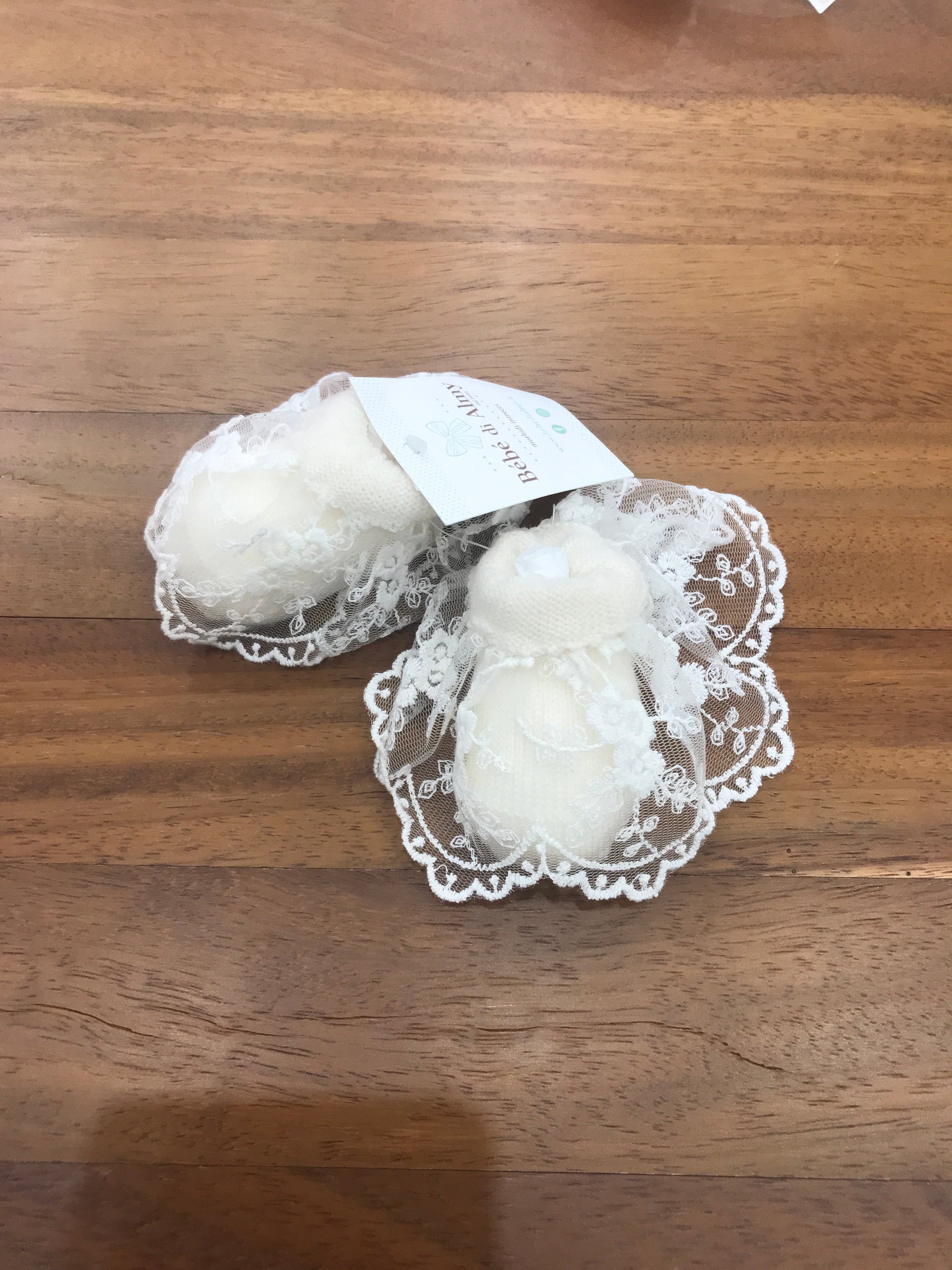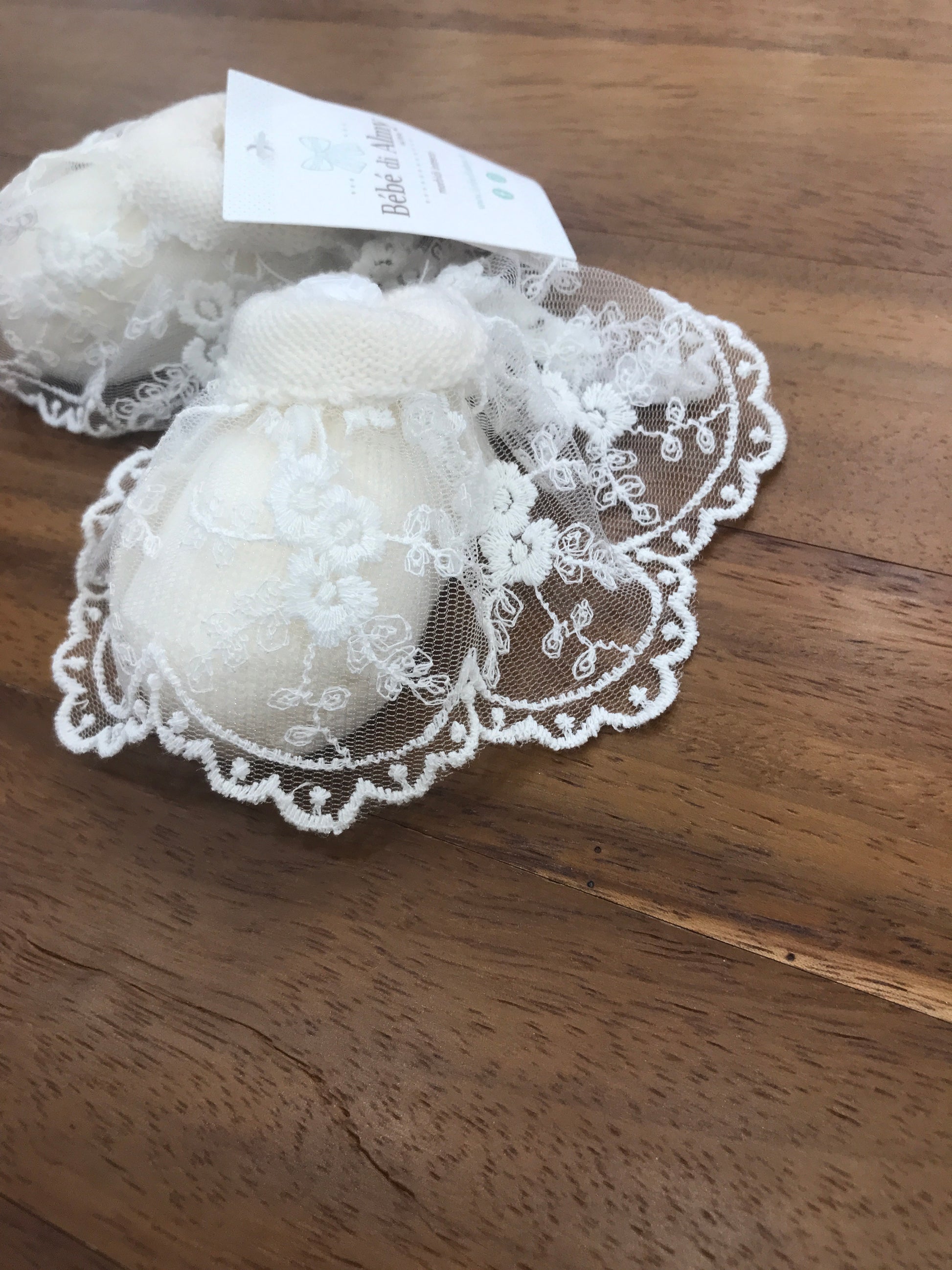 Queste babbucce in lana presentano un risvolto elegante e sono interamente decorate con un delicato merletto ricamato, che avvolge completamente la calzatura.