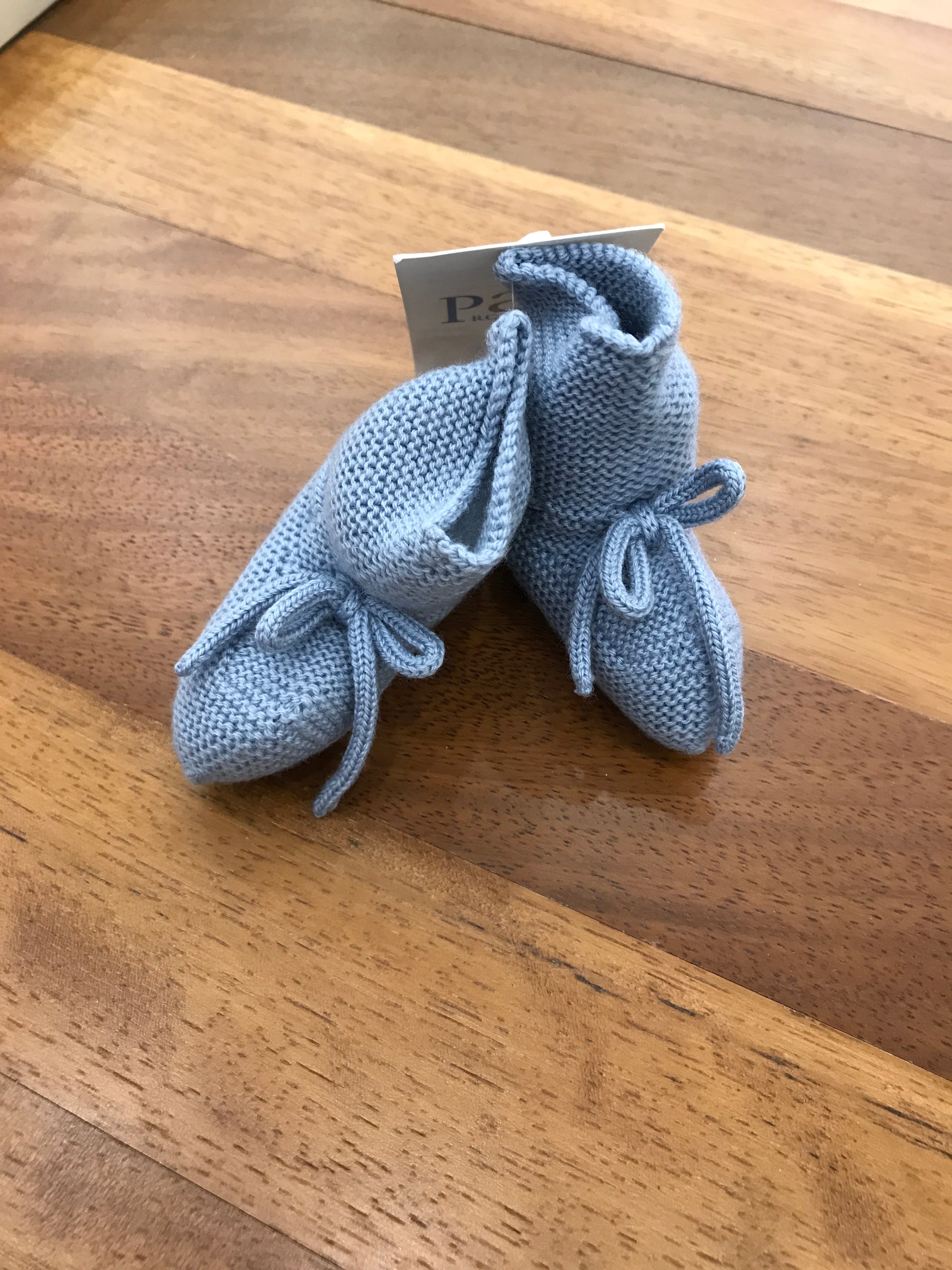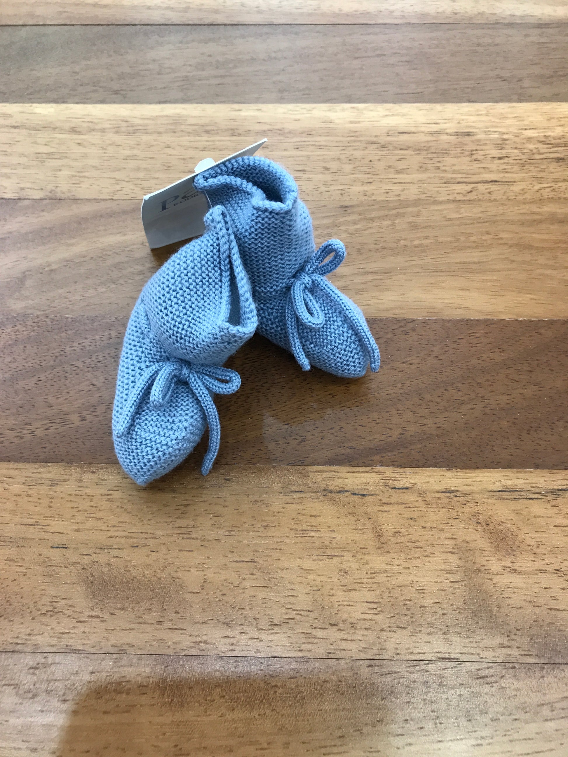 Babbucce in lana tinta avio, caratterizzate da un design sobrio, arricchite da un sottile passanastro e un delicato fiocchetto.