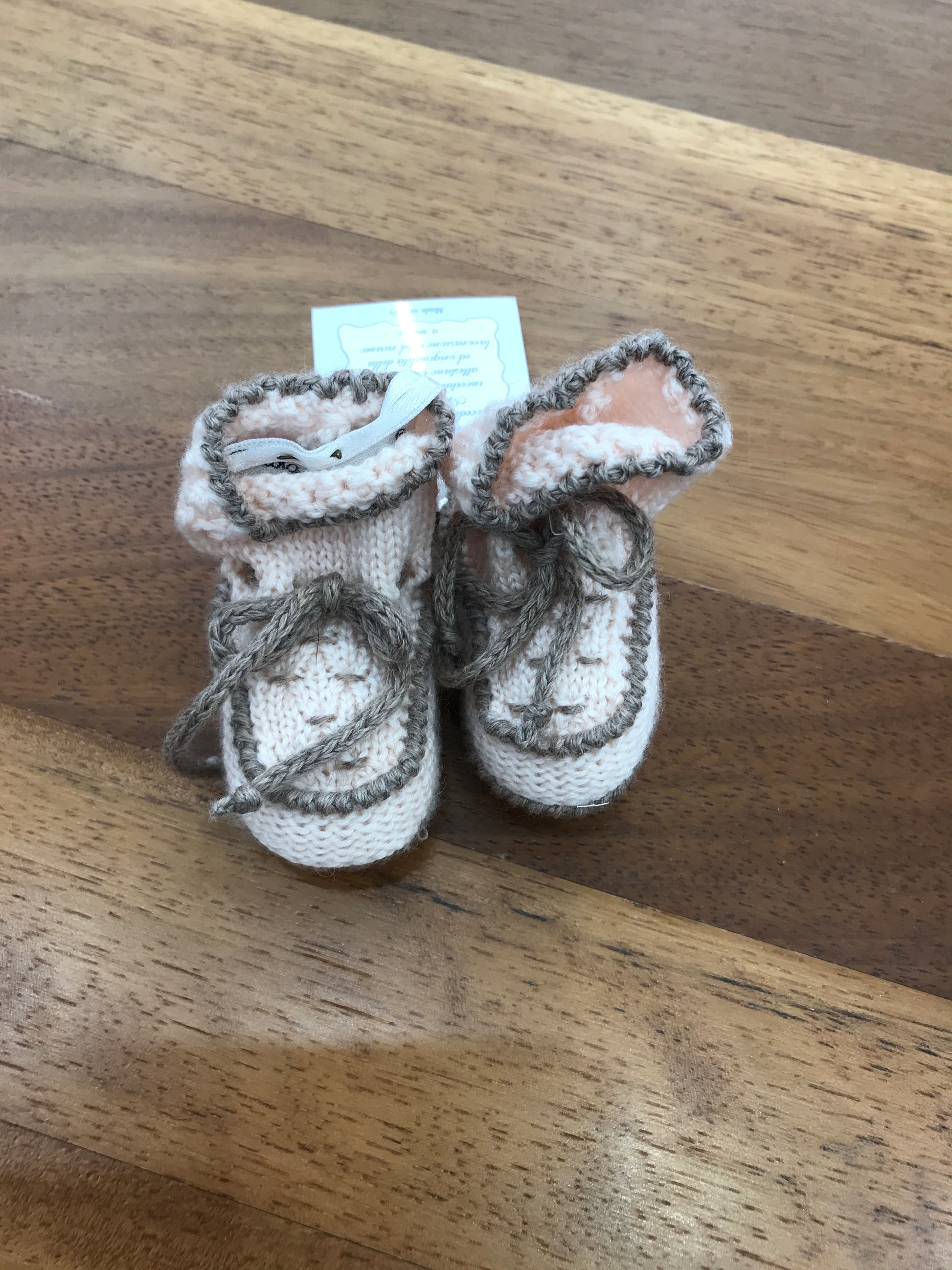 Realizzate in lana pura, queste babbucce si presentano nei toni rosa e tortora, impreziosite da un piccolo fiocco tortora sul davanti e da un elegante punto smock.