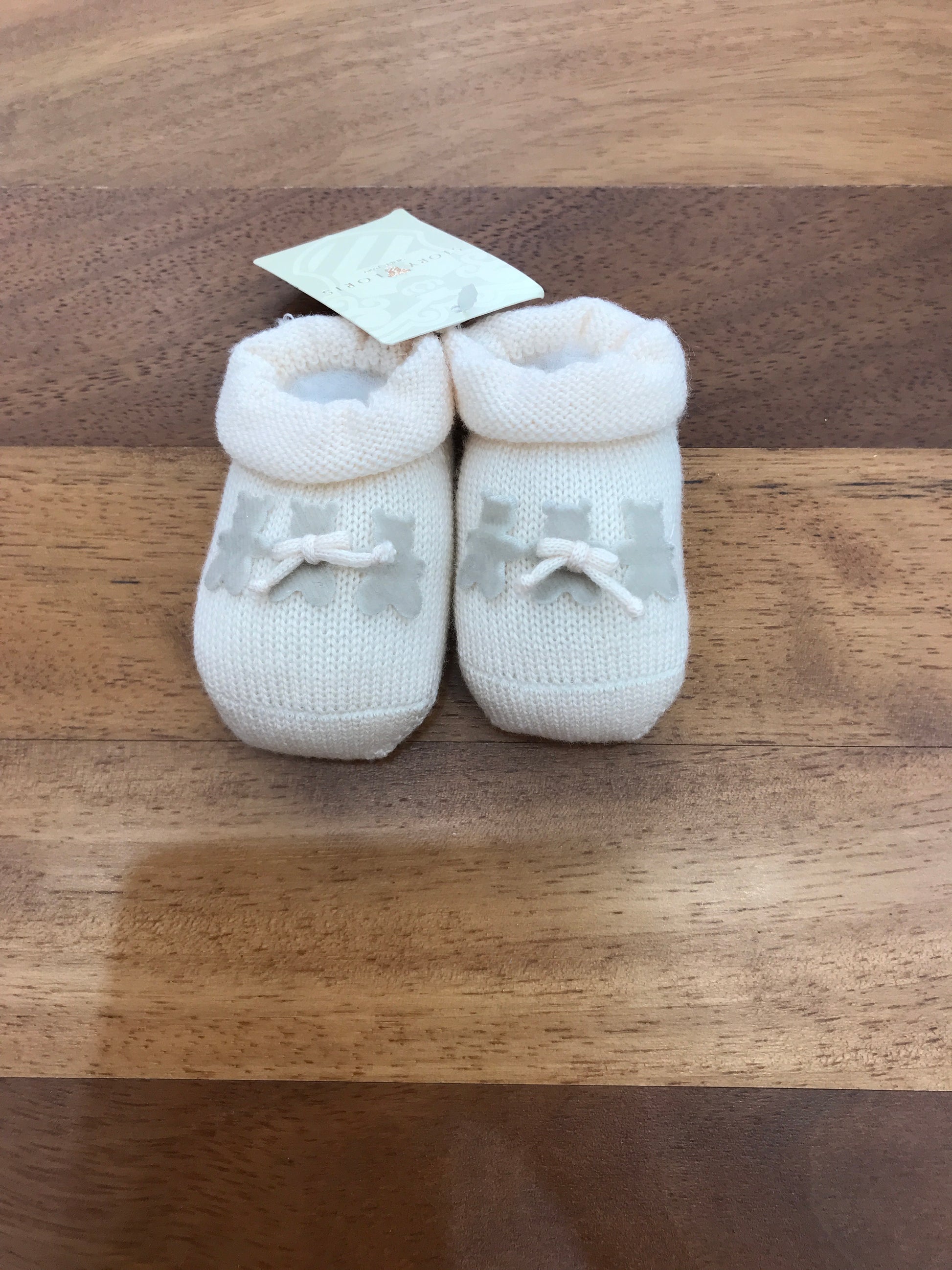 Morbide babbucce in lana color panna, dotate di risvoltino e decorate sul davanti da tre orsetti in velluto.