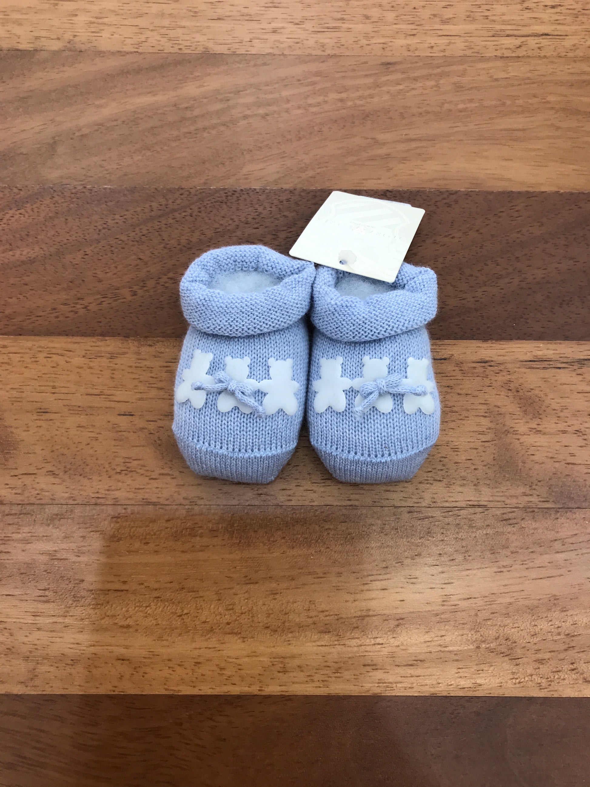 Morbide babbucce celesti in lana, decorate frontalmente con tre orsetti in velluto applicati, pensate per garantire comfort e stile ai più piccoli.