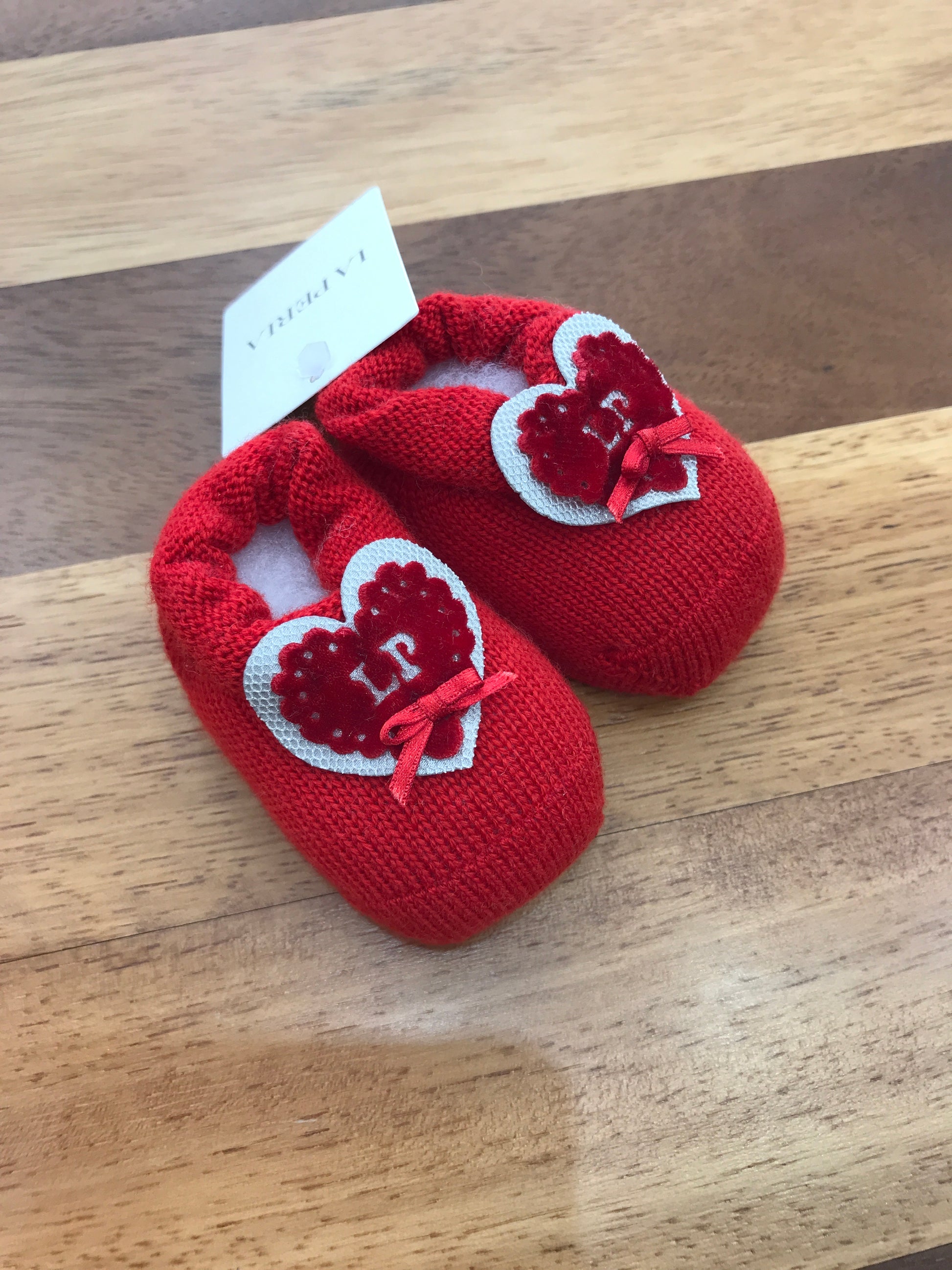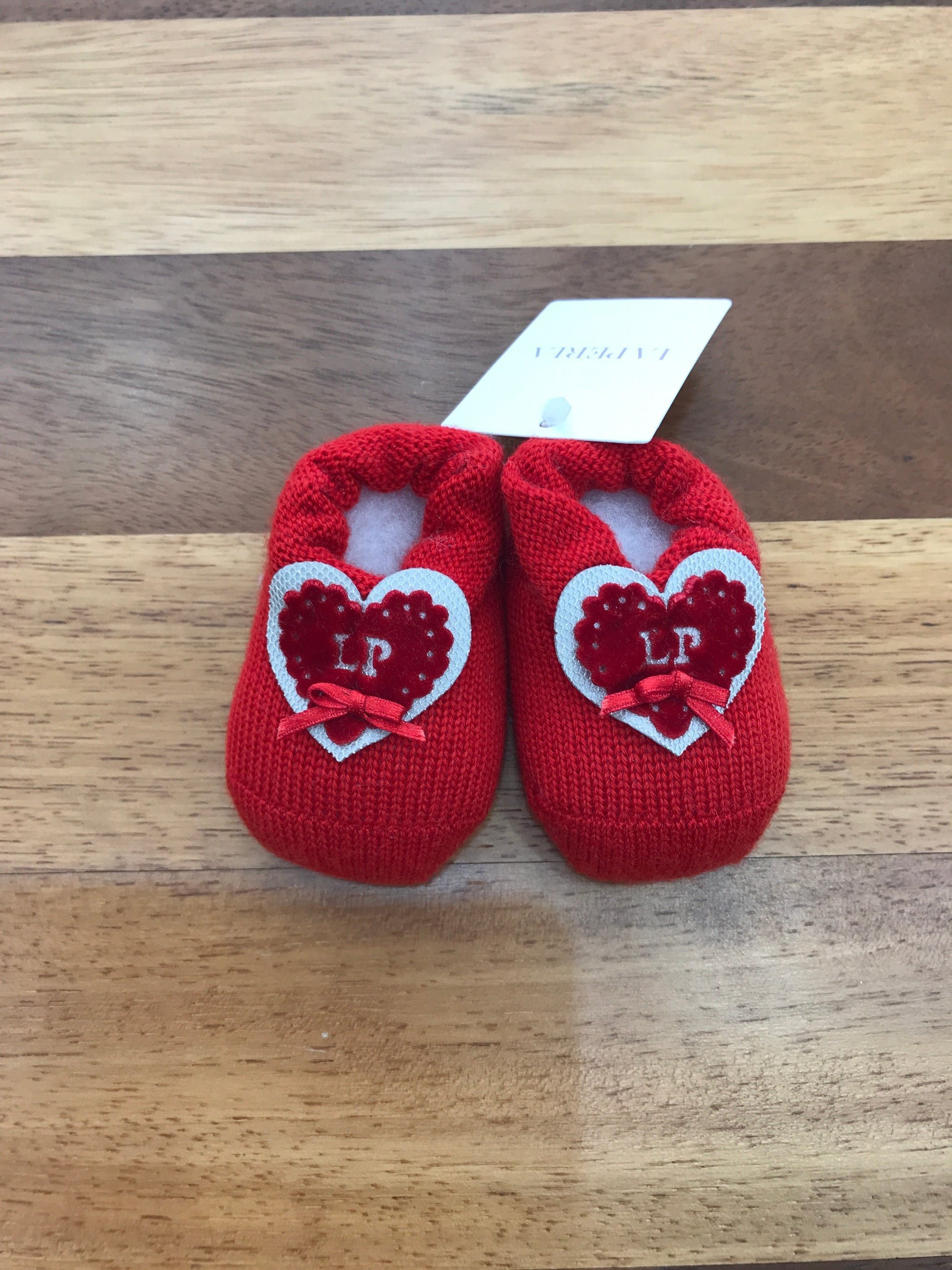 Eleganti babbucce in pura lana rossa, caratterizzate da un delicato risvolto e impreziosite da cuori in velluto applicati su ambedue le scarpe. Un dettaglio raffinato che combina comfort e stile, perfetto per momenti di relax in casa con un tocco di eleganza.
