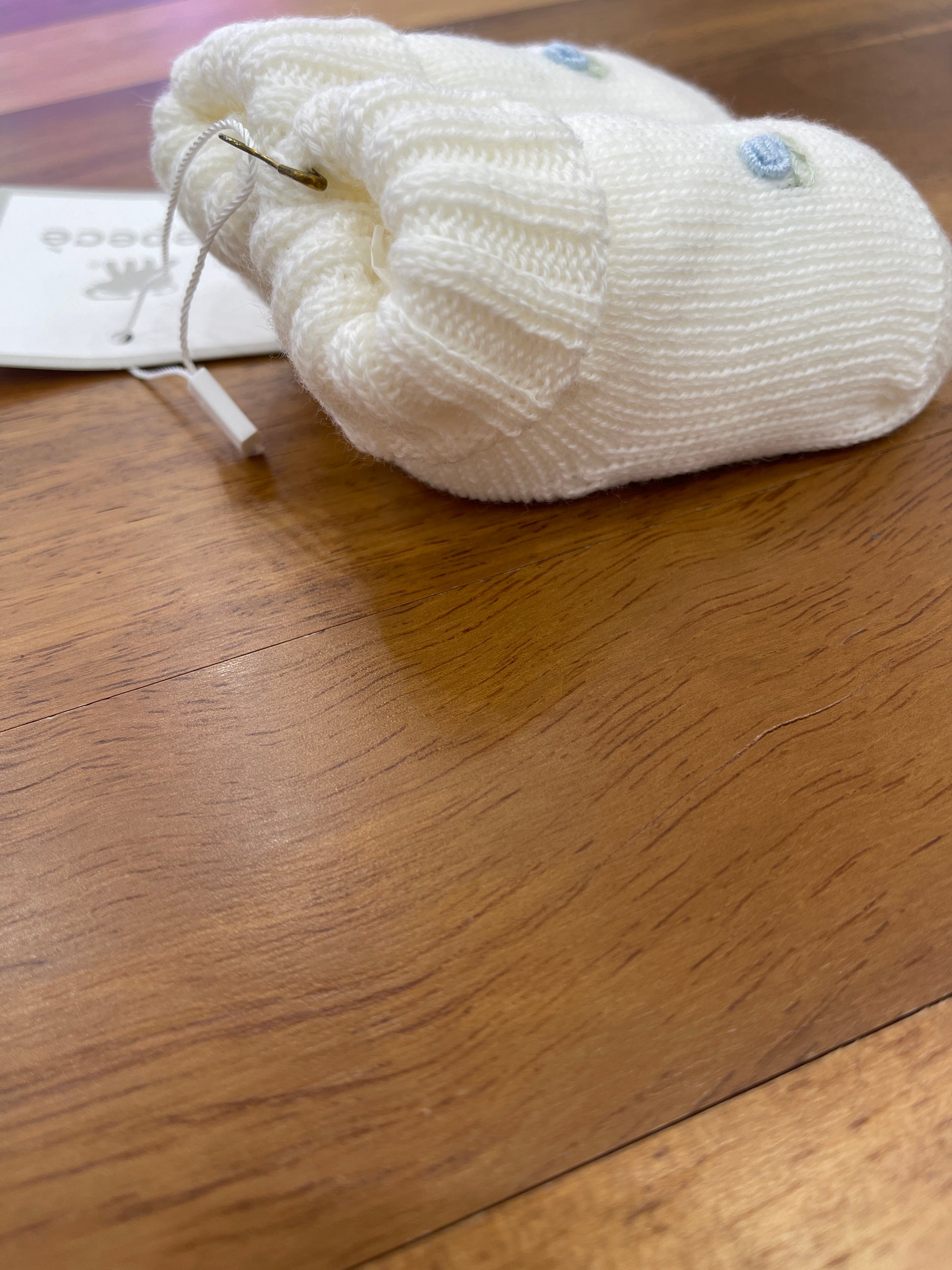 Morbide babbucce in lana color panna, caratterizzate da un piccolo risvolto e decorate al centro sul davanti con una delicata rosa azzurra ricamata.
