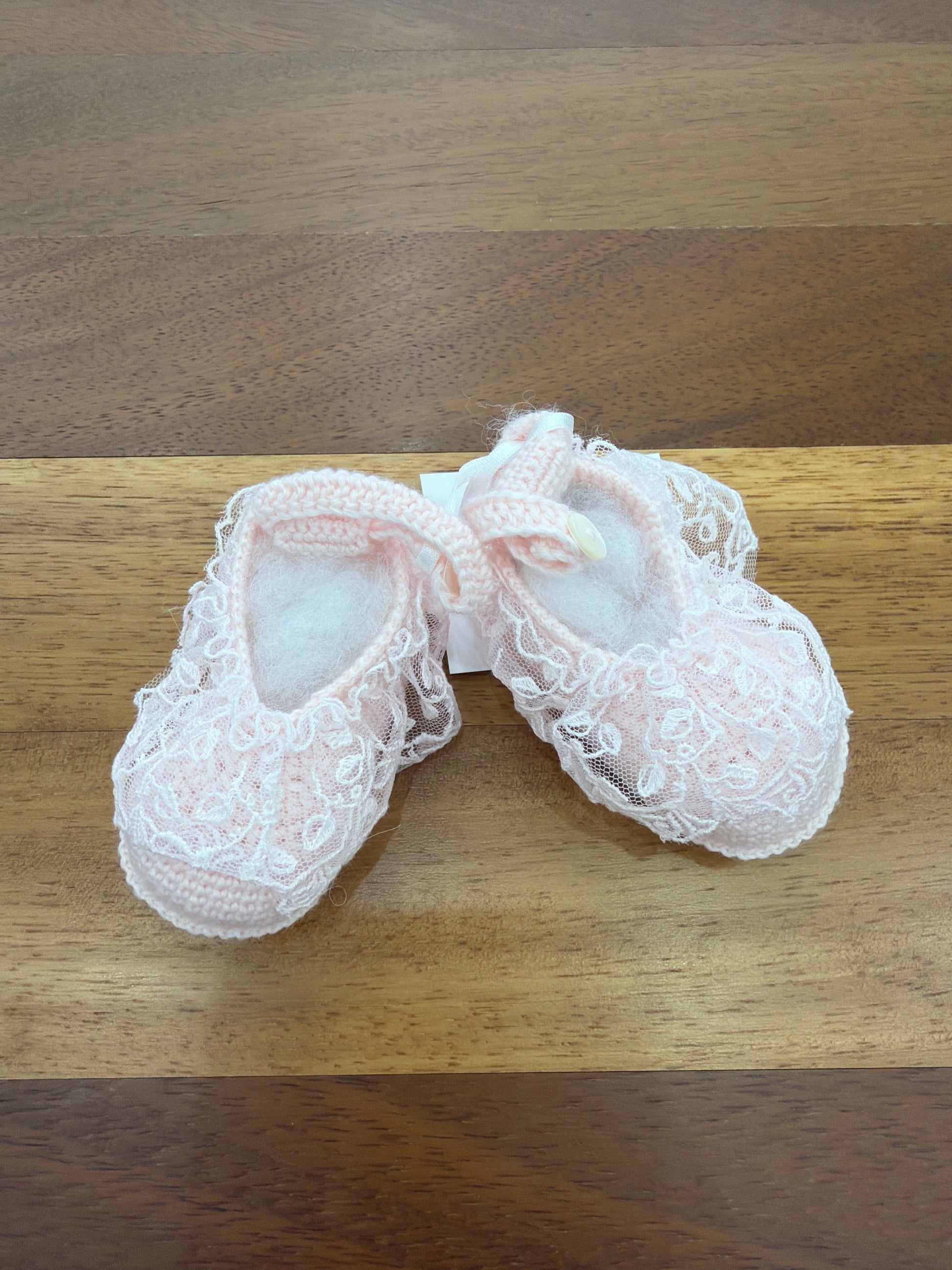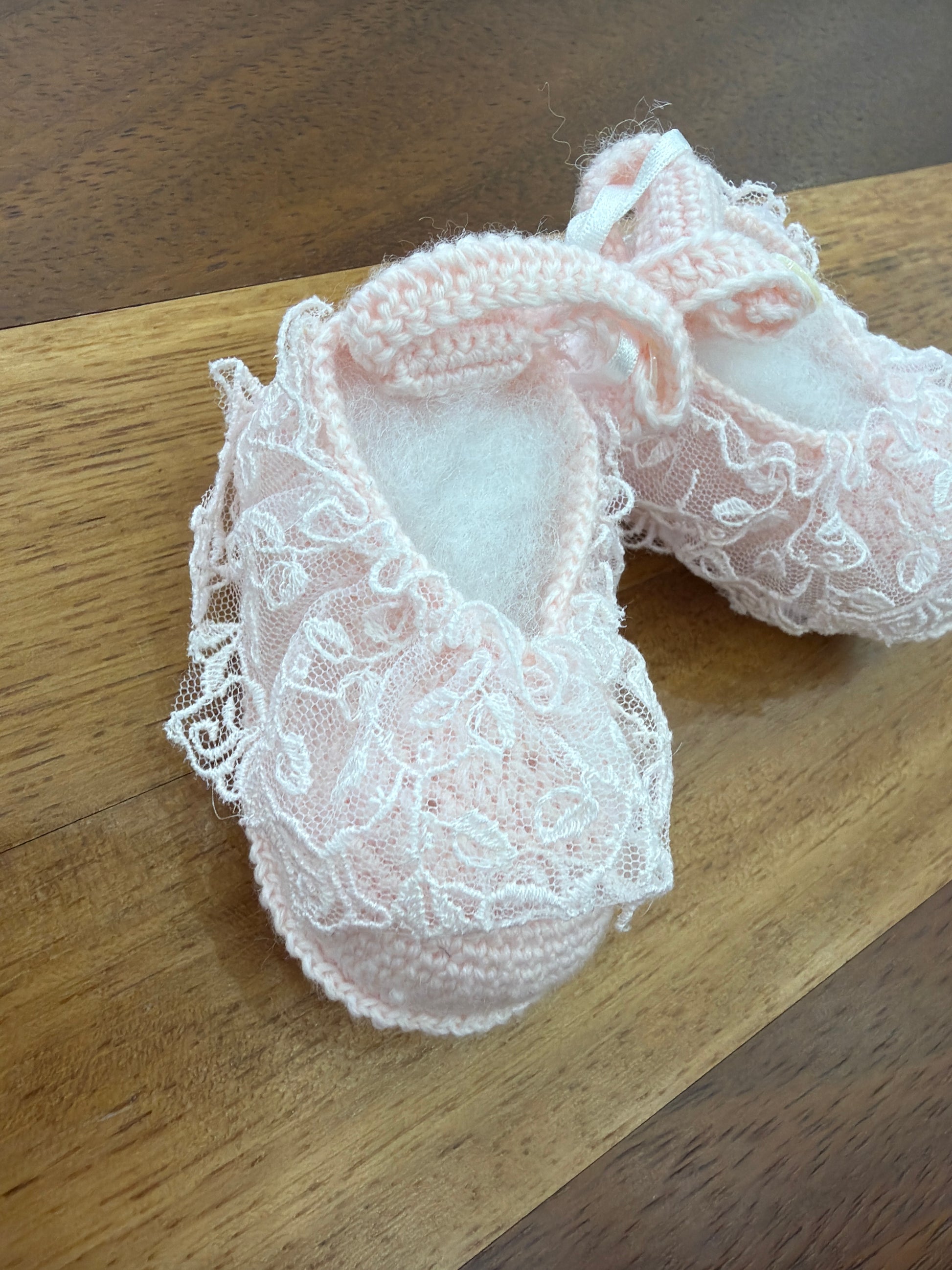 Morbidissime babbucce rosa realizzate in lana, decorate con un delicato pizzo finemente lavorato che incornicia interamente la calzatura.