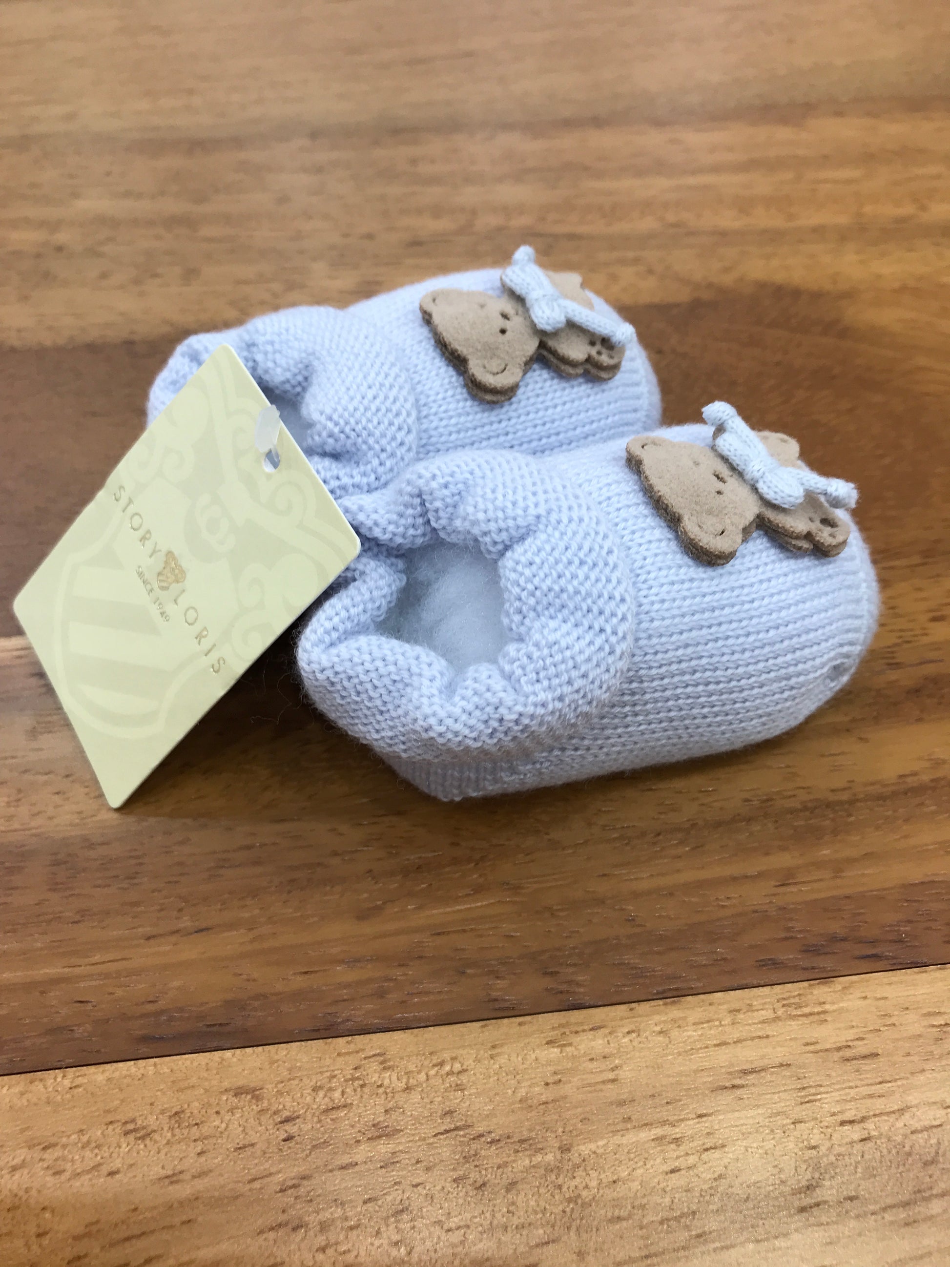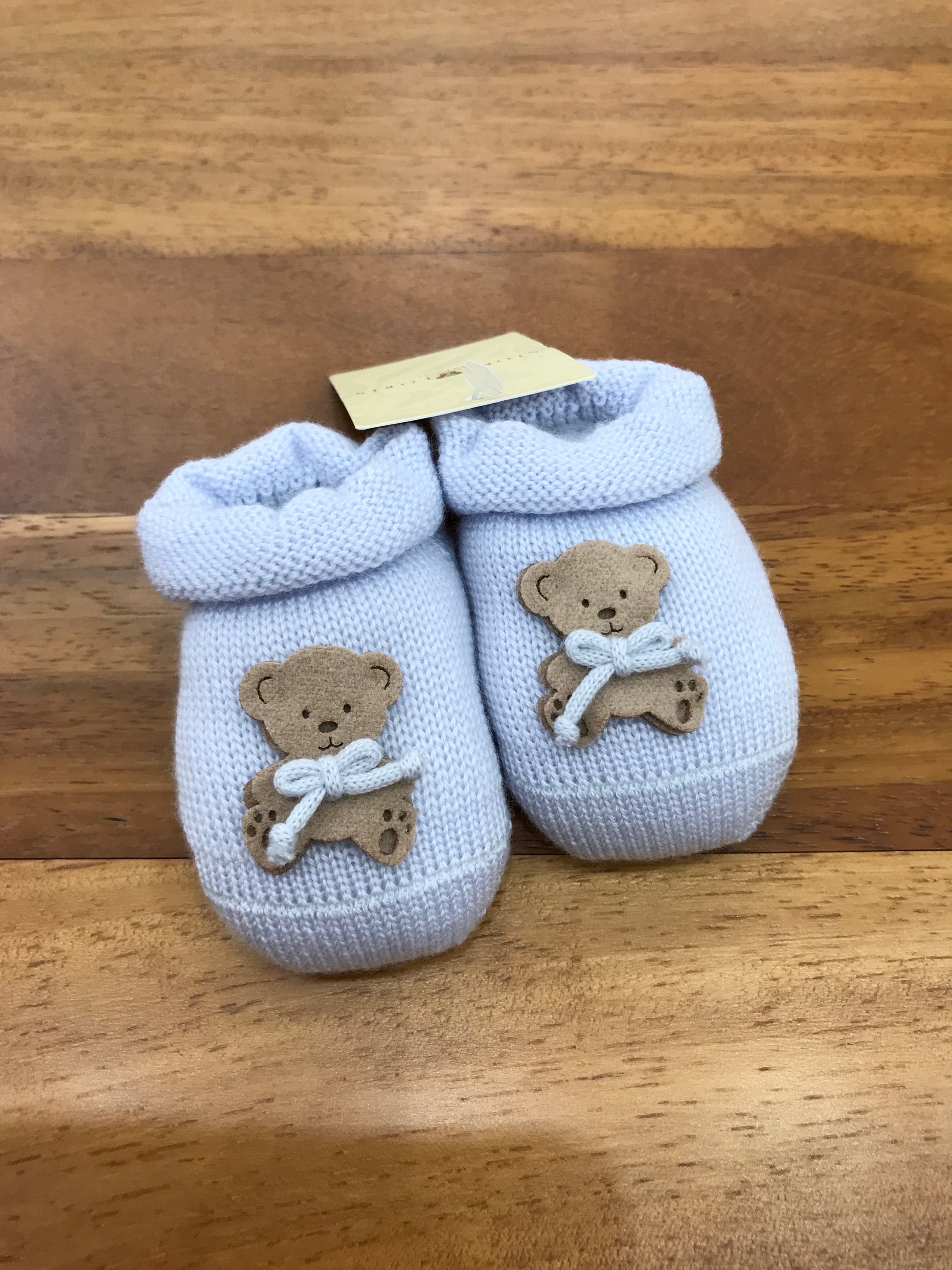 Queste babbucce in lana presentano un piccolo risvolto e sono decorate con un orsetto in rilievo sulla parte anteriore.