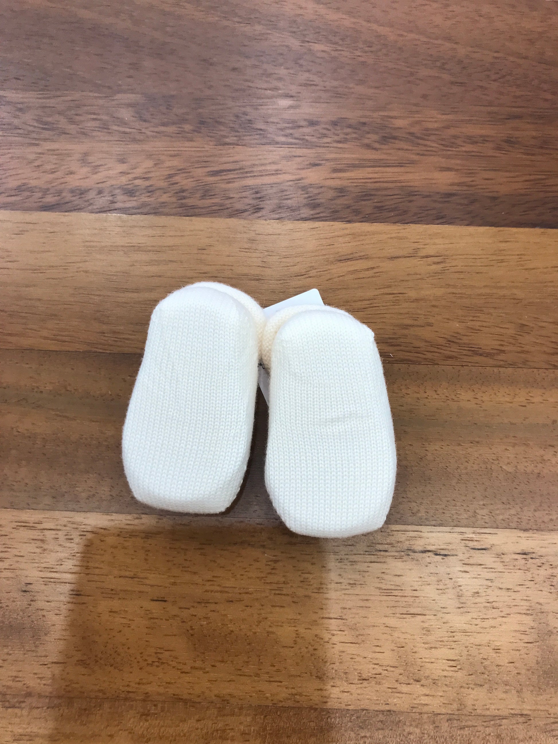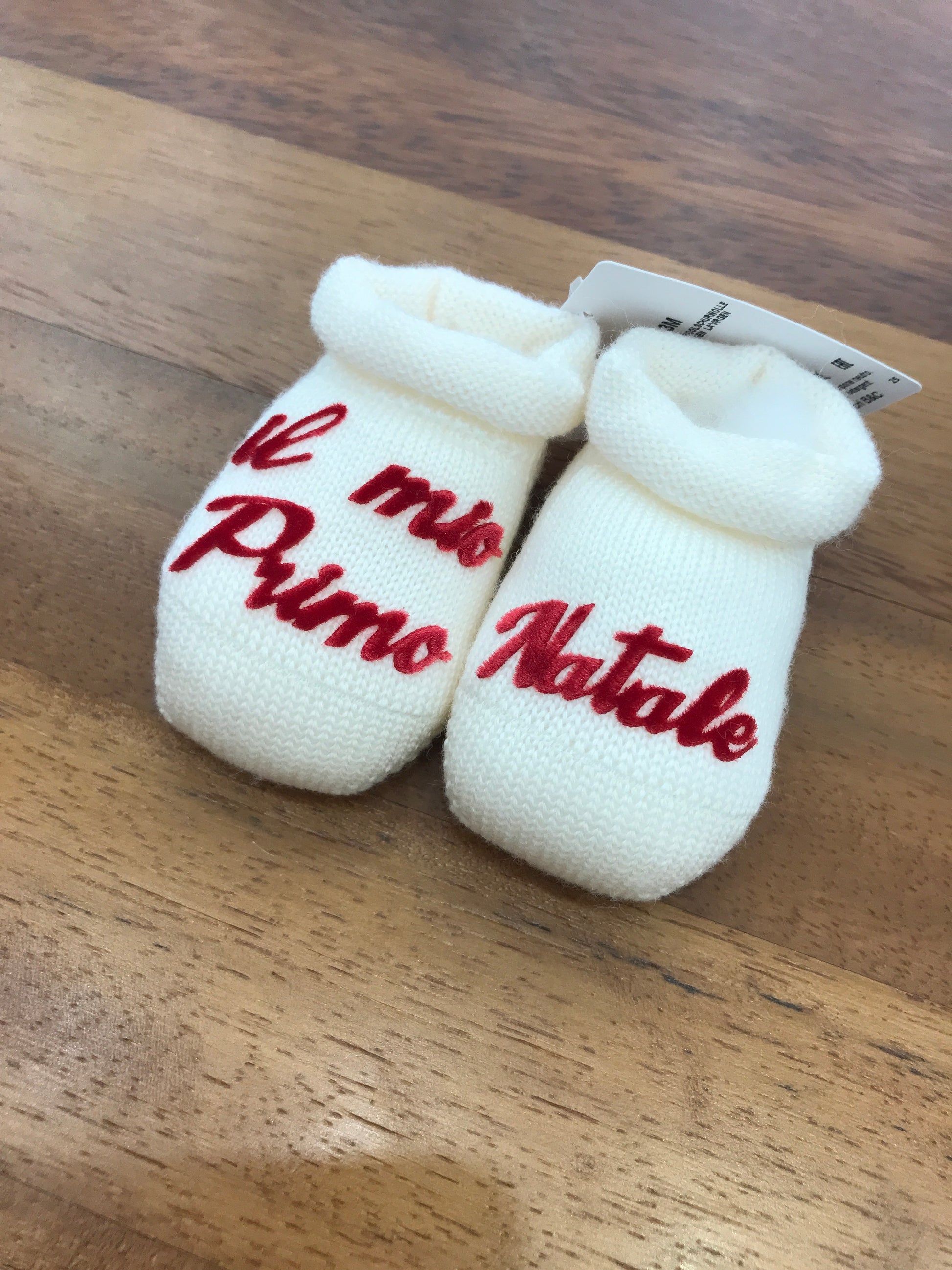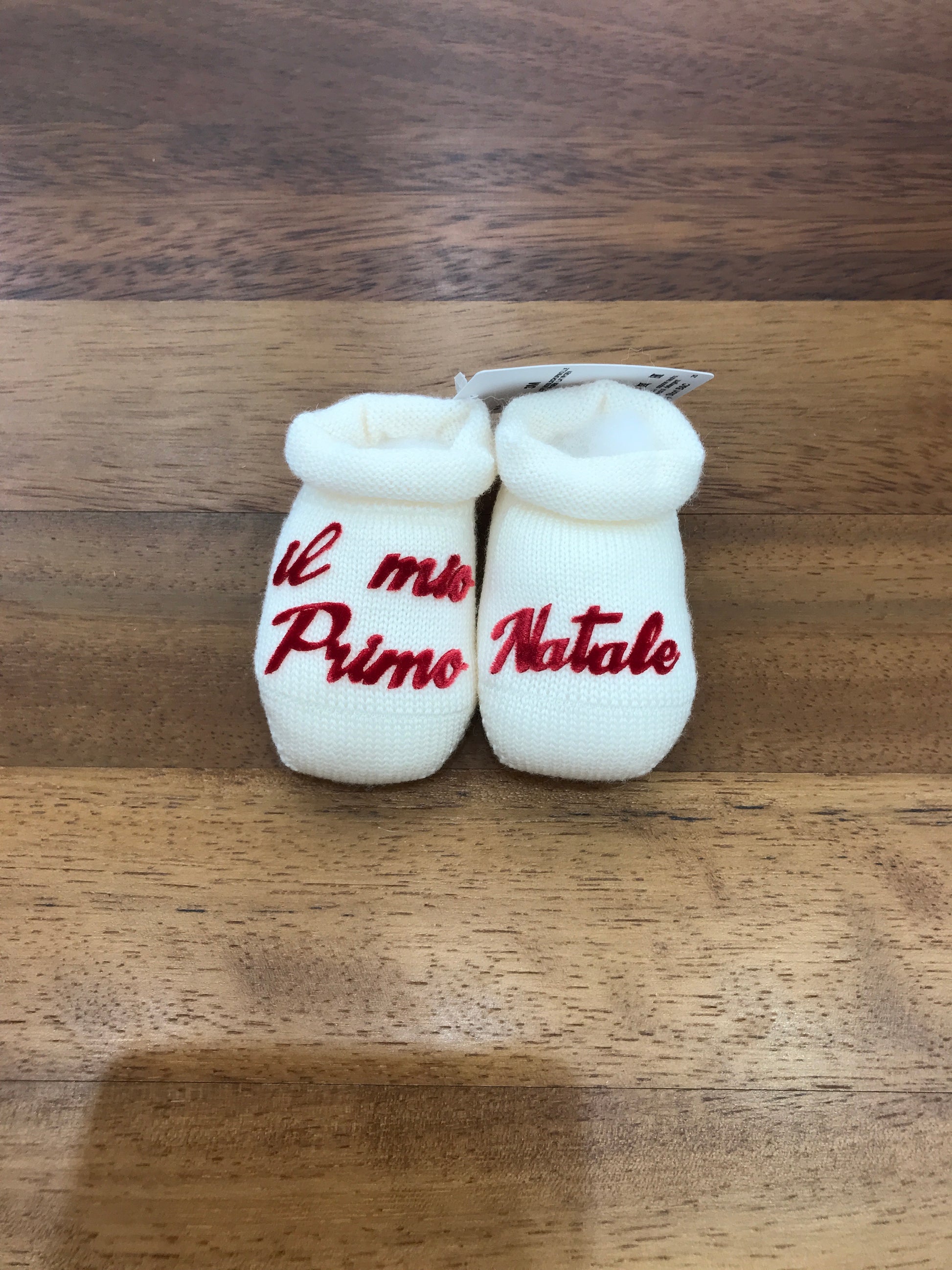 Scarpina realizzata in lana morbida, arricchita da un piccolo risvoltino che ne enfatizza il design. Sul davanti è applicata una decorazione porta con la scritta "il mio primo natale", perfetta per celebrare questo momento speciale con calore e stile.