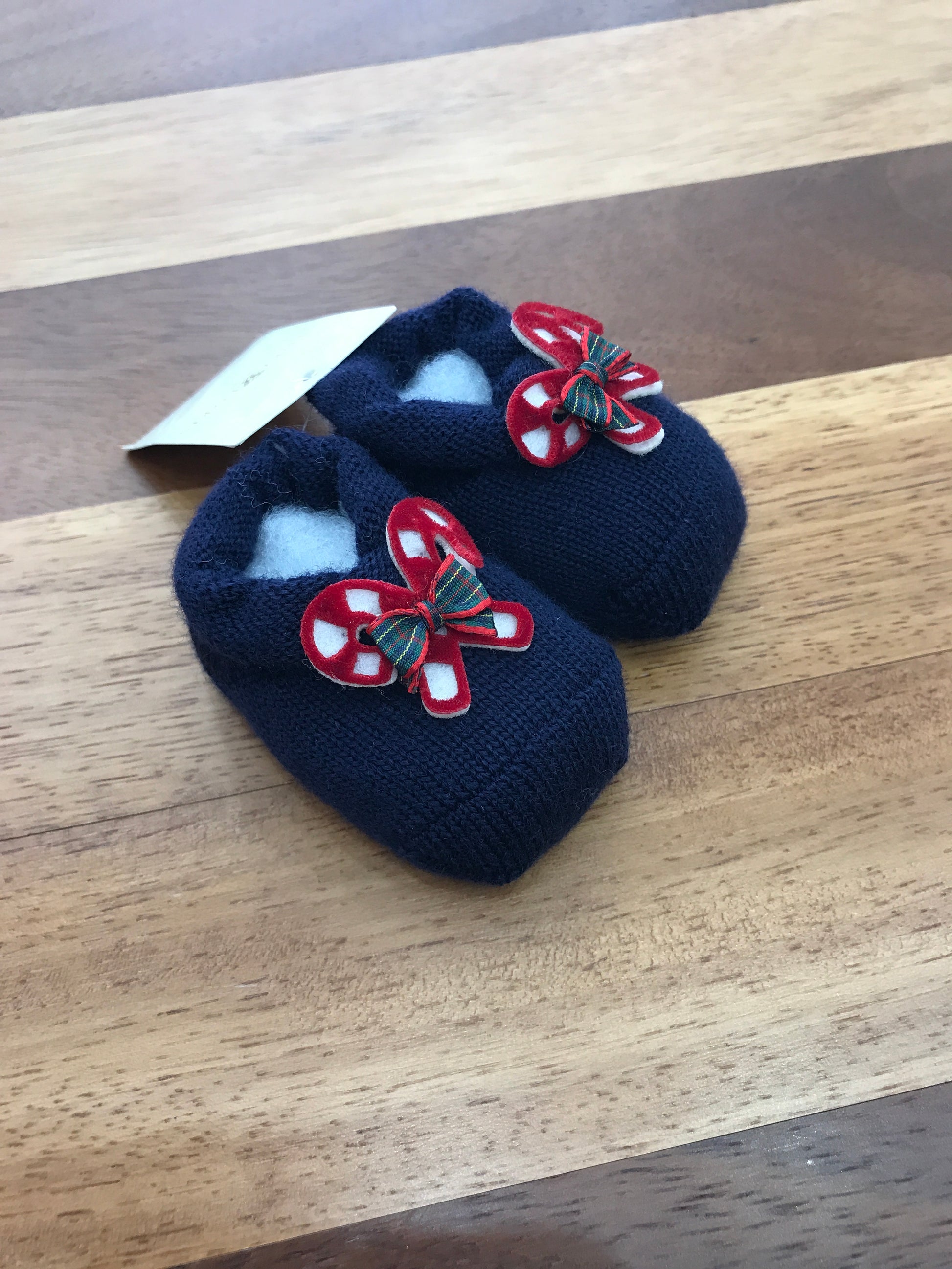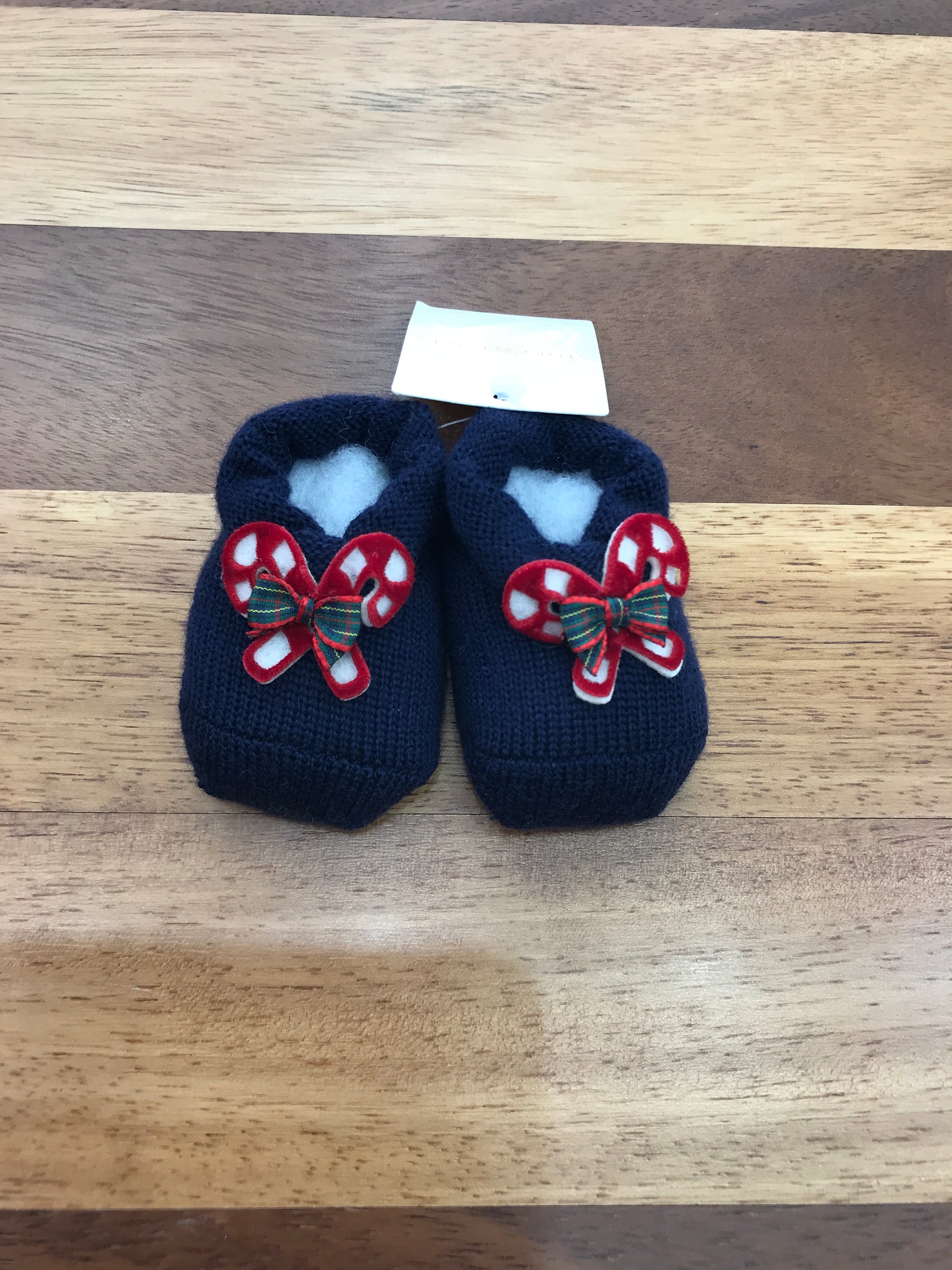 Affascinanti babbucce in lana blu scuro caratterizzate da un delicato risvolto e arricchite da due lecca lecca natalizi applicati sulla parte anteriore. Le scarpine presentano dettagli rossi a tema festivo, perfette per regalare comfort e stile durante le festività. Un accessorio pensato per i più piccoli che unisce praticità e spirito natalizio.