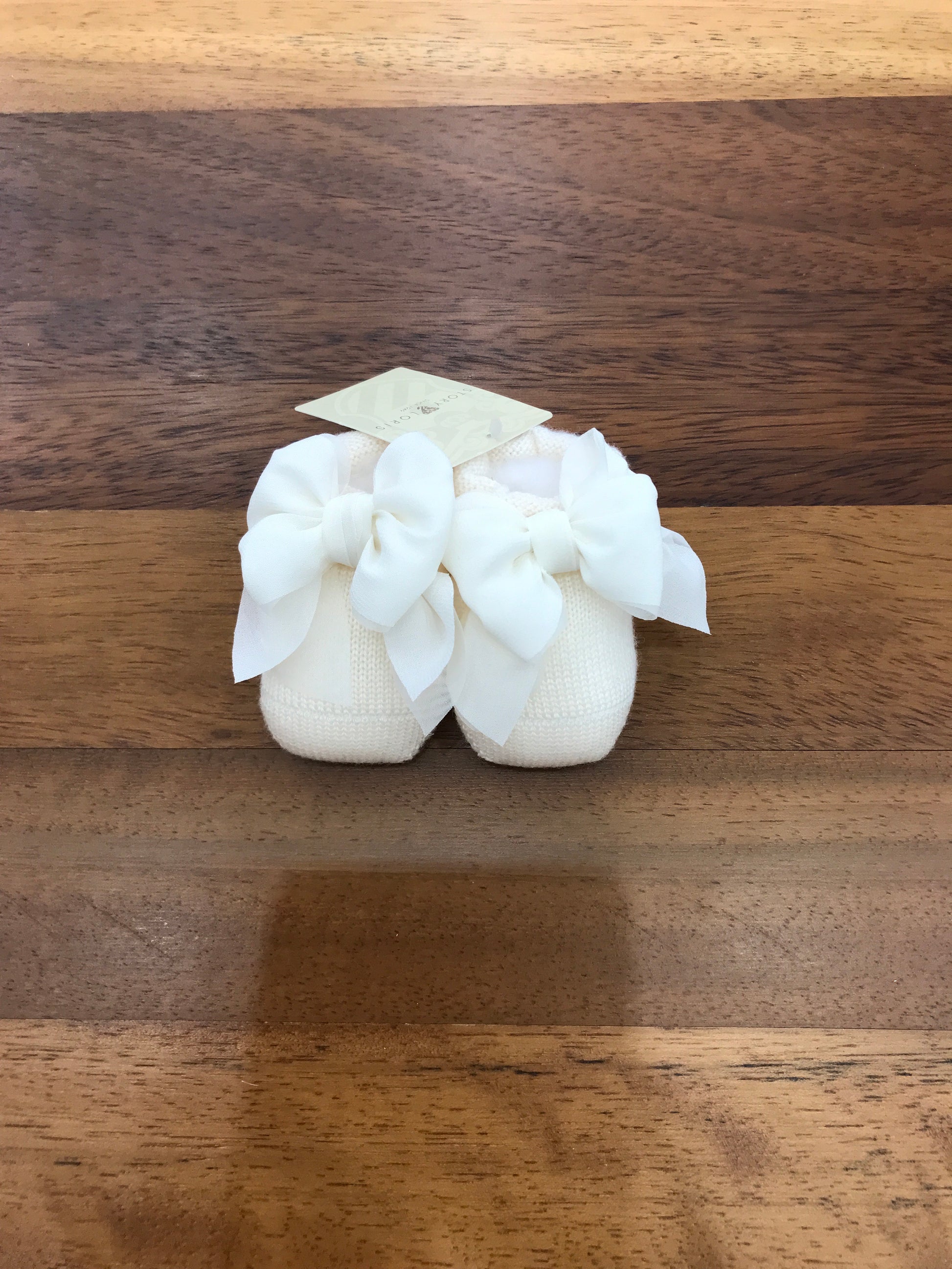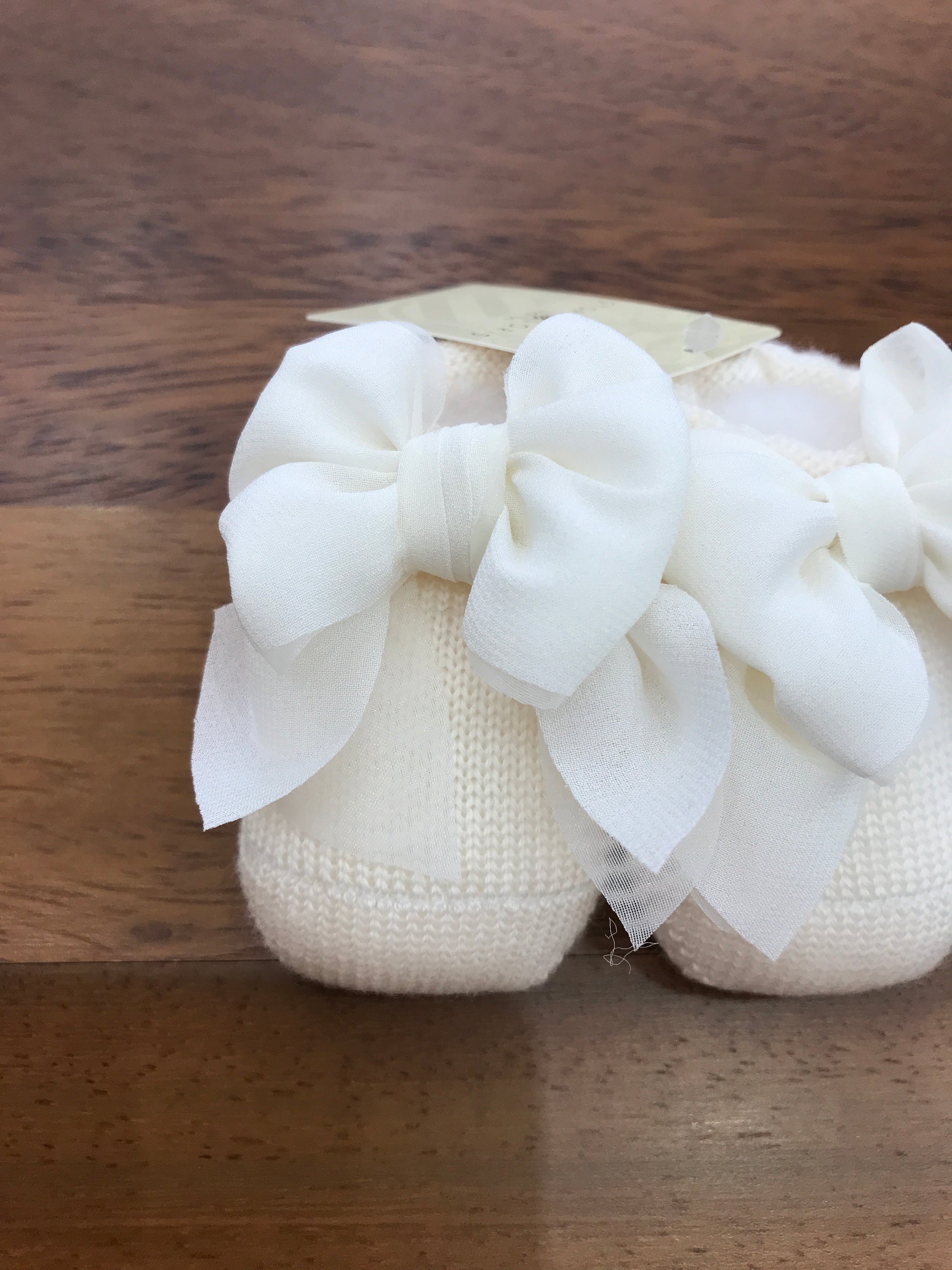 Babbucce realizzate in lana di alta qualità, dotate di un raffinato piccolo risvolto che ne valorizza il design. Sul davanti presentano un’elegante applicazione a forma di fiocco, che aggiunge un tocco di stile e raffinatezza a questo accessorio indispensabile per i più piccoli.