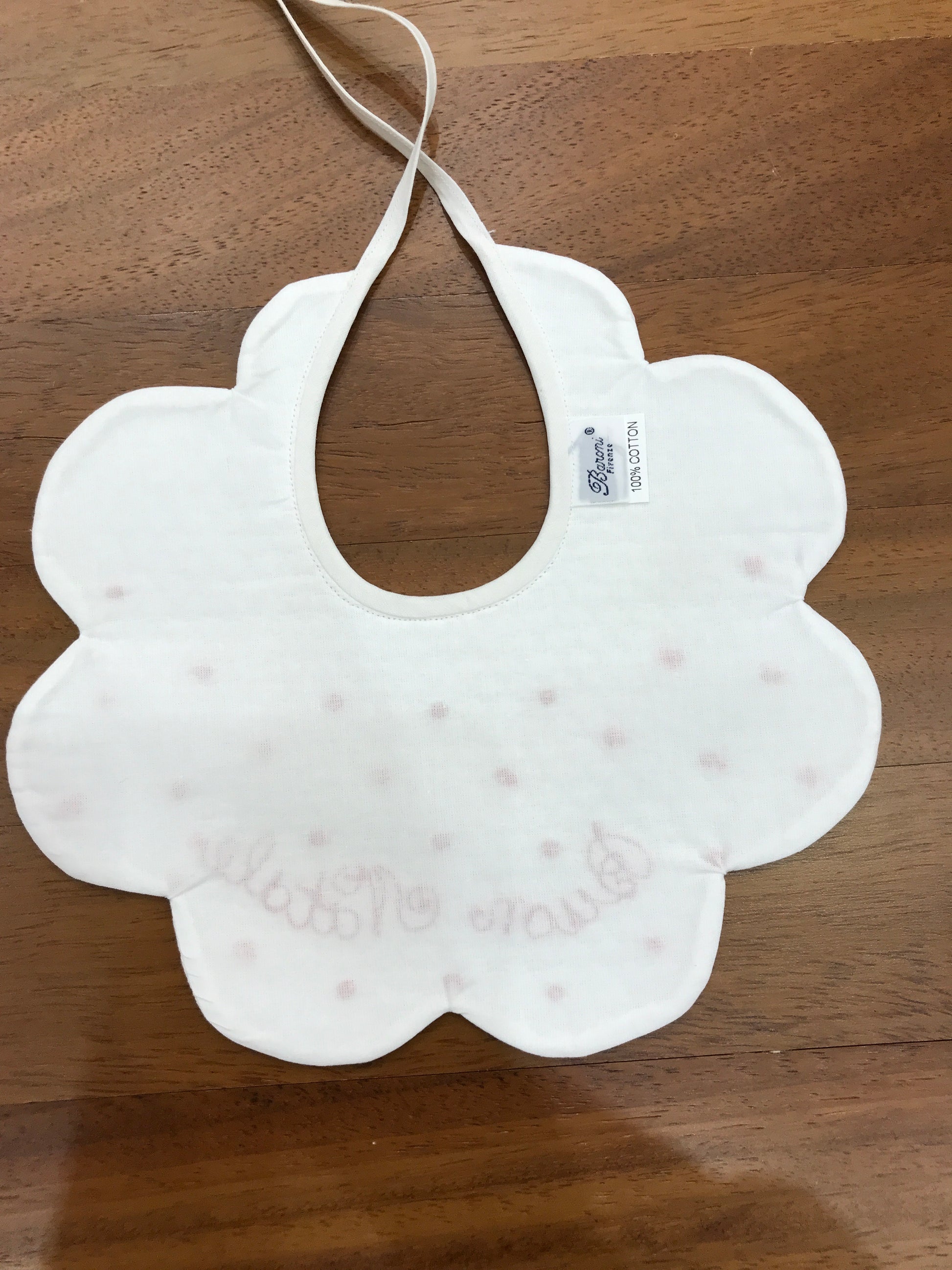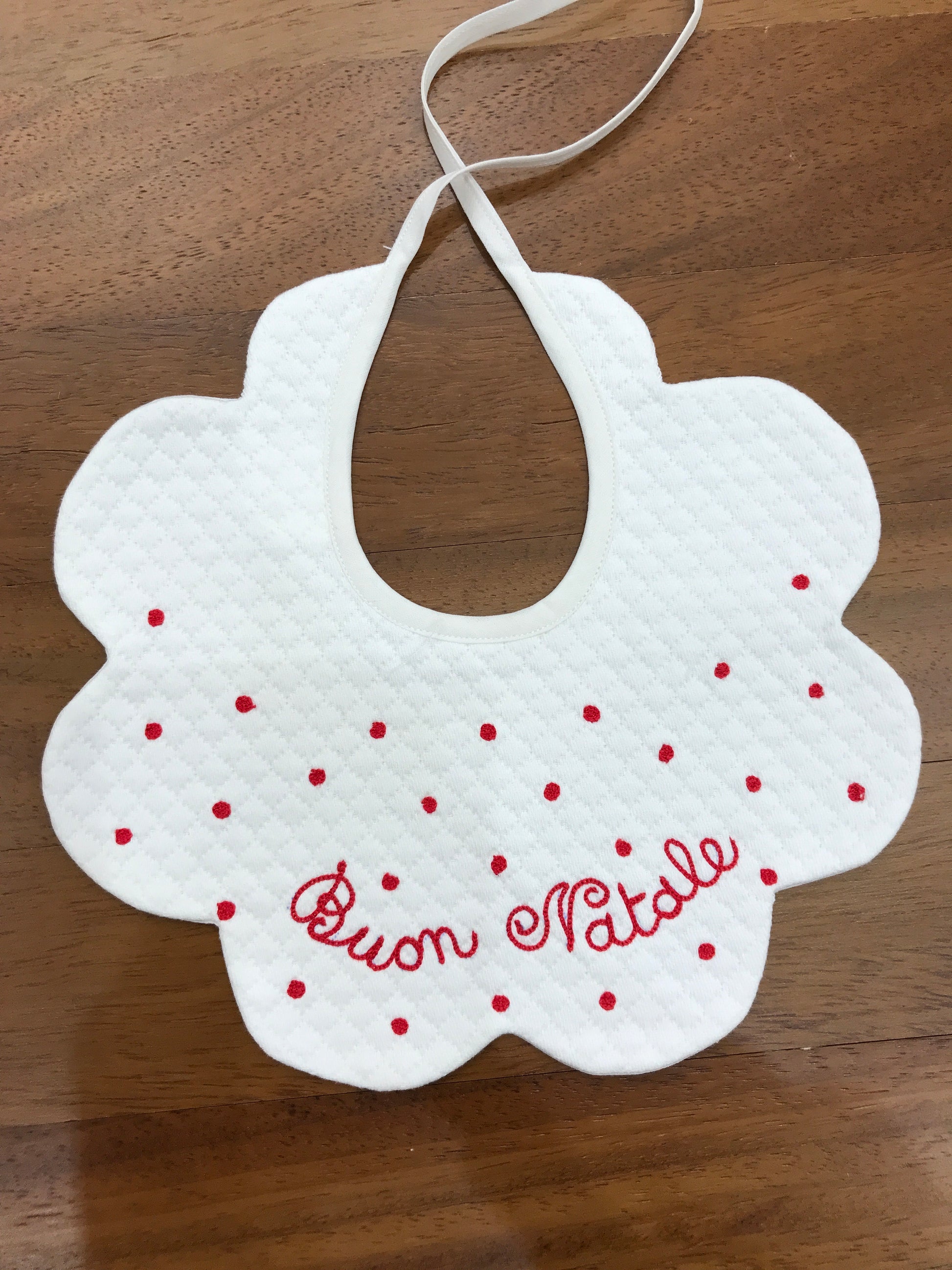 Elegante bavaglino in bianco con raffinata lavorazione smerlata ai bordi, impreziosito da delicati pois rossi e dalla scritta "Buon Natale". Un accessorio sofisticato che combina praticità e stile festivo, perfetto per celebrare le festività con eleganza. Ideale come regalo per i più piccoli durante il periodo natalizio.