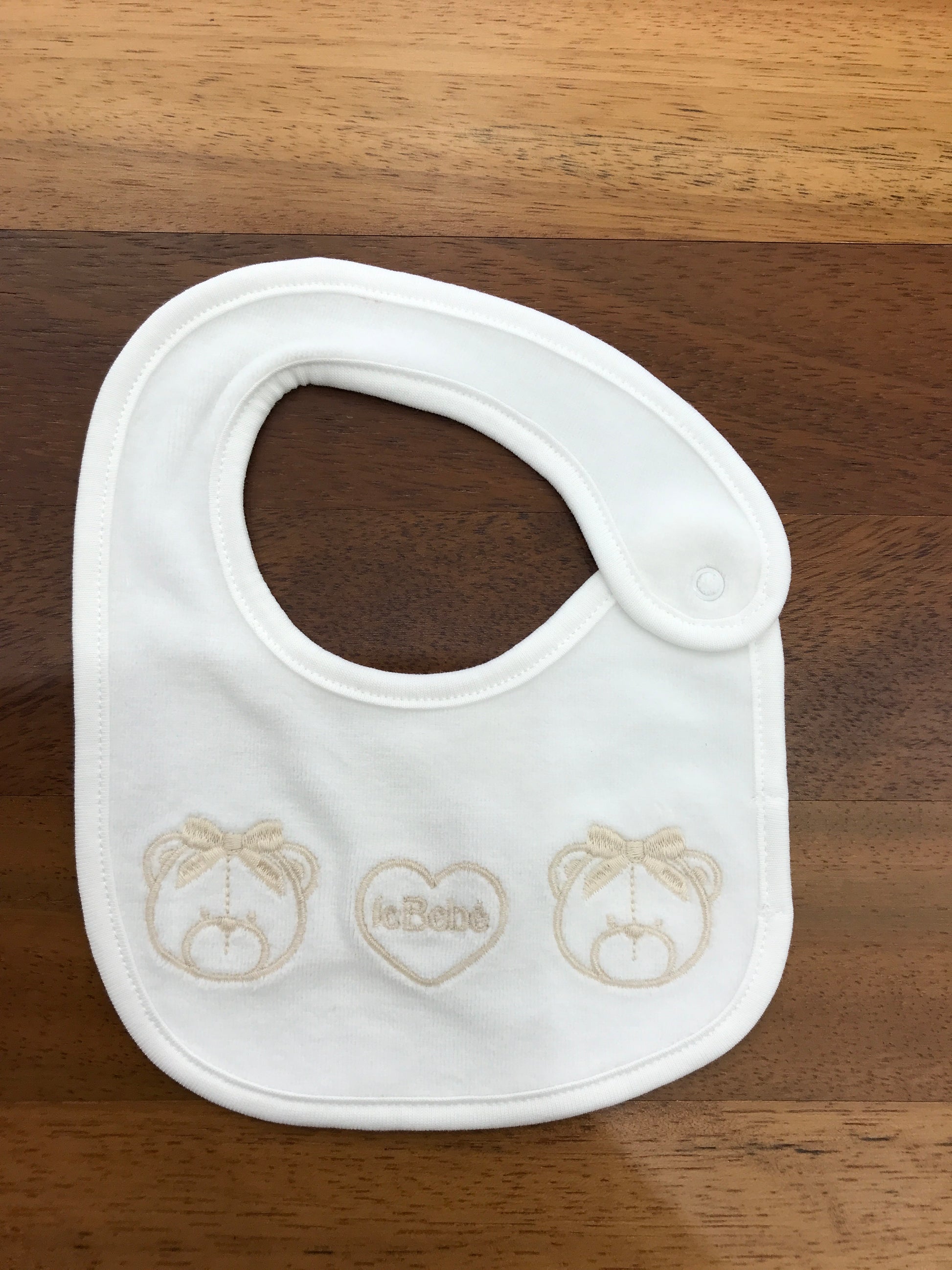 Bavaglino color panna realizzato con cura, impreziosito da delicati ricami sul davanti che raffigurano orsetti e un cuore, ideale per aggiungere un tocco di dolcezza e raffinatezza durante i pasti del tuo bambino.