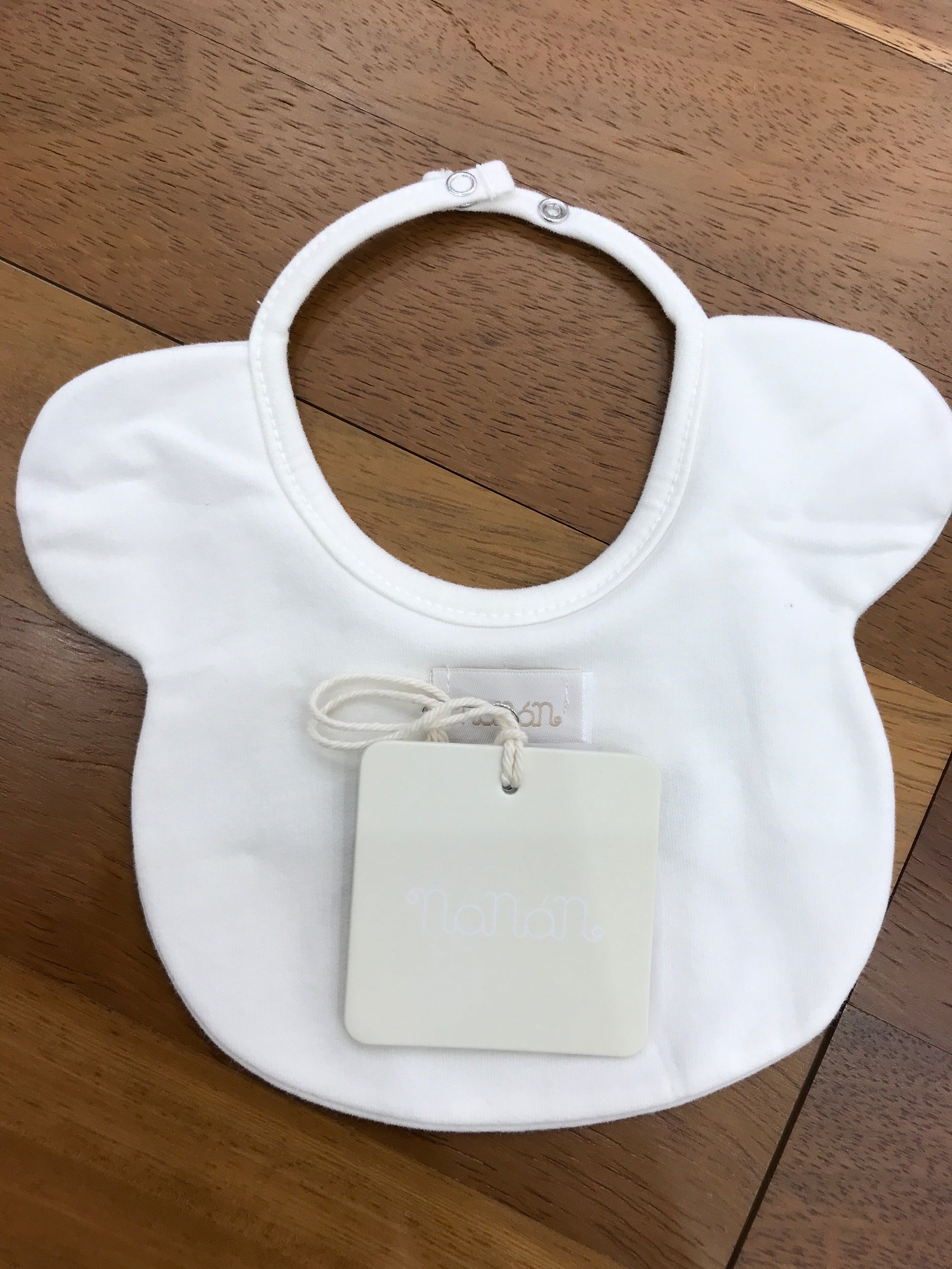 Il bavaglino Nanan presenta una forma originale a orsetto, arricchita da un ricamo dettagliato che raffigura il volto dell’orsetto sulla superficie. È progettato con una chiusura pratica e sicura, costituita da due bottoni a pressione, che garantiscono una vestibilità stabile e facilitano la messa e la rimozione. Questo accessorio unisce funzionalità e design, offrendo protezione durante i pasti con un tocco di dolcezza e cura nei dettagli.