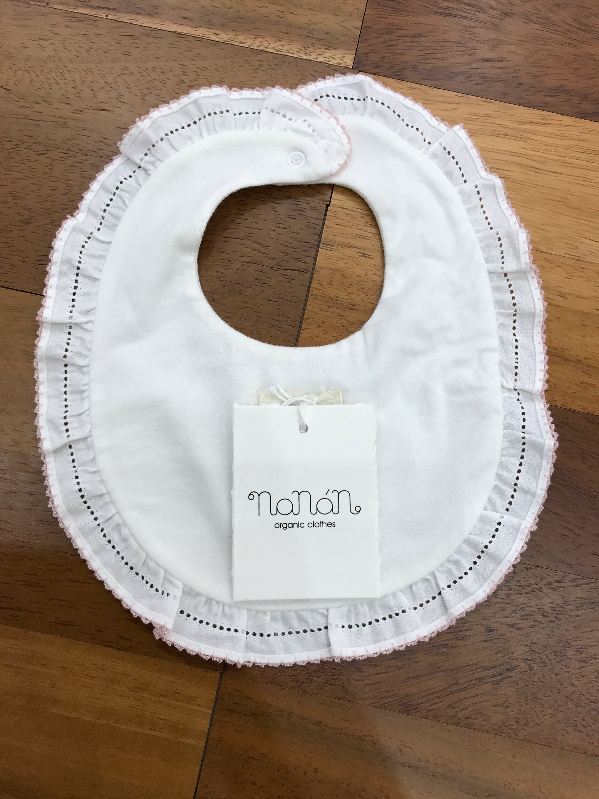 Bavaglino realizzato in morbido cotone caldo, rifinito con ruches bianche lungo i bordi e dettagli rosa. Al centro è ricamata l’iniziale del logo Nanan, conferendo un tocco distintivo e raffinato.