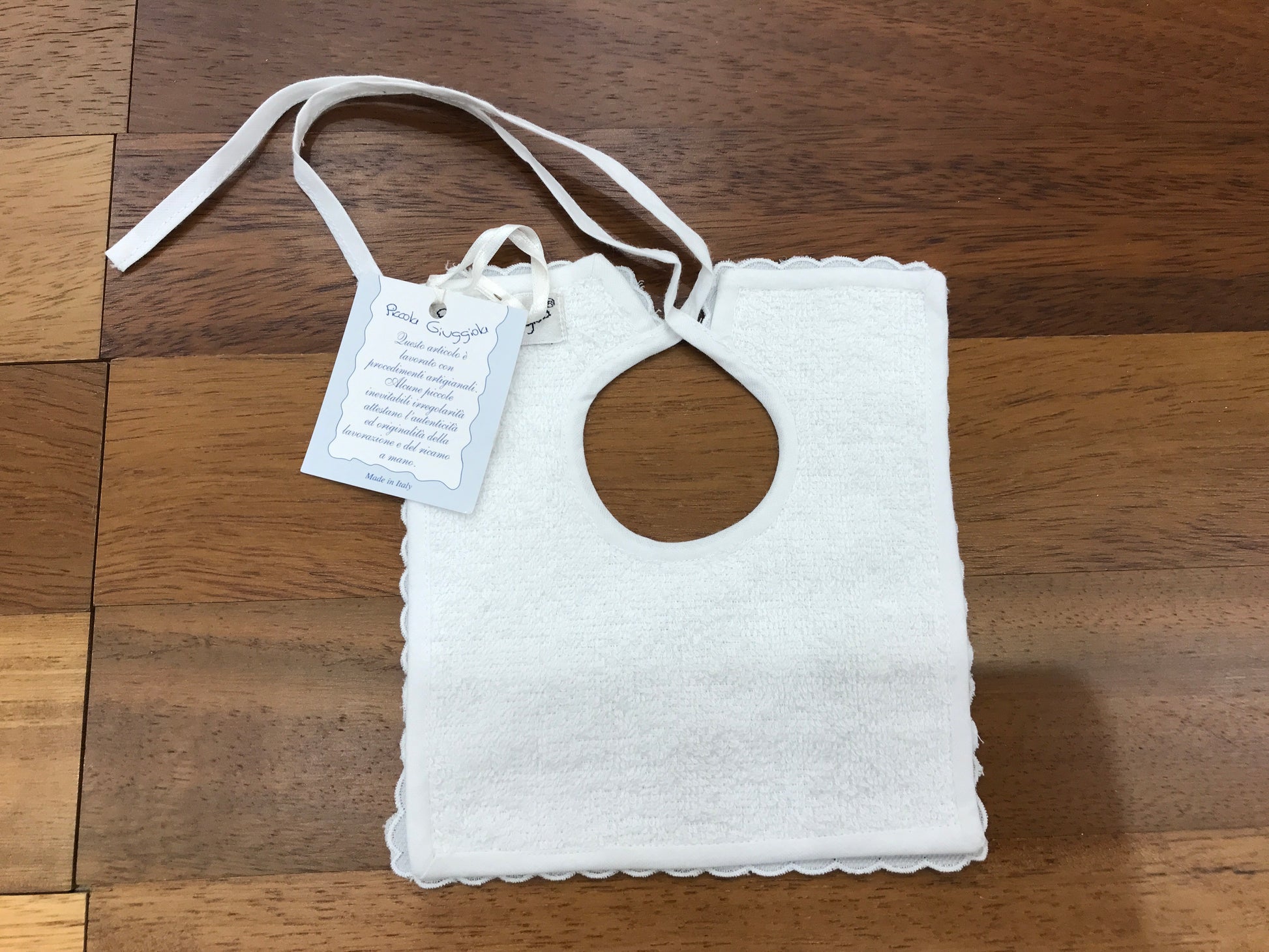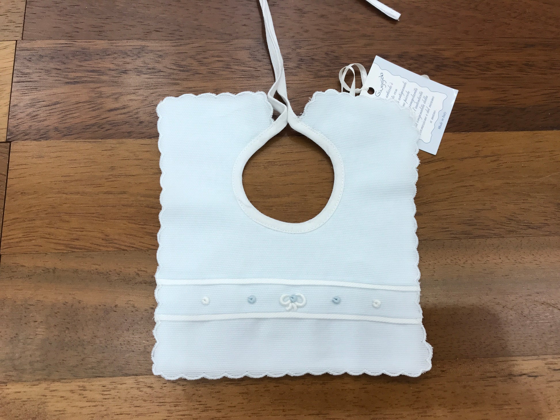 Questo bavaglino presenta una forma quadrata e un retro realizzato in morbida spugna, ideale per assorbire efficacemente eventuali liquidi. La parte frontale è impreziosita da eleganti ricami nei toni panna e celeste, arricchiti da un motivo a pois e da un delicato fiocchetto, che conferiscono un tocco di raffinatezza e dolcezza al design. Perfetto per unire funzionalità e stile nei momenti dei pasti.