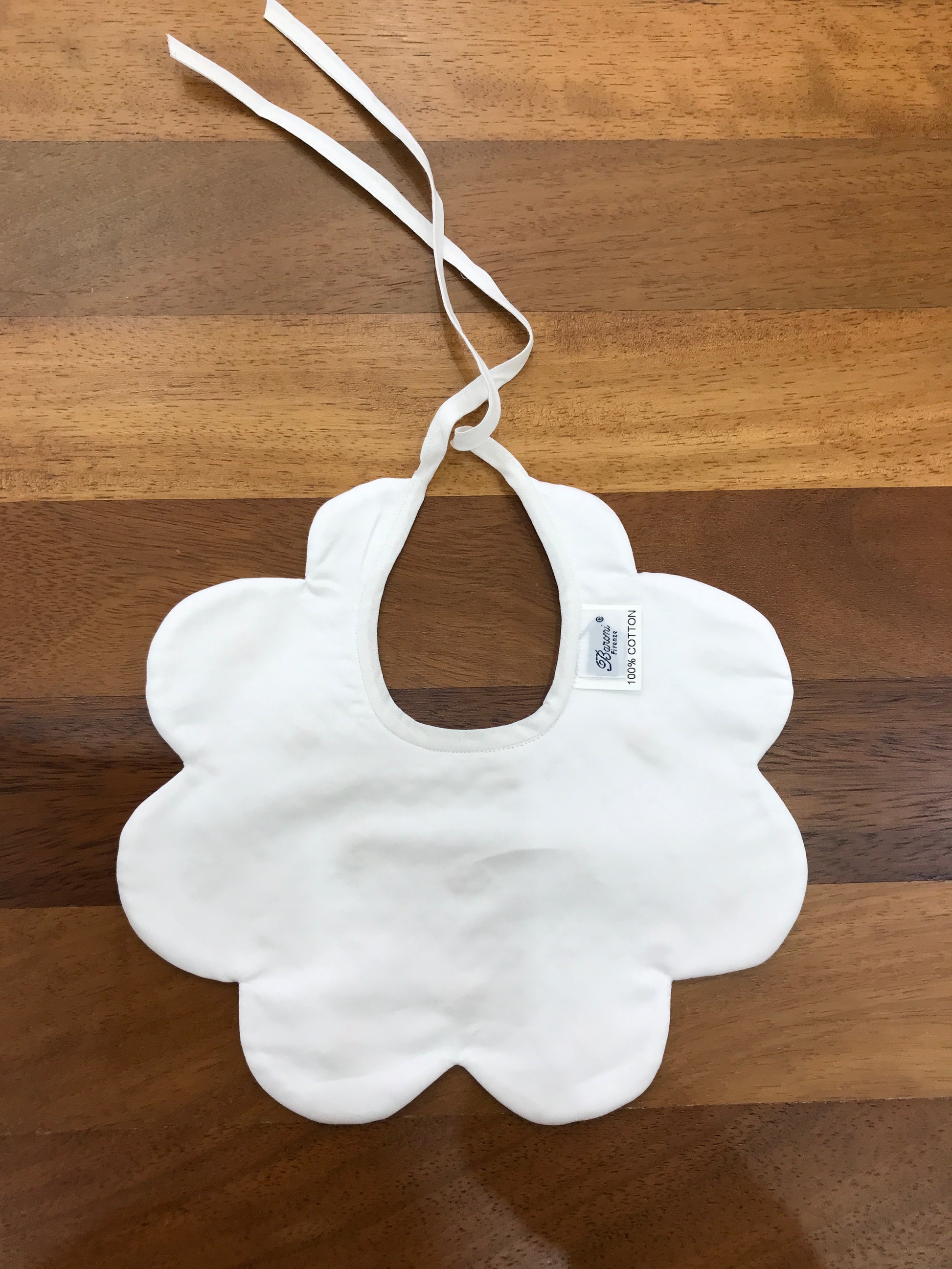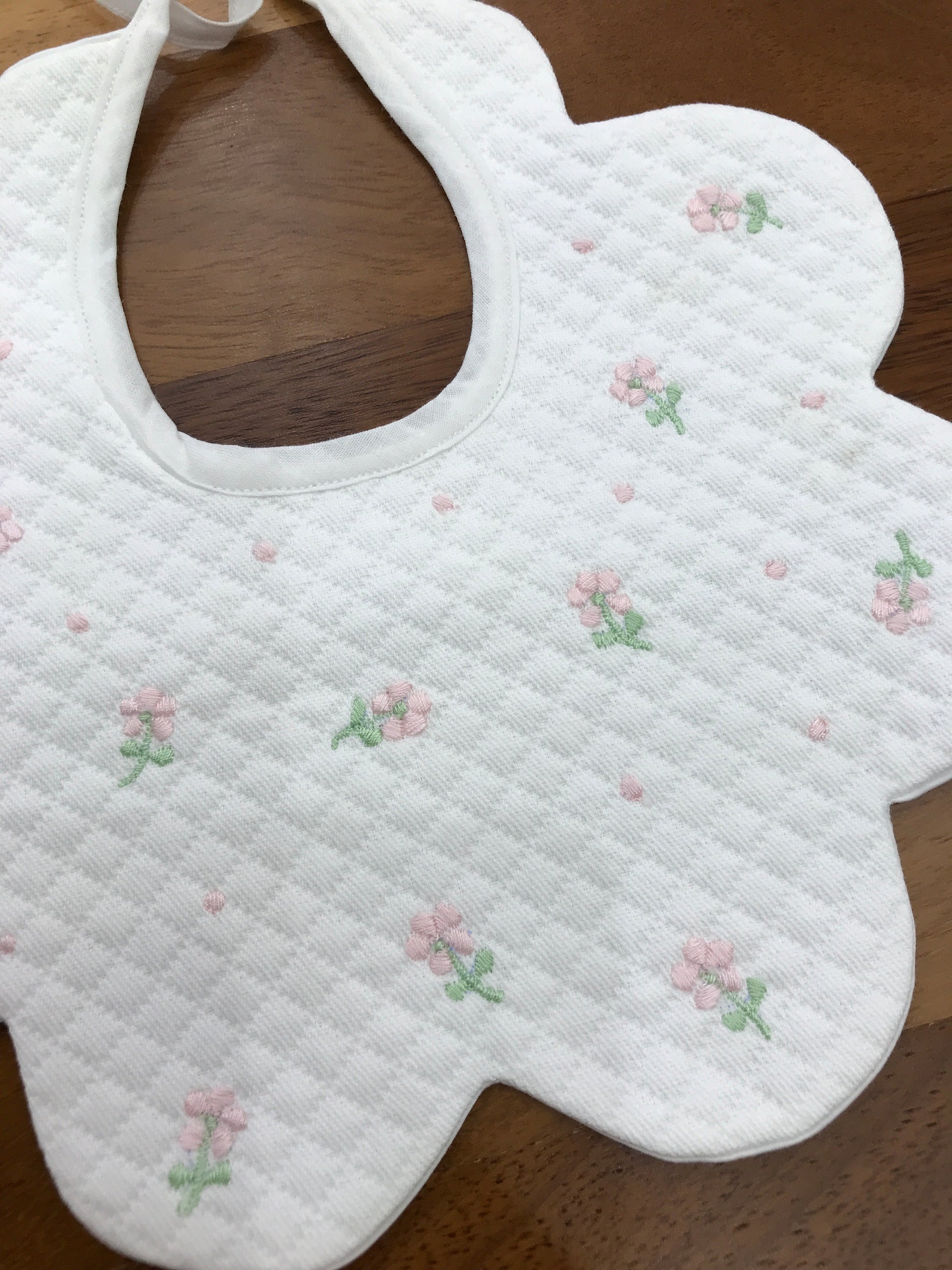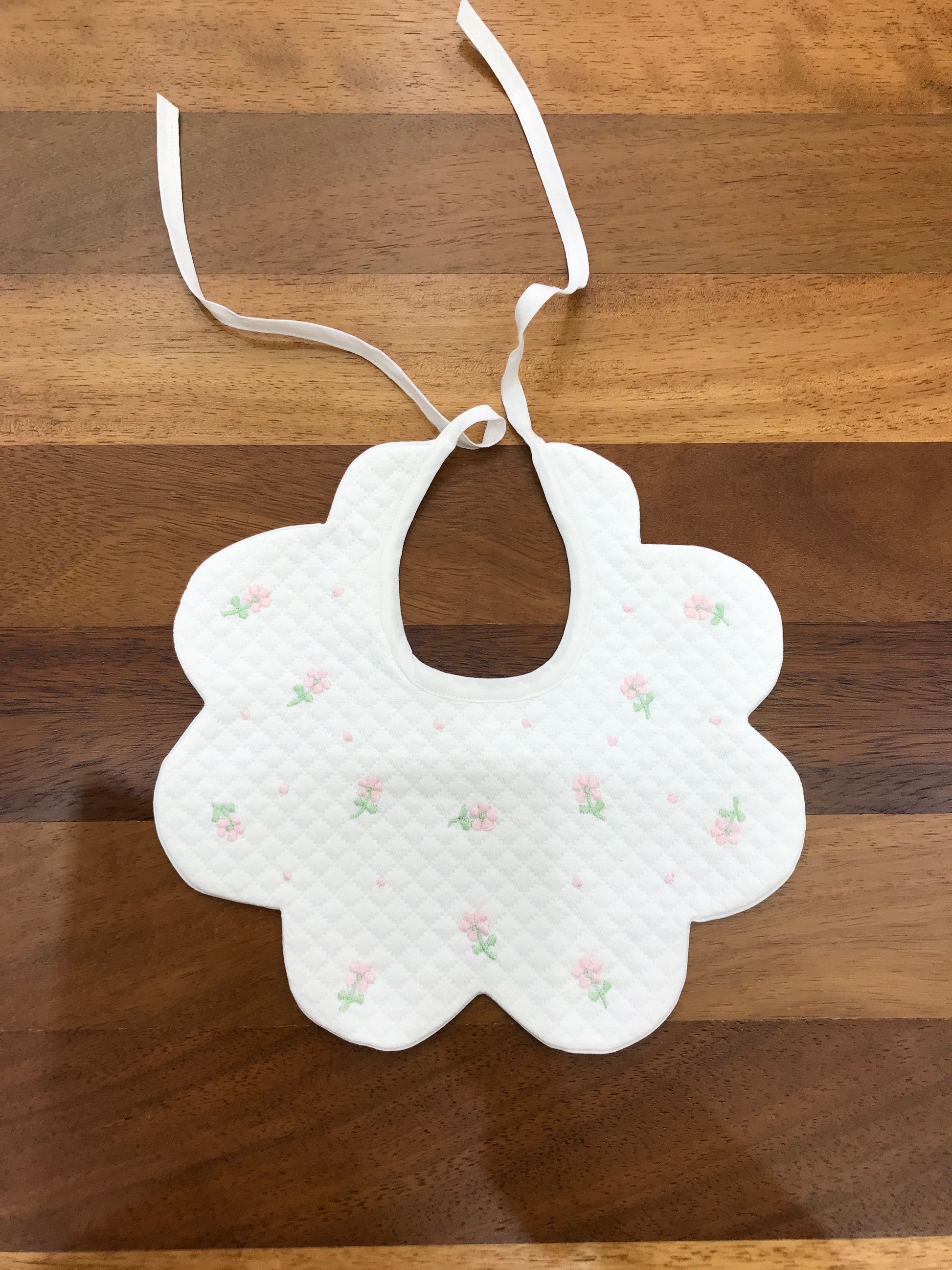 Bavaglino con bordi smerlati a forma di fiore, decorato con ricami floreali in colore rosa sul davanti.