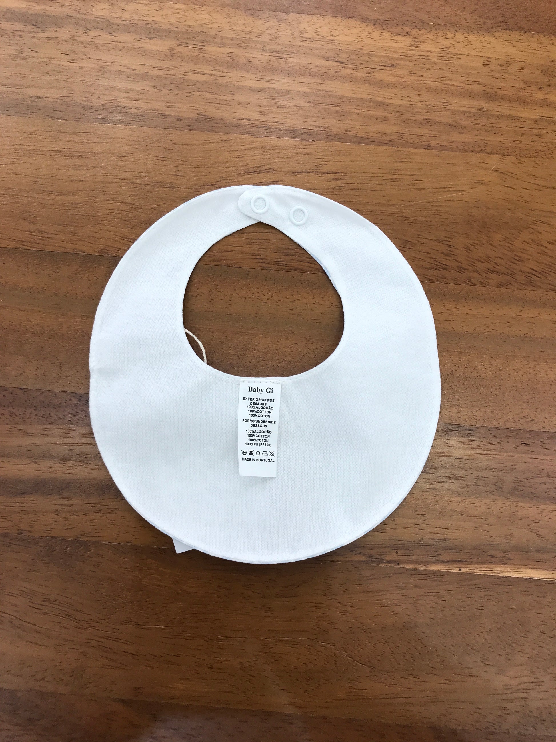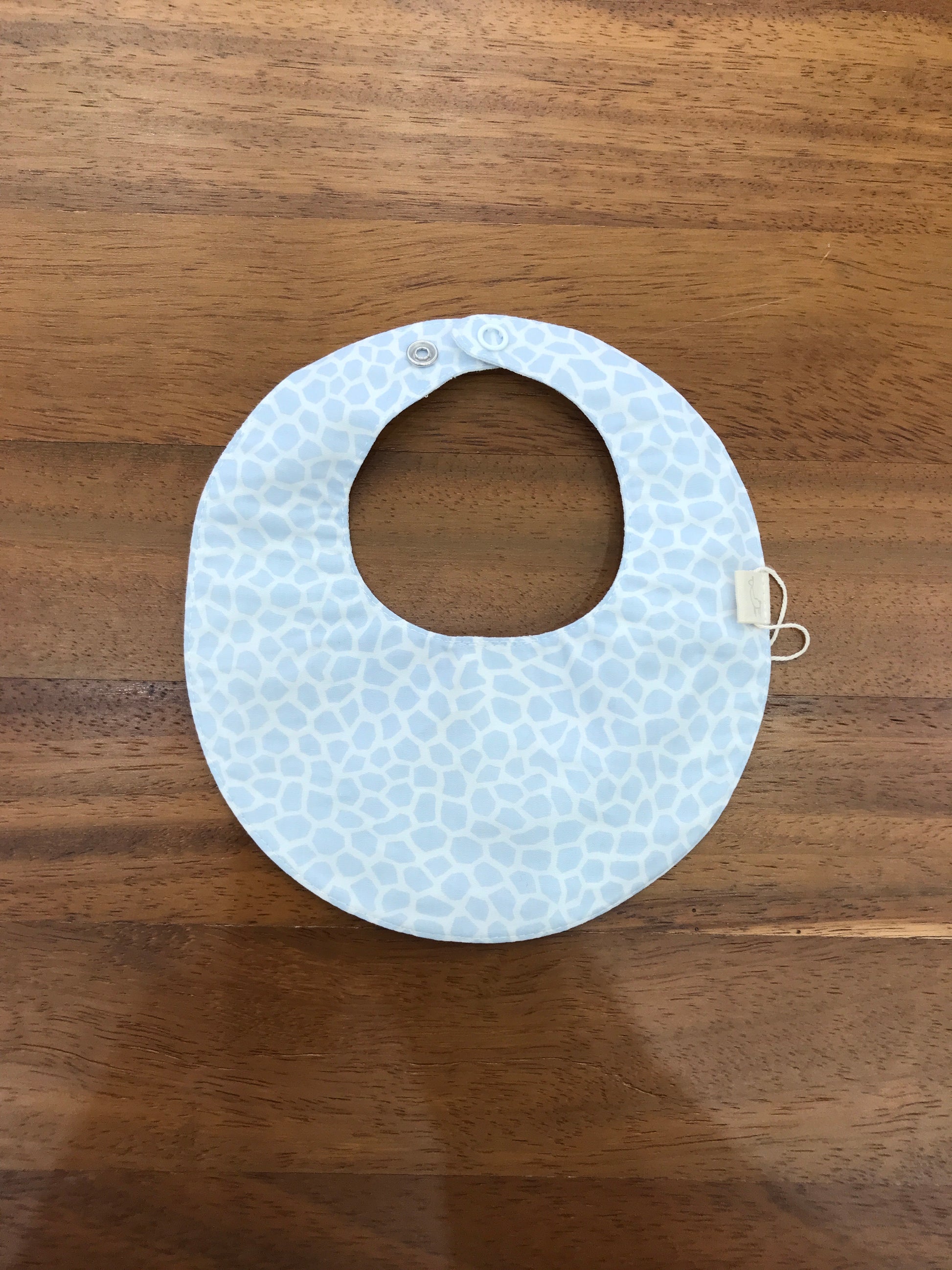 La bavetta ha una forma rotonda e presenta numerose piccole sagome di colore celeste su uno sfondo panna.