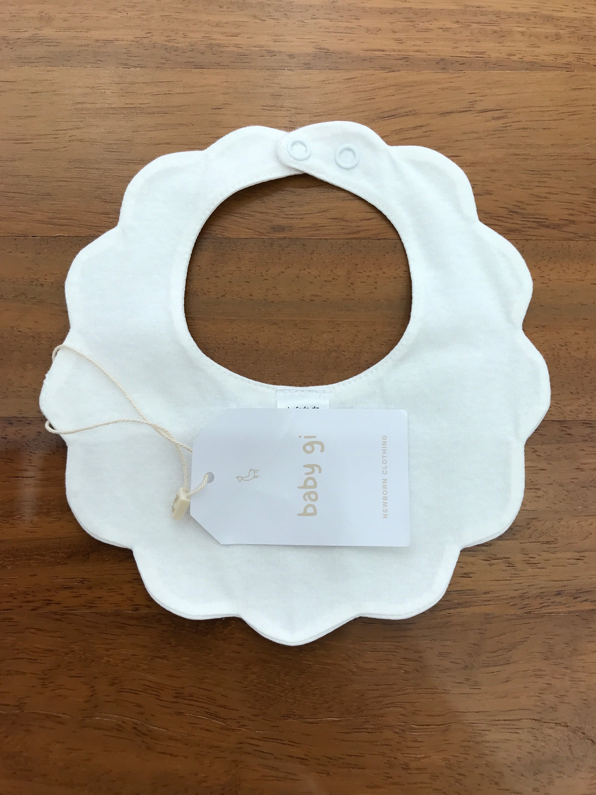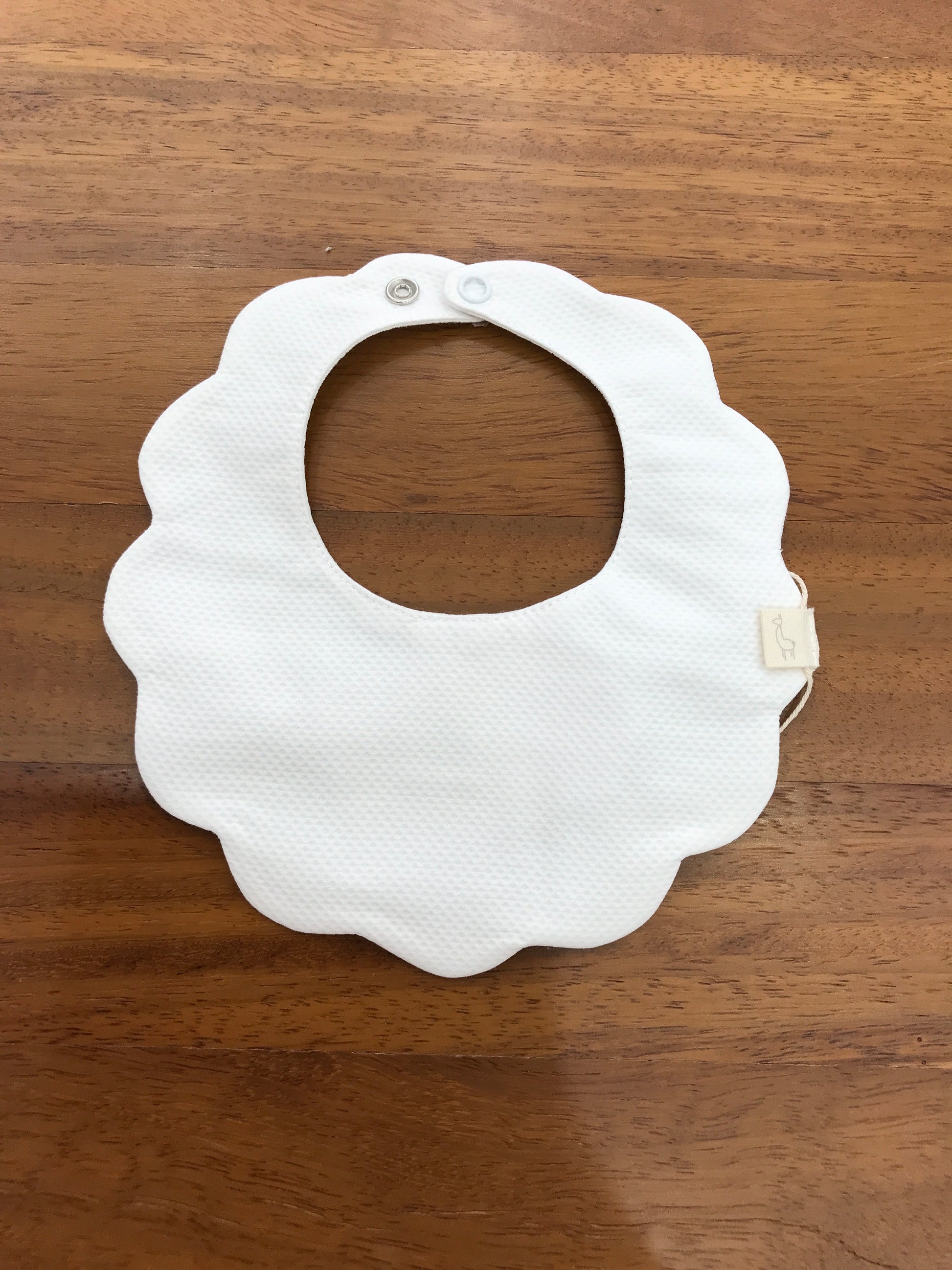 Bavaglino bianco smerlato dal design semplice ed essenziale, caratterizzato da una chiusura pratica con piccole clip che garantiscono una perfetta aderenza e facilità d’uso, ideale per proteggere delicatamente i vestiti del bambino durante i pasti.