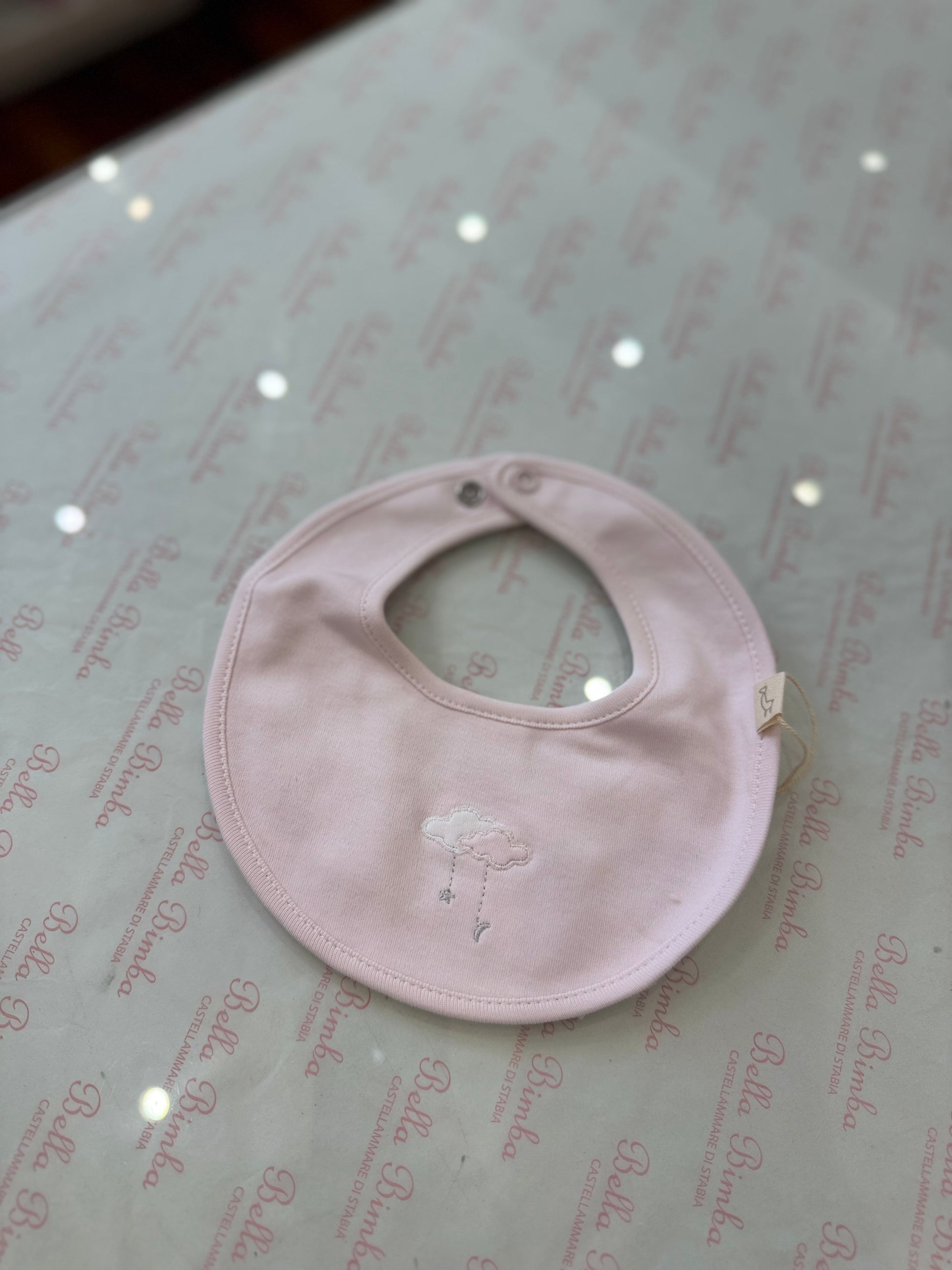 Accompagna il momento della pappa della tua piccola con stile con Bavetta baby gi in cotone rosa con tema nuvoletta. Morbida e resistente, garantisce comfort e praticità durante l'alimentazione. Perfetta per le mamme che vogliono un tocco di eleganza anche durante i pasti del loro bebè.