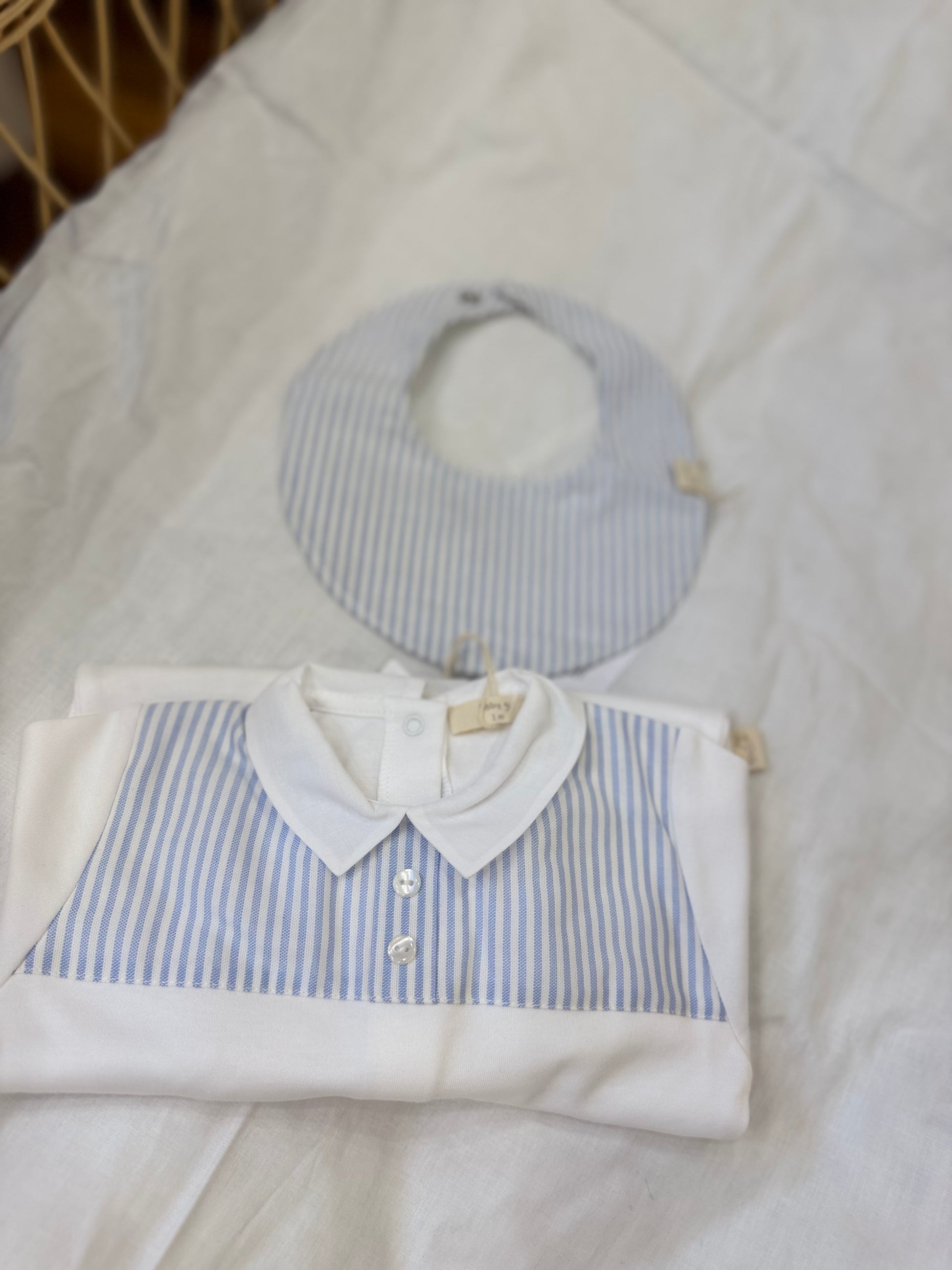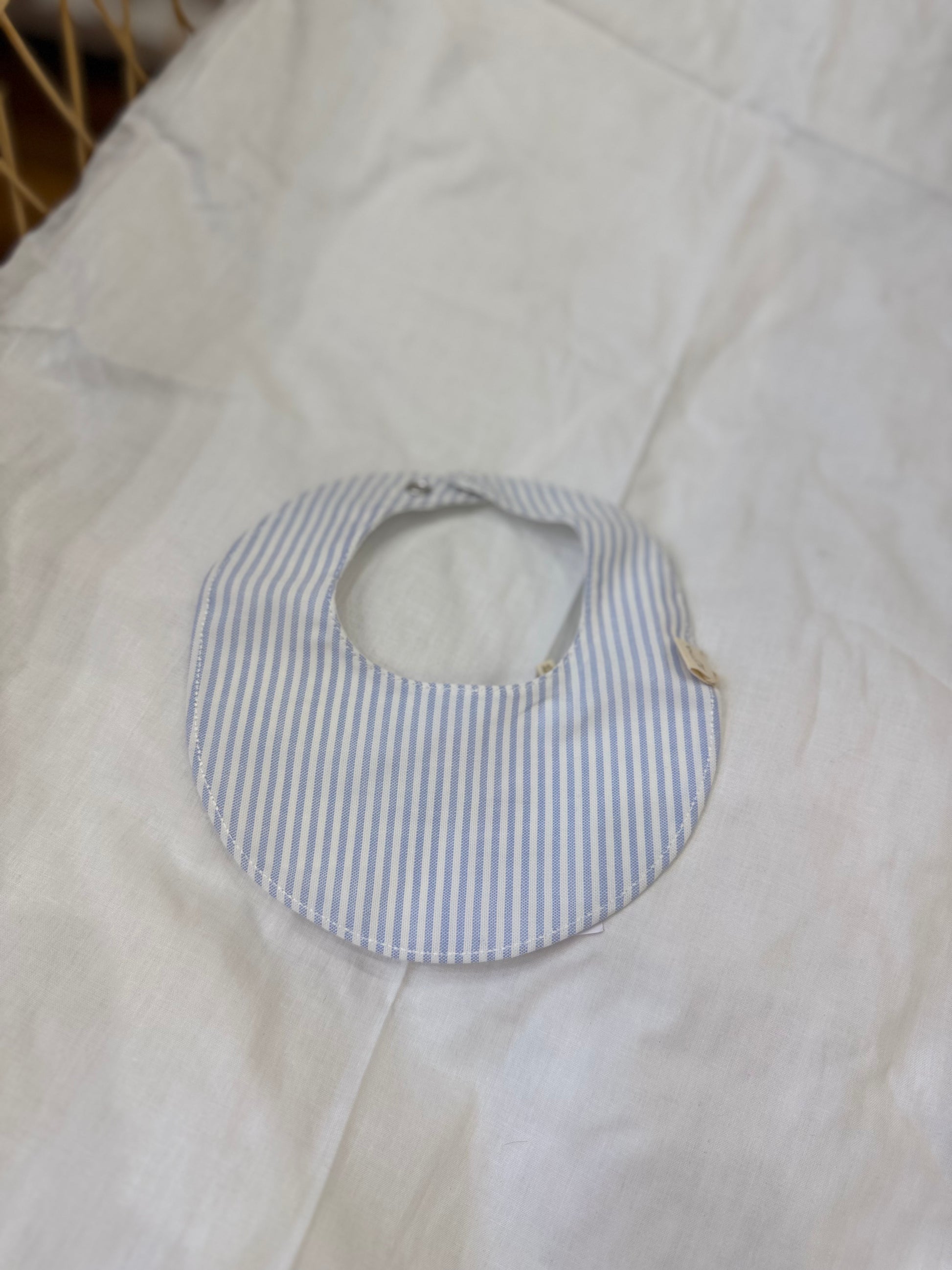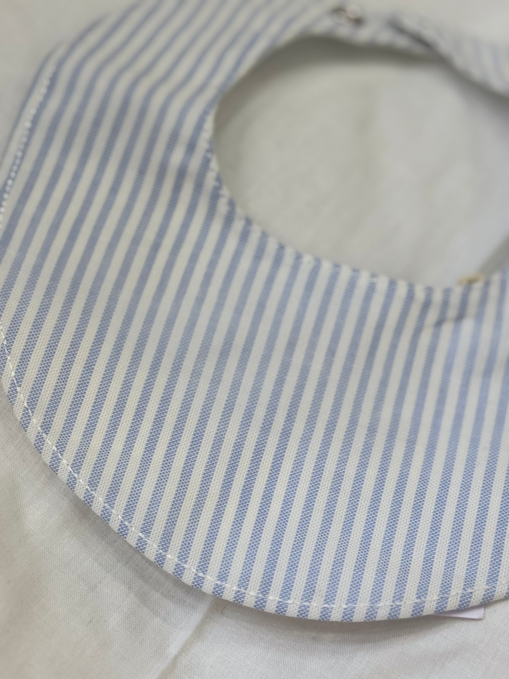 "Assicura una pratica pappa al tuo bambino con la Bavetta Baby gì. Realizzata in cotone a righe celesti, questa bavetta è perfetta per completare il suo outfit durante i pasti e offrire un comodo e coordinato look