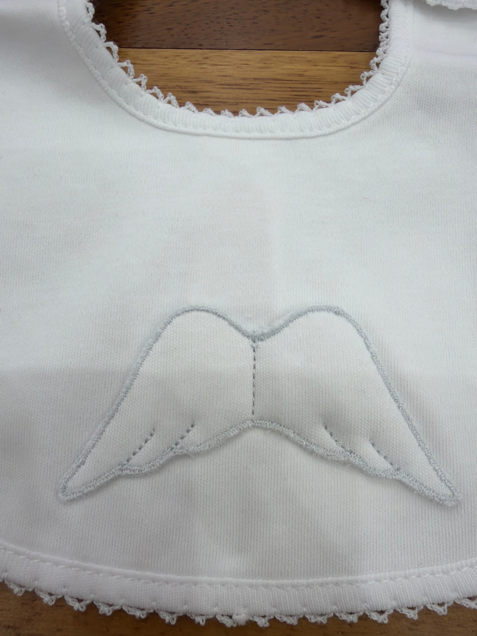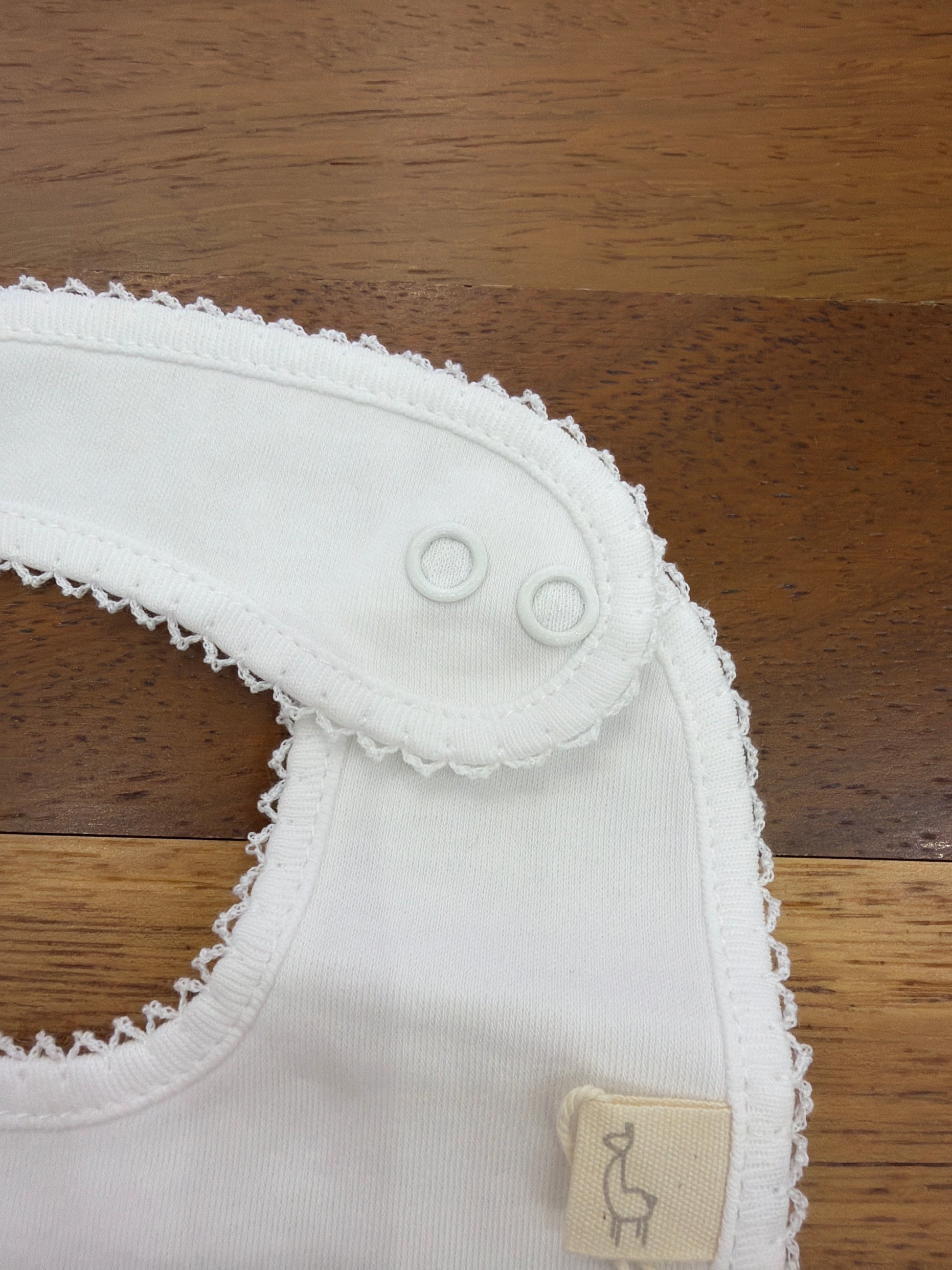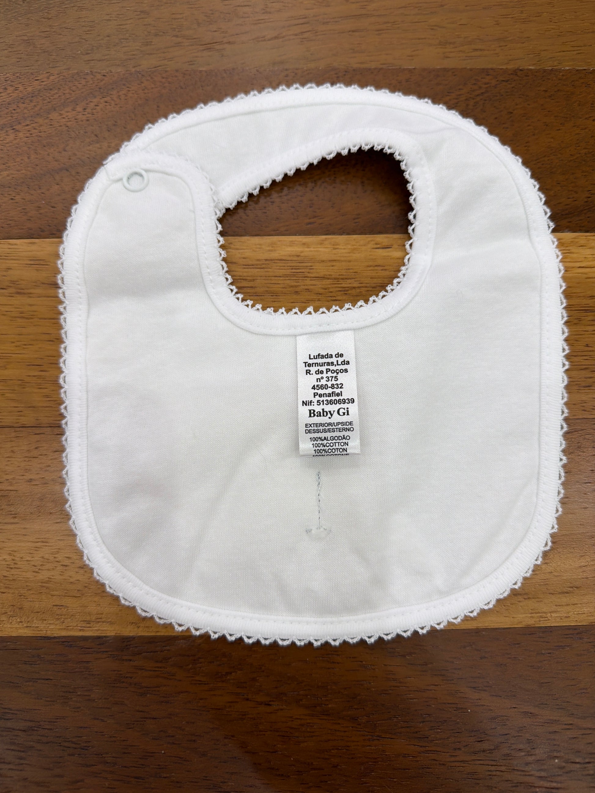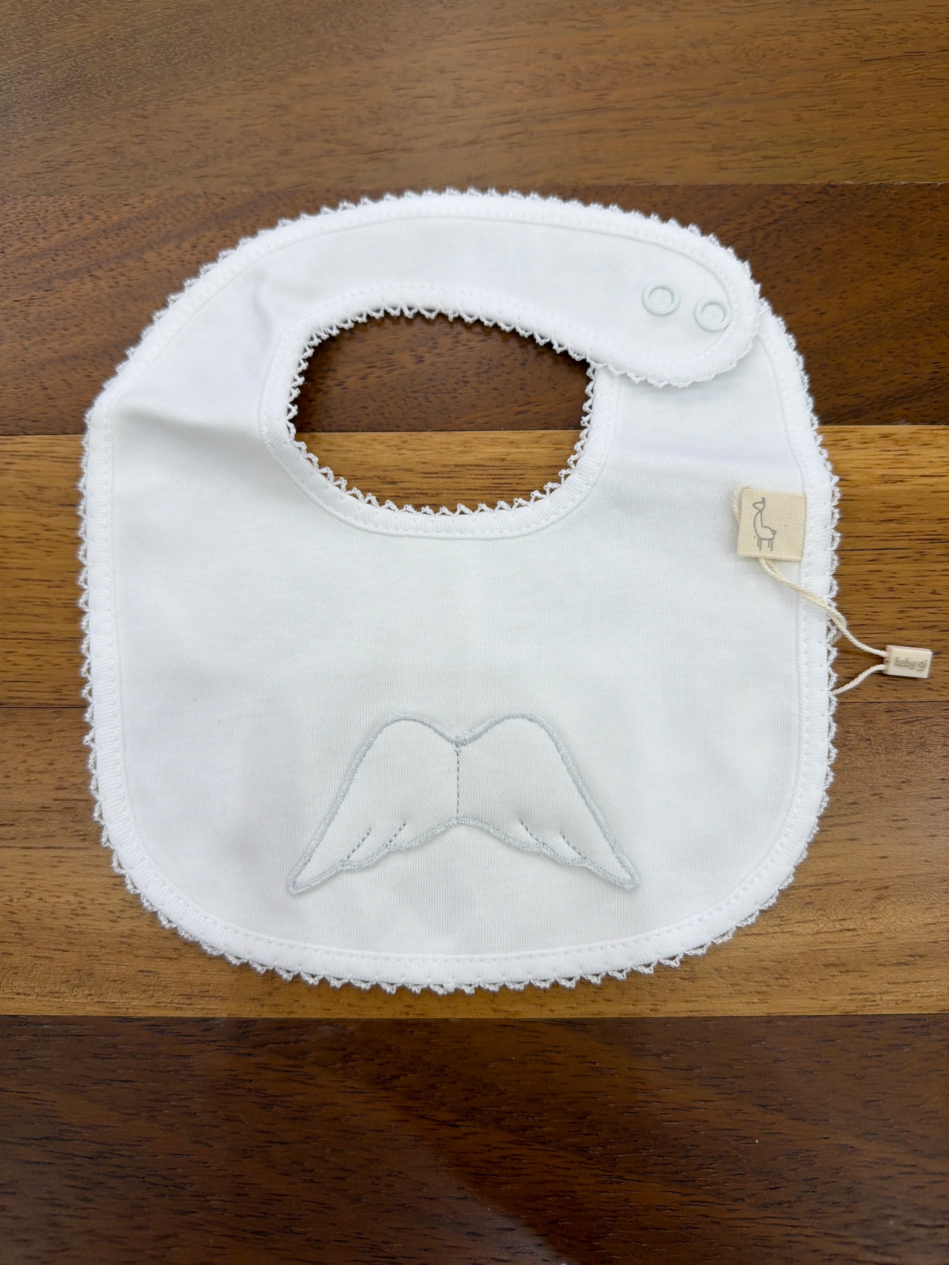 Bavaglino bianco caratterizzato da un bordo smerlato e applicazioni decorative a forma di ali sul davanti, dotato di chiusura con bottoncini per una vestibilità sicura e confortevole.