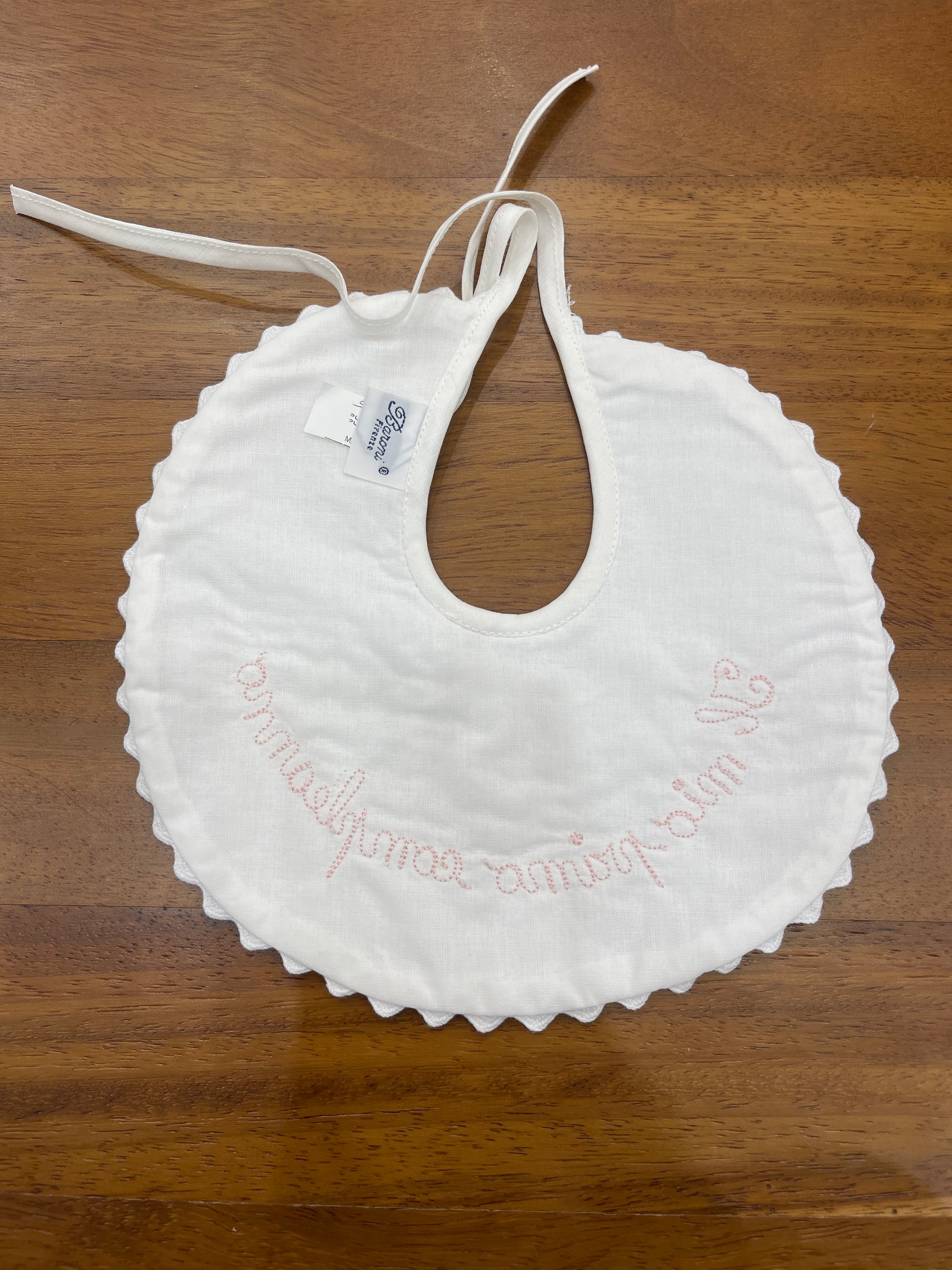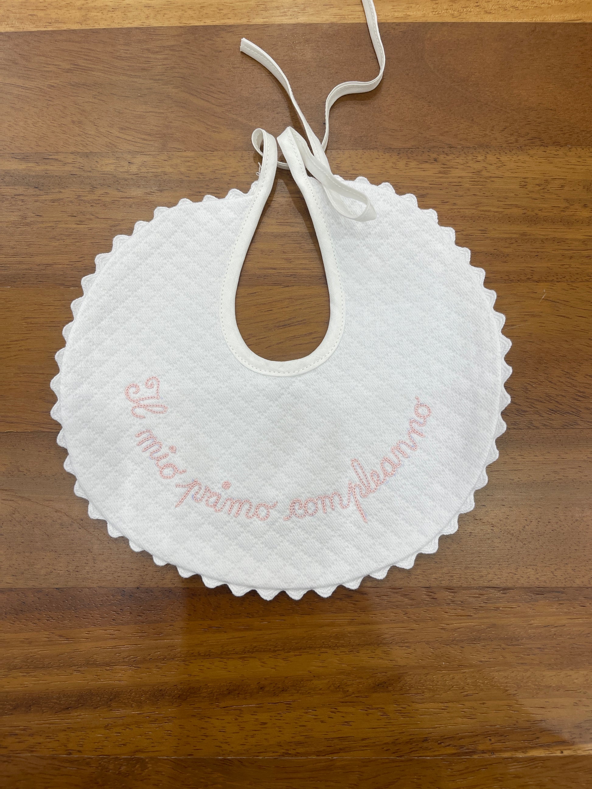 Bavaglino tondo con bordo smerlato, decorato con la scritta ricamata "il mio primo compleanno" in tonalità rosa.