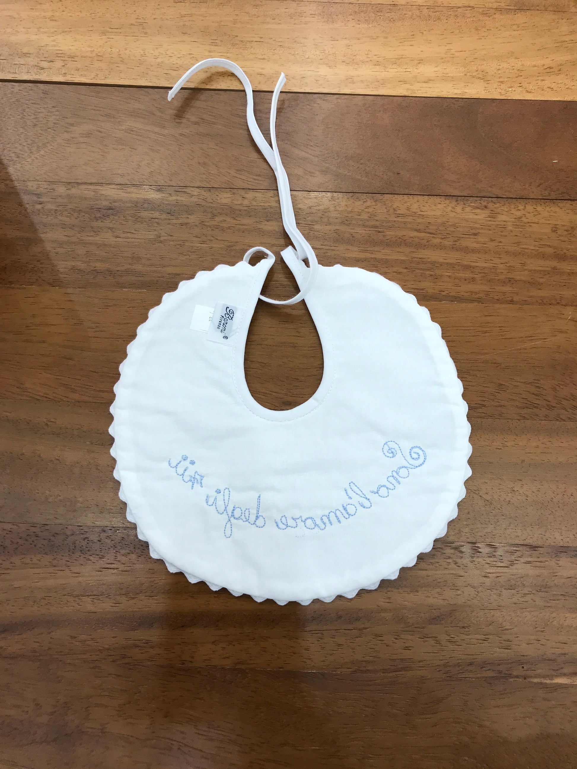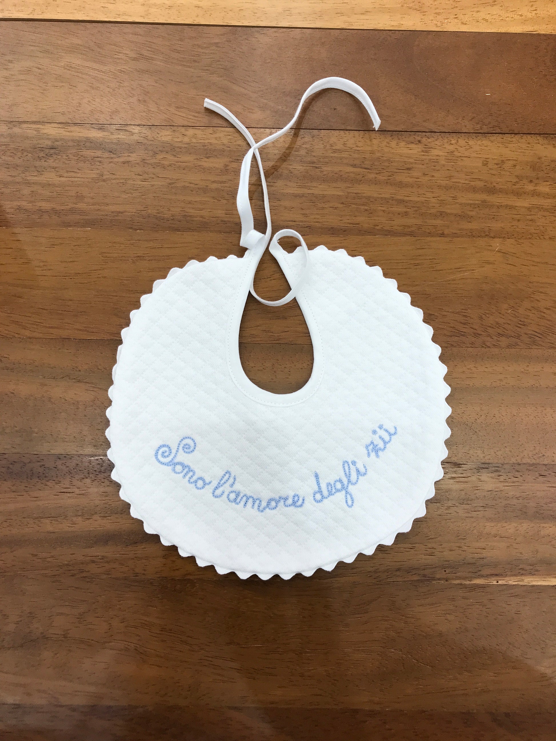 Bavaglino tondo con bordo smerlato, decorato con la scritta ricamata "sono l'amore degli zii" in tonalità celeste.