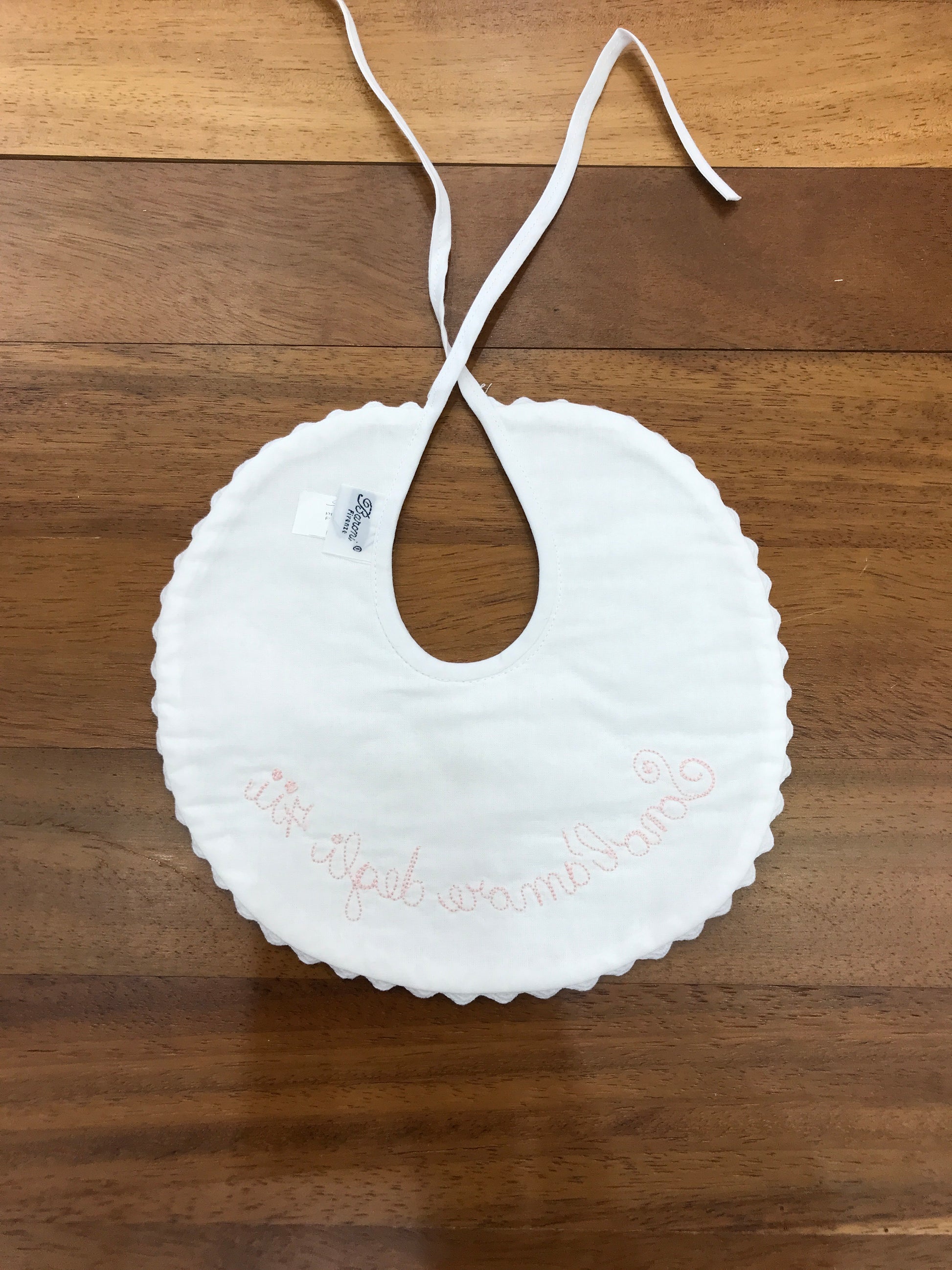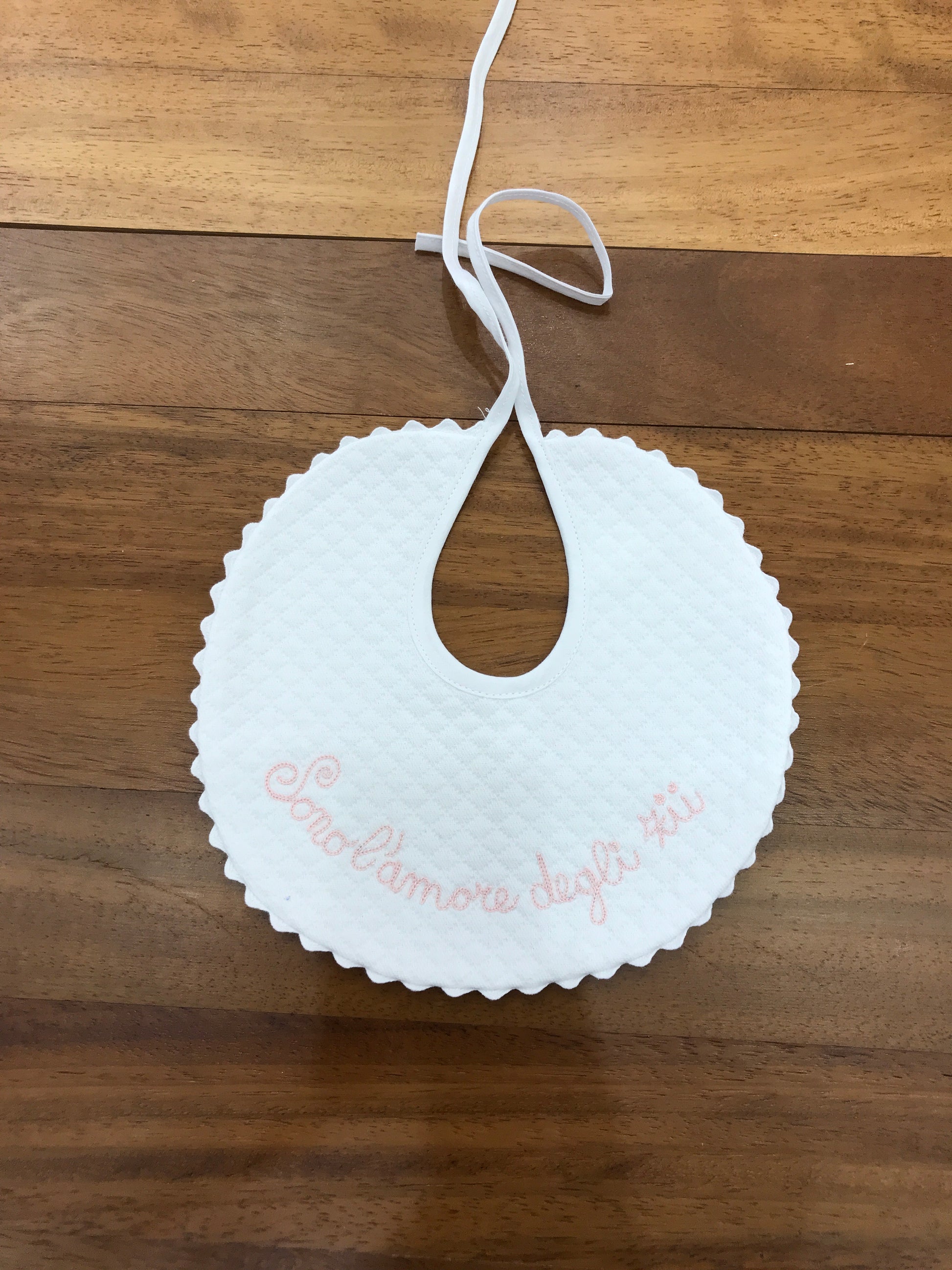 Bavaglino tondo con bordo smerlato, decorato con la scritta ricamata "sono l'amore degli zii" in tonalità rosa.