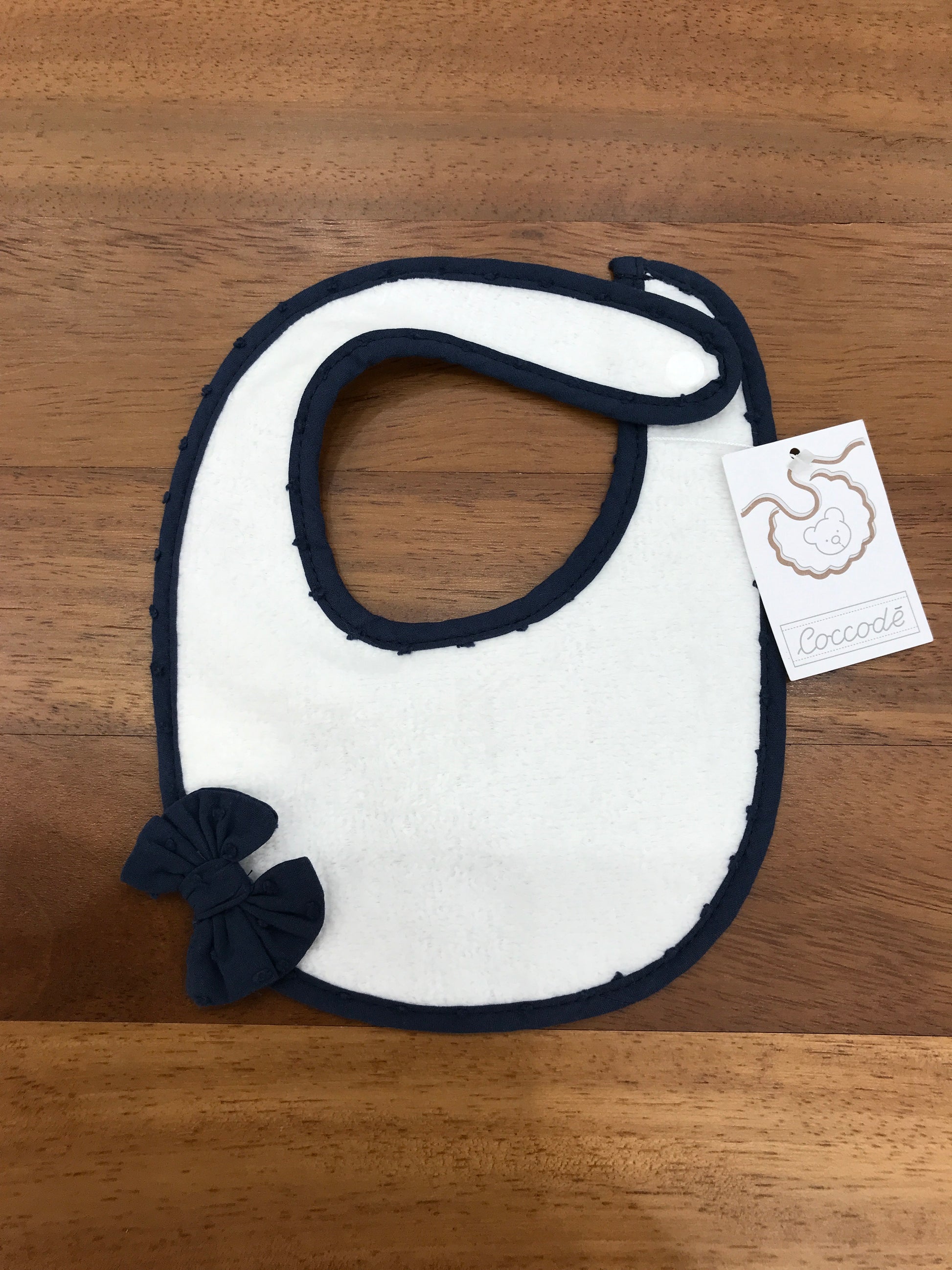 Bavaglino rotondo realizzato in spugna, con bordi di colore blu scuro e un elegante fiocchetto laterale tono su tono.