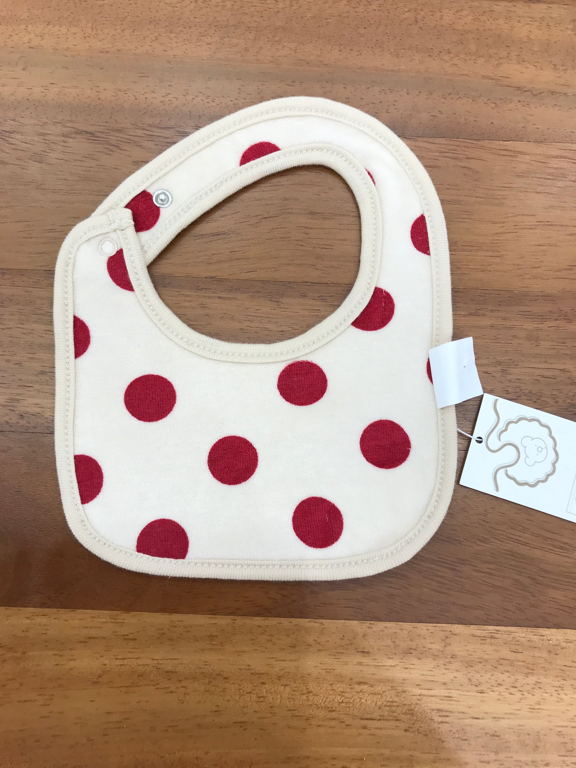 Bavaglino con bordi beige raffinati che presenta una doppia decorazione: un lato è caratterizzato da una base beige arricchita da pois rossi, mentre l'altro lato è completamente bianco, offrendo così due opzioni di stile in un unico accessorio funzionale.