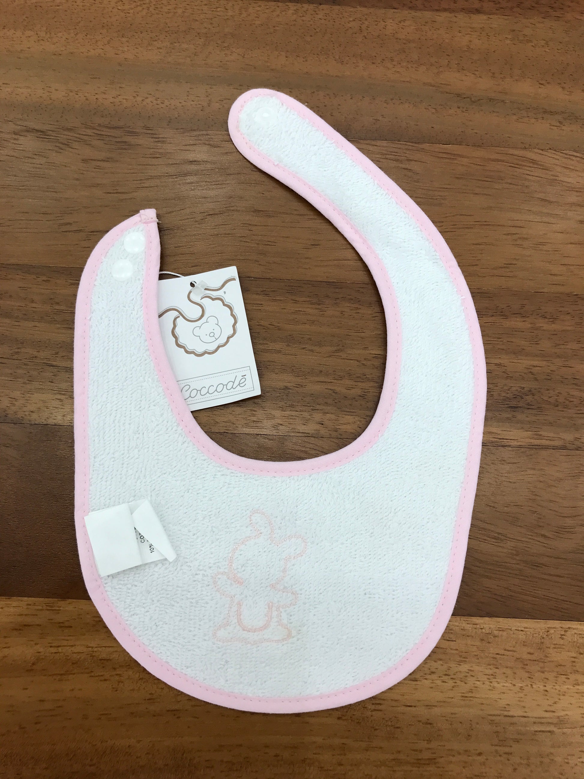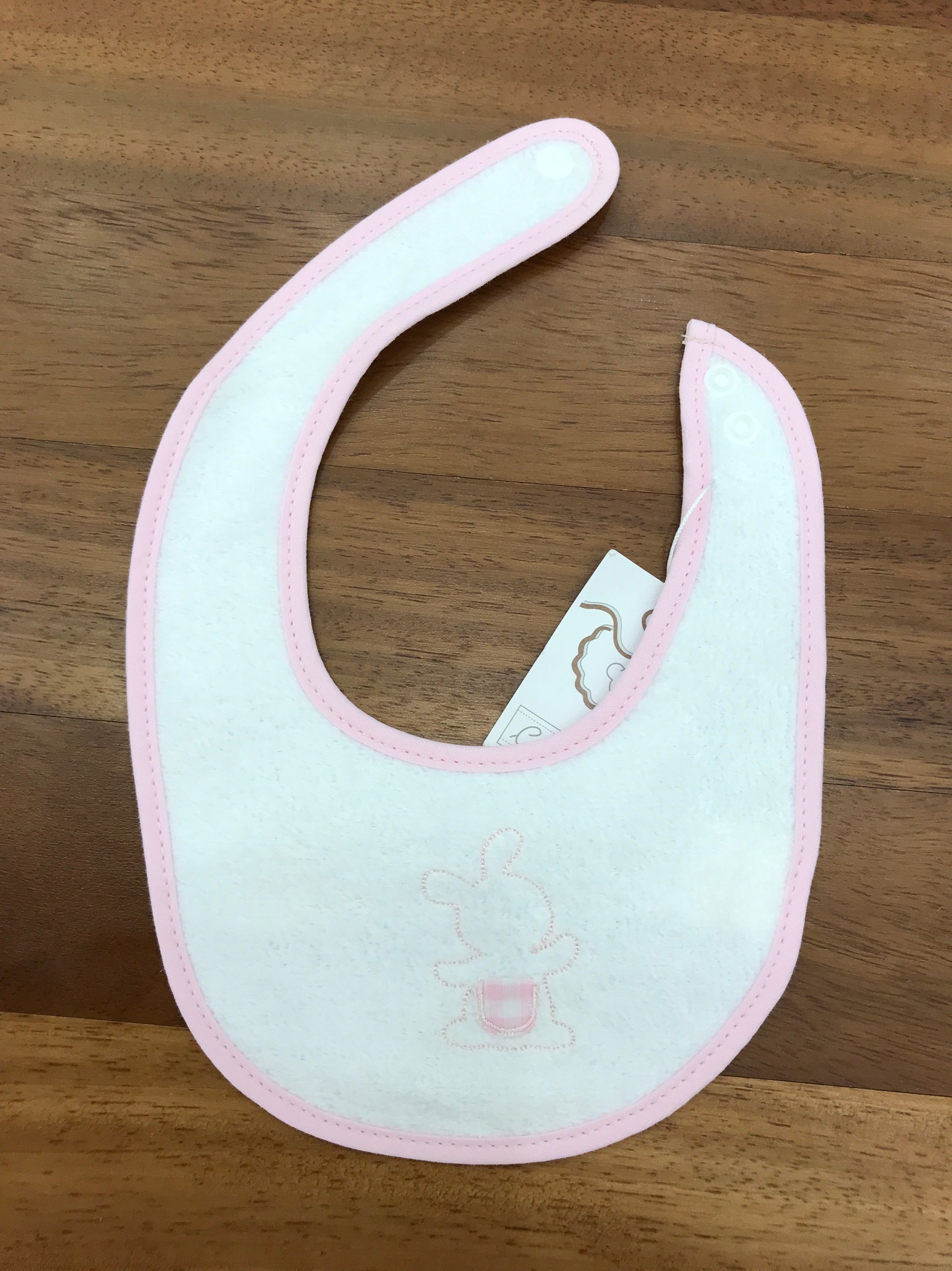Bavetta in spugna con rifinitura rosa, decorata sul davanti da un delicato ricamo di coniglietto rosa.