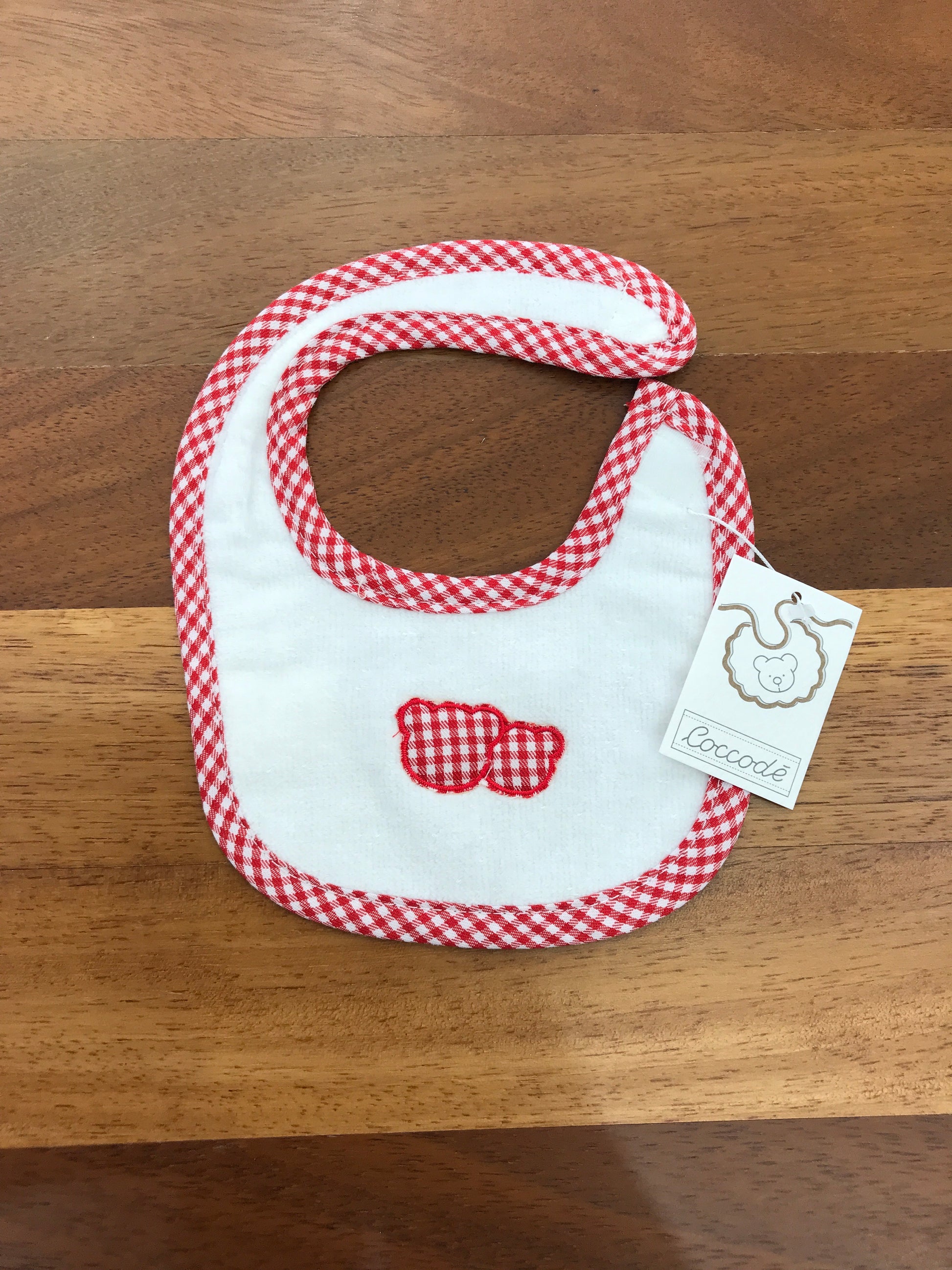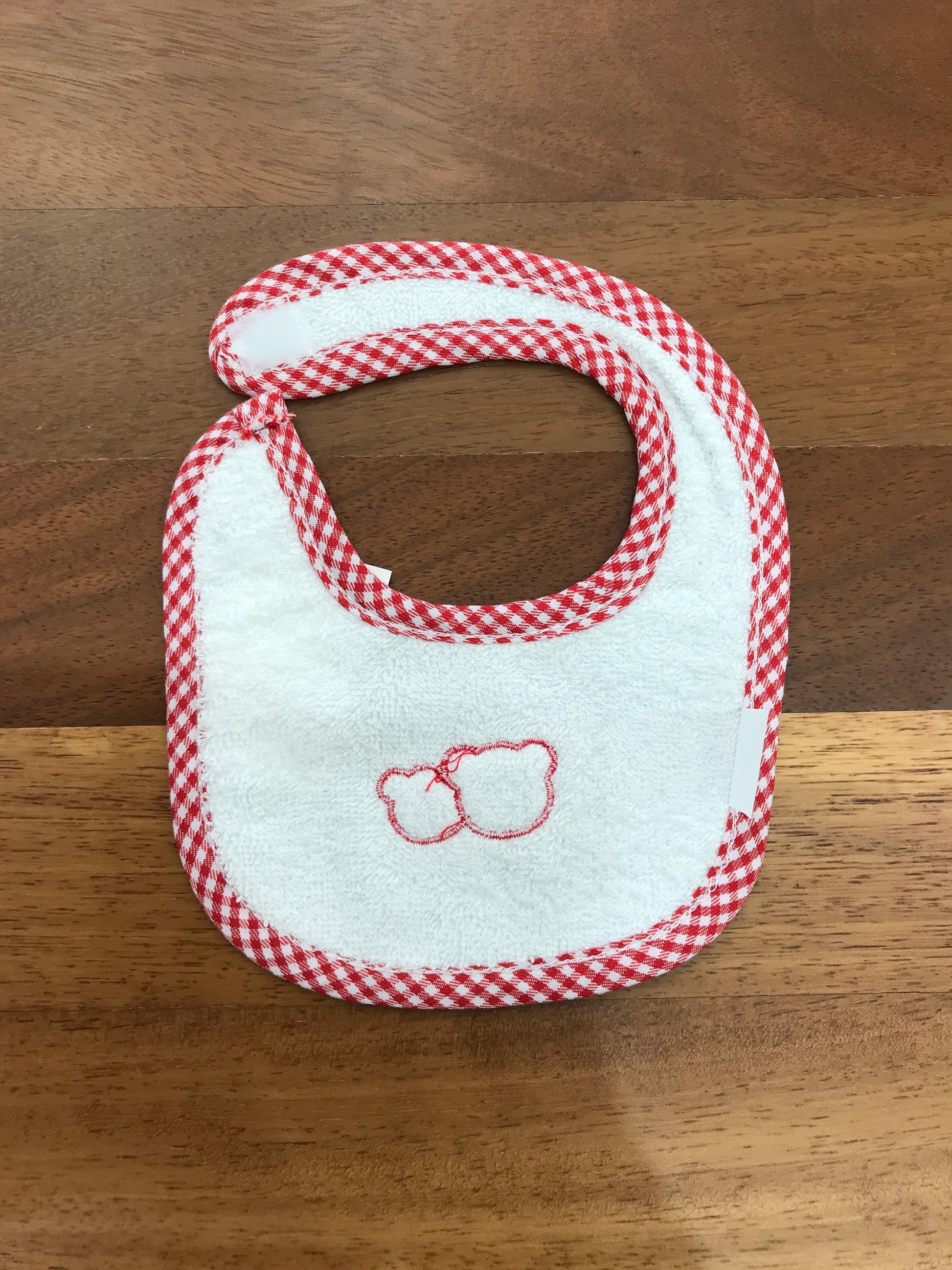Bavaglino in morbida spugna con dettagli a quadretti bianchi e rossi. Caratterizzato da un bordo in pizzo delicato e da due simpatici orsetti ricamati sul petto, questo accessorio combina praticità e stile per i più piccoli. Ideale per proteggere gli abiti durante i pasti, grazie alla sua composizione assorbente e al design accattivante.