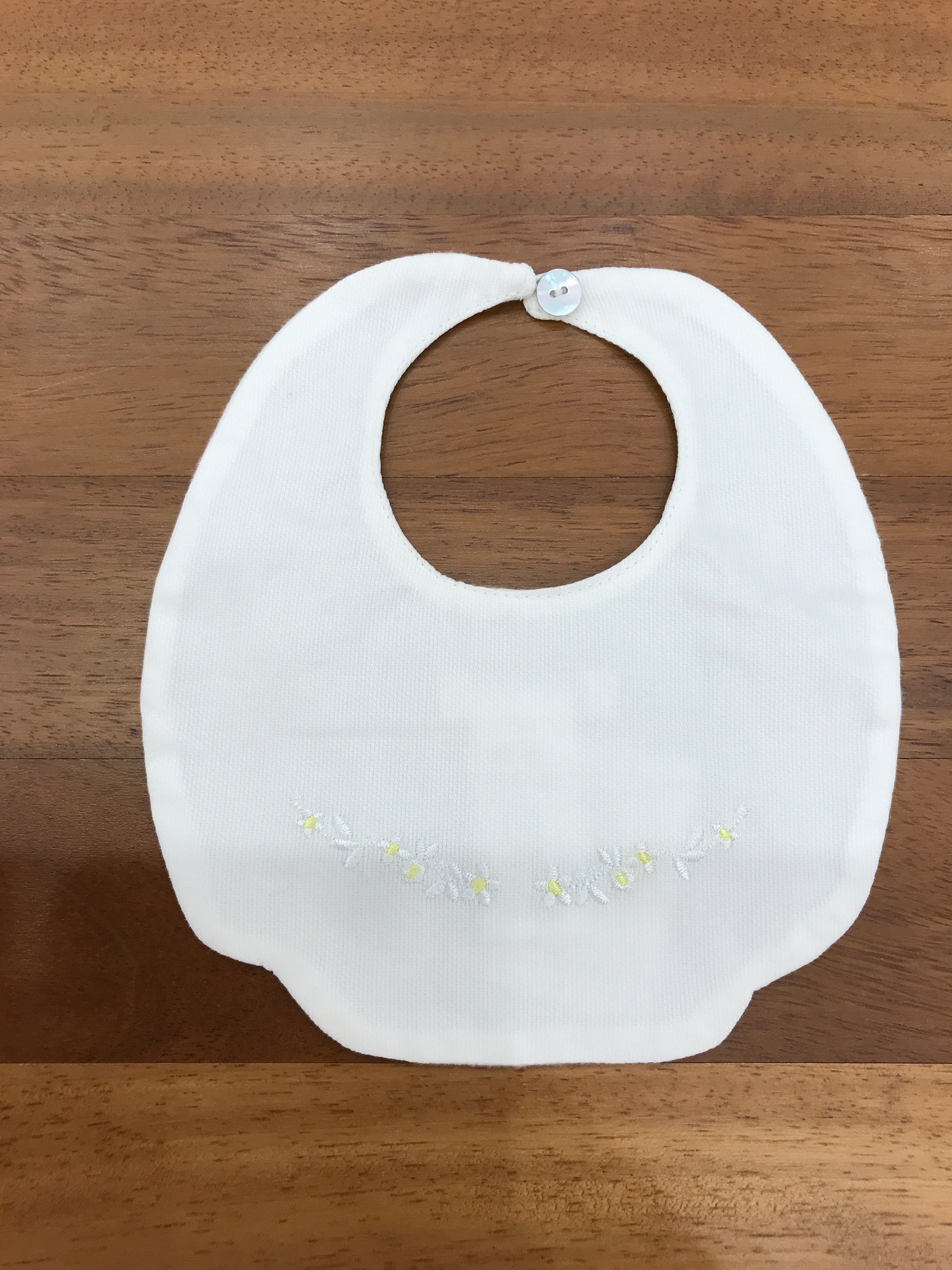 Questo bavaglino di colore bianco presenta un elegante motivo ricamato di fiori in tonalità bianche e gialle, che conferisce un tocco di delicata raffinatezza al capo, ideale per completare con stile la mise del tuo bambino.