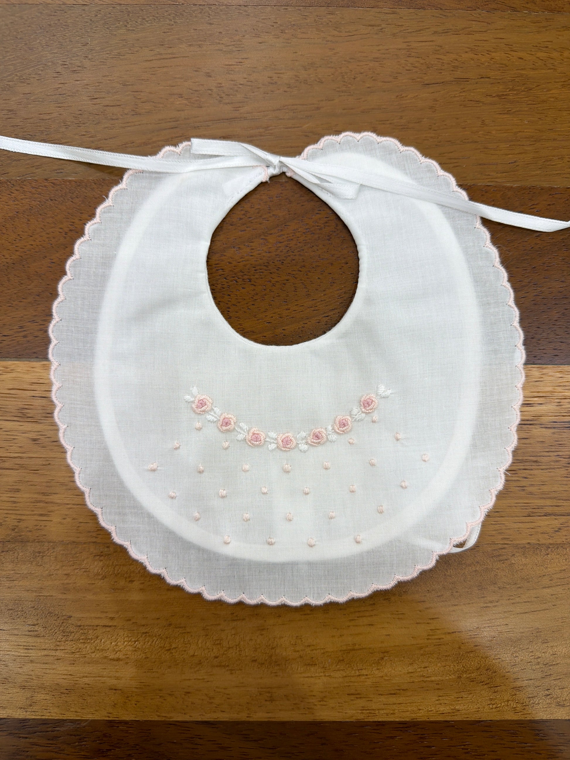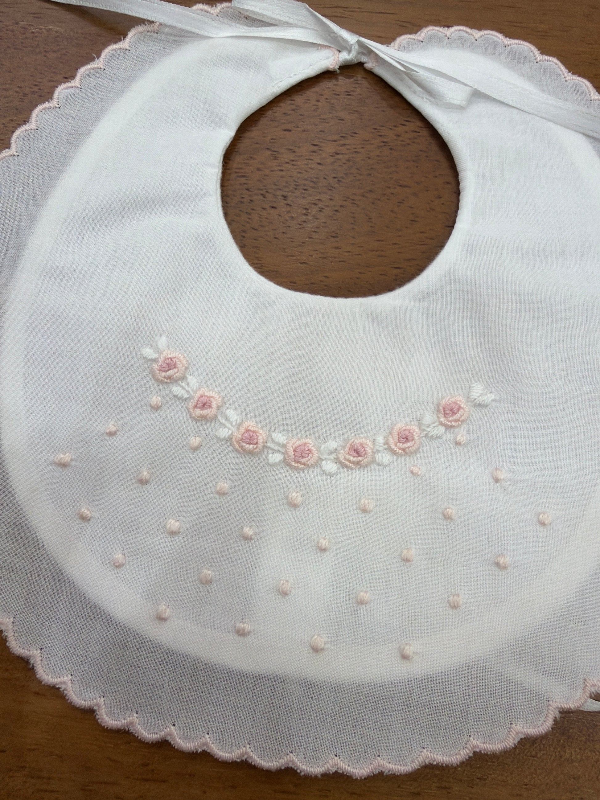 Bavaglino di colore bianco caratterizzato da un bordo in tonalità rosa, impreziosito da eleganti motivi a fiori e pois anch’essi nelle sfumature rosa, che donano un raffinato tocco di stile e rafforzano la versatilità del capo.