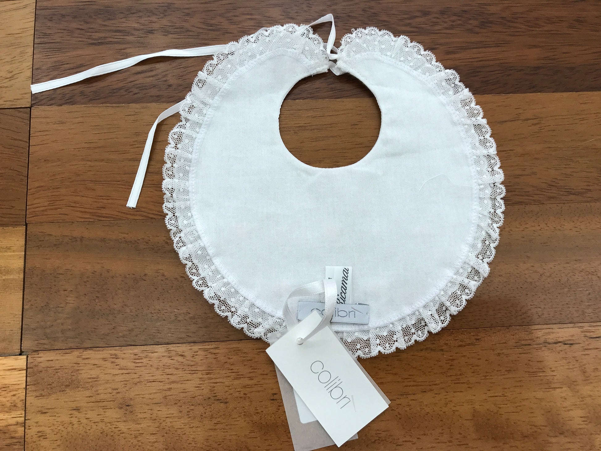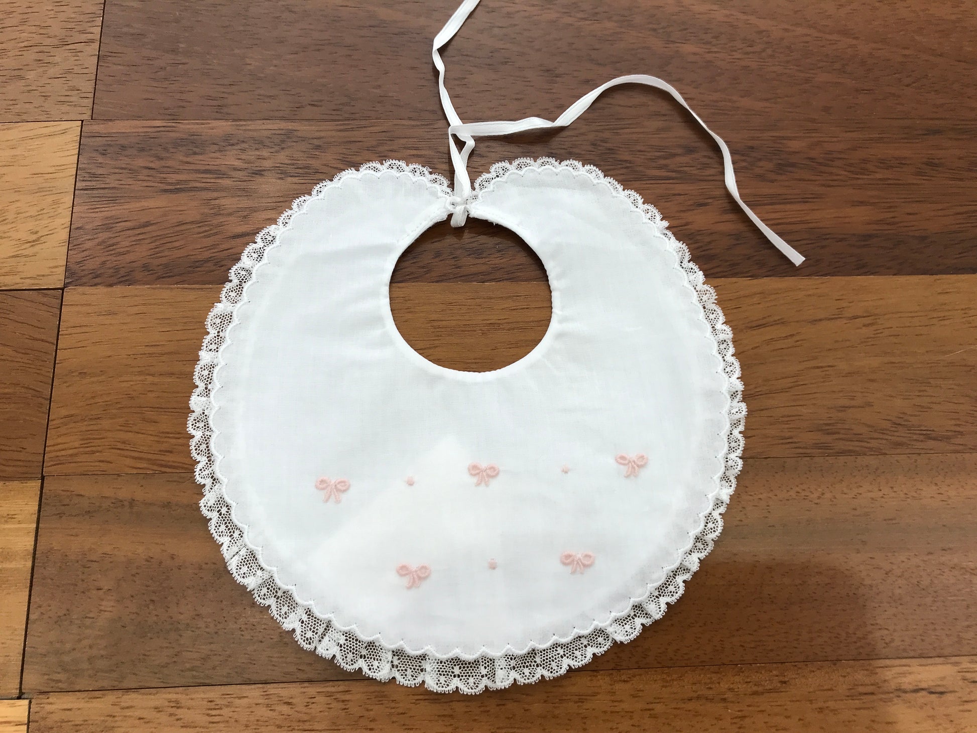 Questo bavaglino in cotone bianco presenta un delicato bordo decorato con merletto raffinato, mentre al centro è arricchito da ricami eleganti che raffigurano fiocchetti e pois rosa, conferendo un tocco sofisticato e dolce ad ogni outfit infantile.