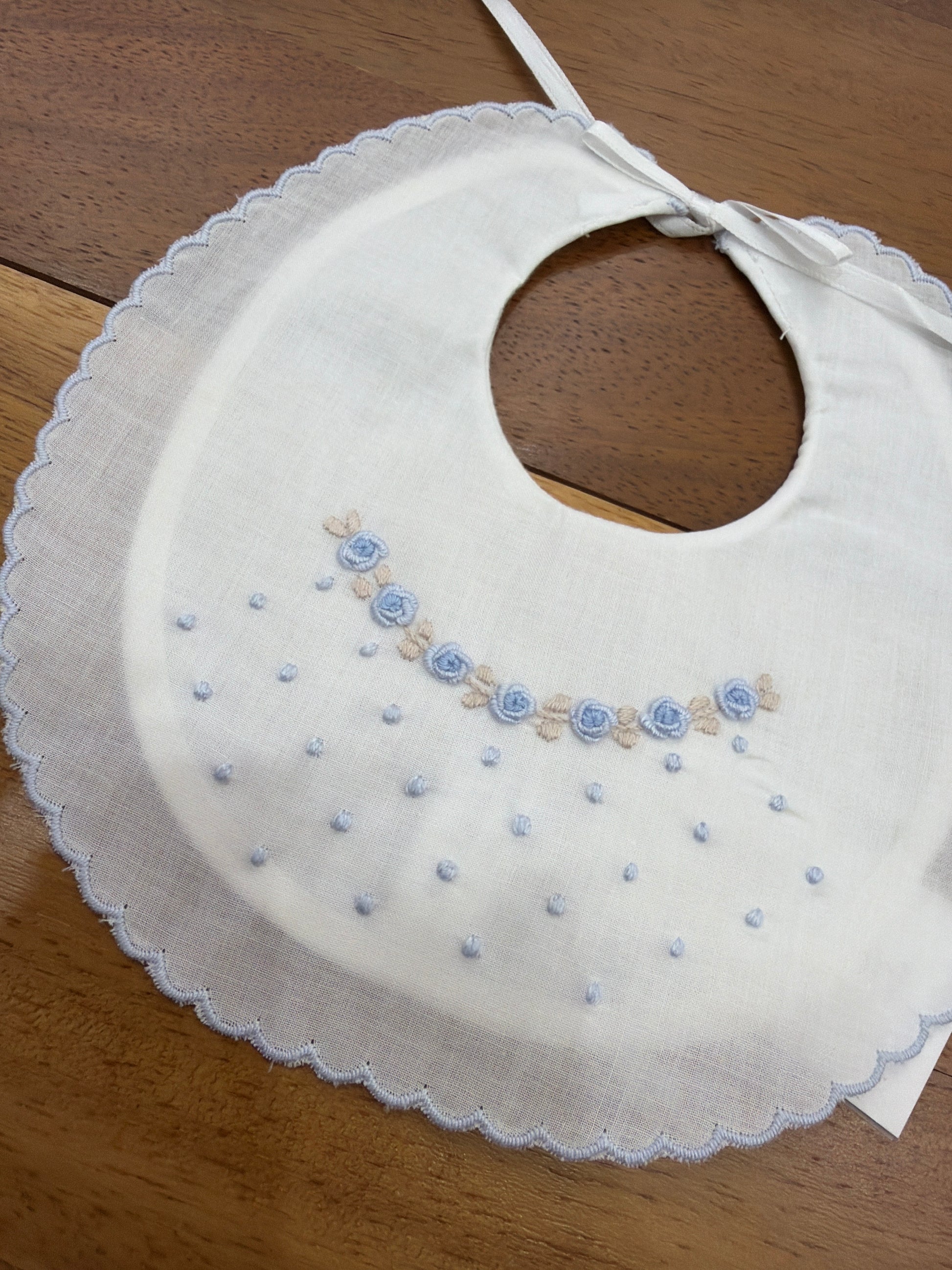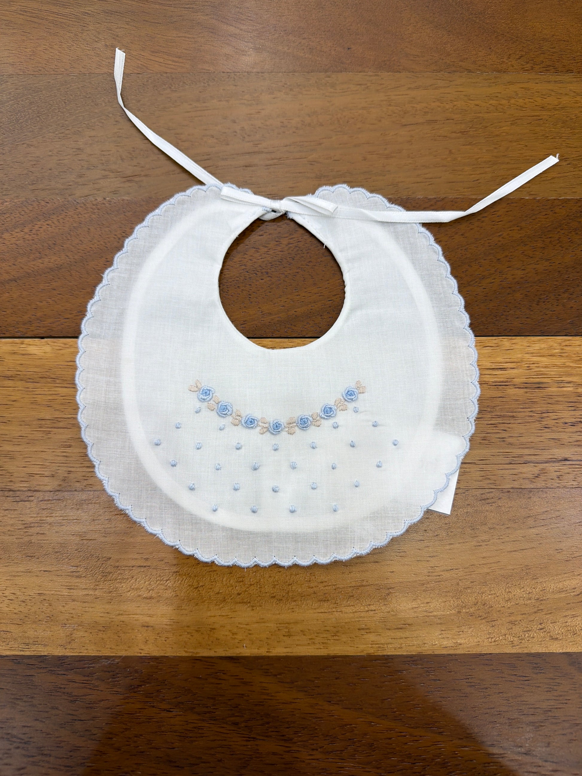 Bavaglino di colore bianco caratterizzato da un bordo in tonalità celeste, impreziosito da eleganti motivi a fiori e pois i nelle sfumature tortora e celesti, che donano un raffinato tocco di stile e rafforzano la versatilità del capo.