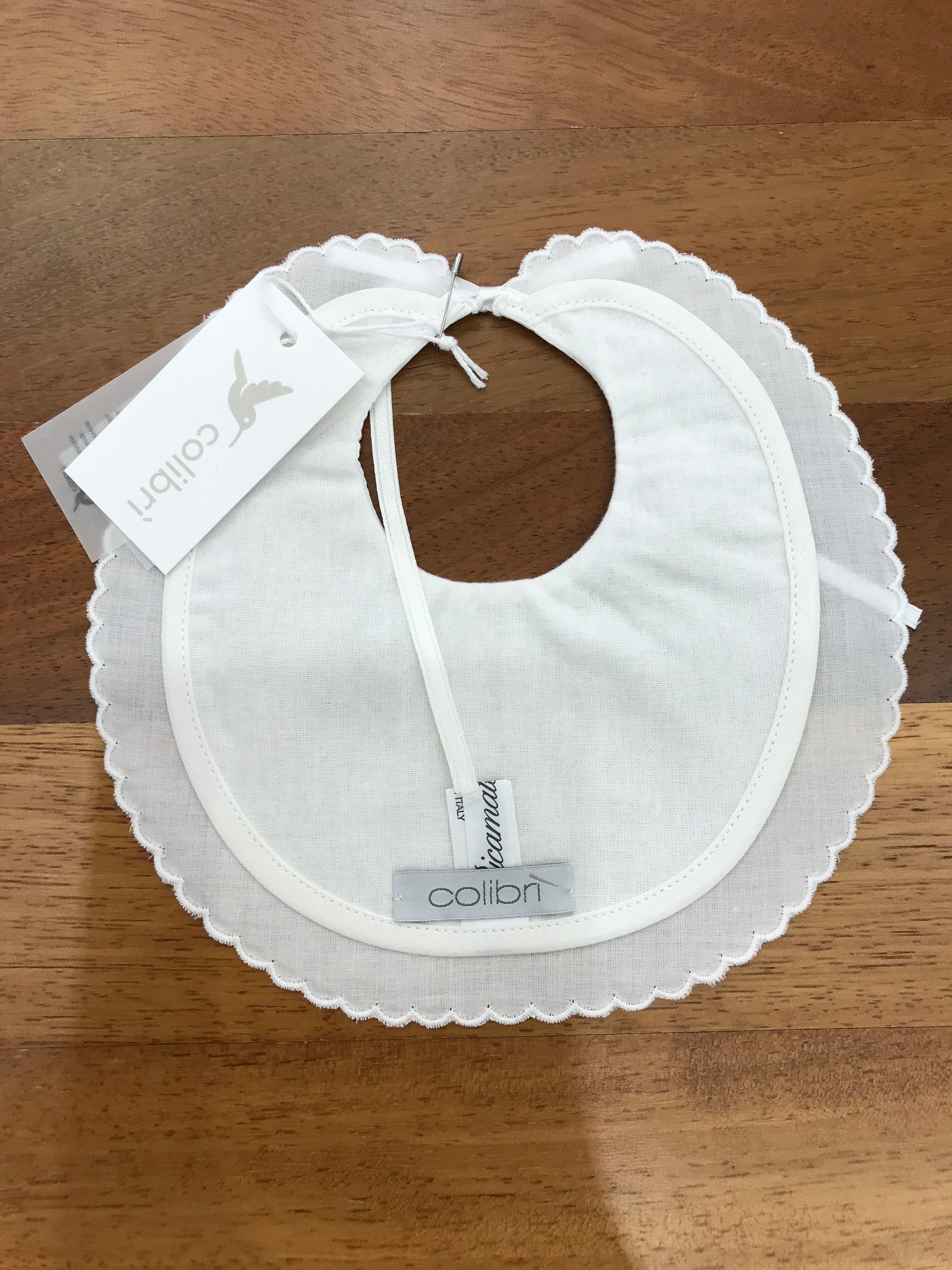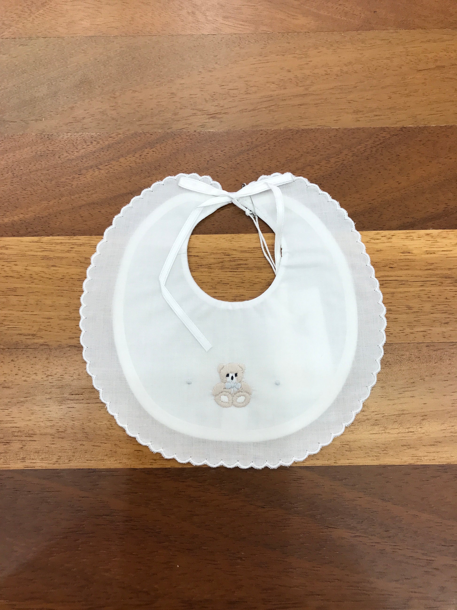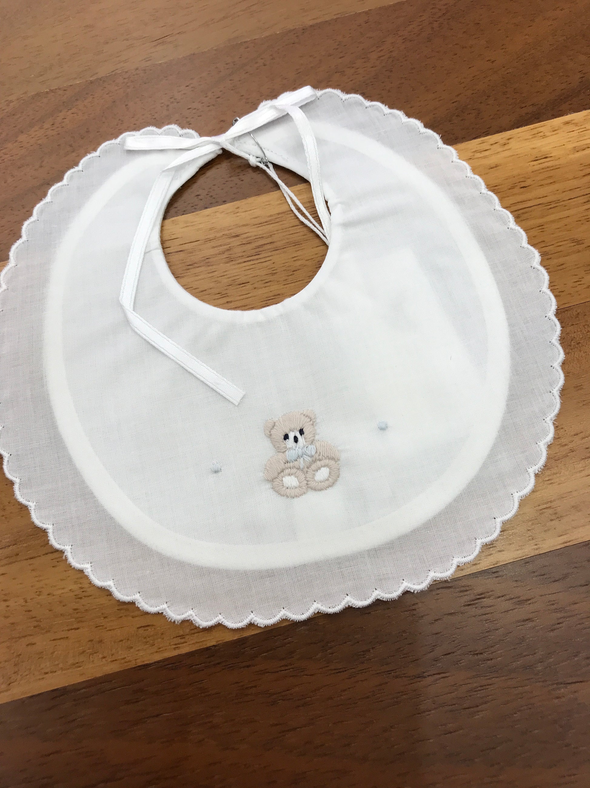 Questa bavetta bianca presenta un bordo smerlato, si chiude con un elegante fiocchetto e sul davanti è decorata con un orsetto ricamato.