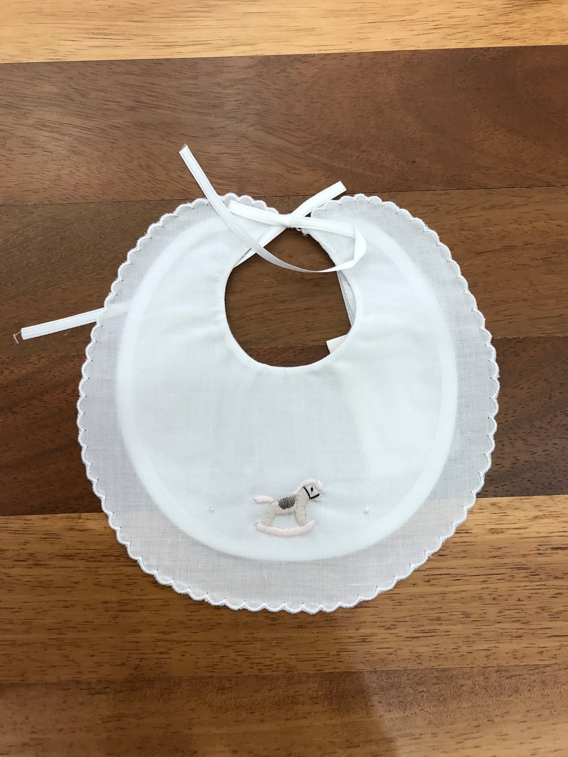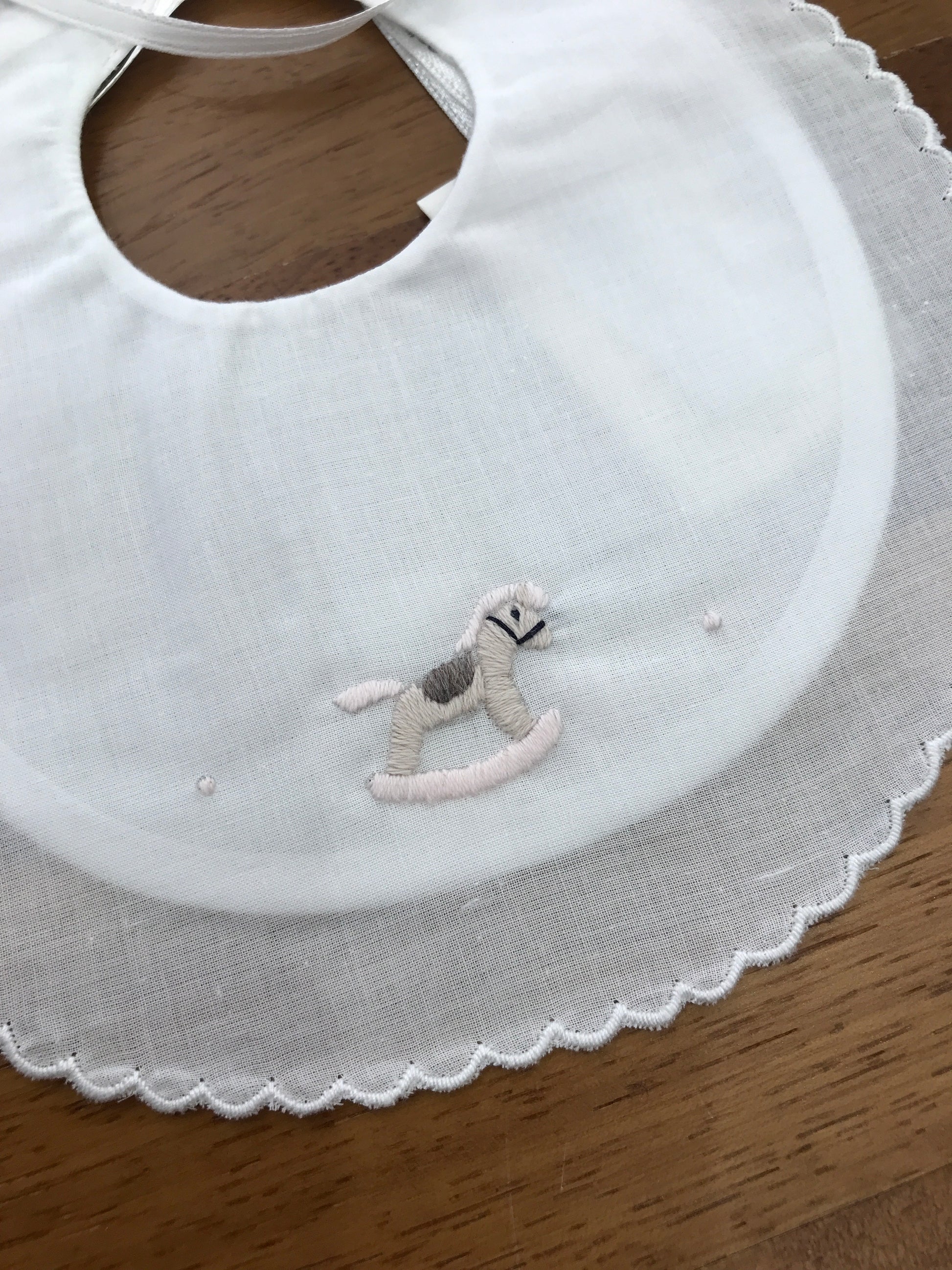 Elegante bavaglino in puro cotone bianco, arricchito da un delicato ricamo manuale raffigurante un cavallo sul petto. I dettagli in rosa aggiungono un tocco di raffinatezza e femminilità al capo, rendendolo perfetto per le piccole fashioniste. Realizzato con cura artigianale, combina praticità e stile per i momenti speciali della giornata.