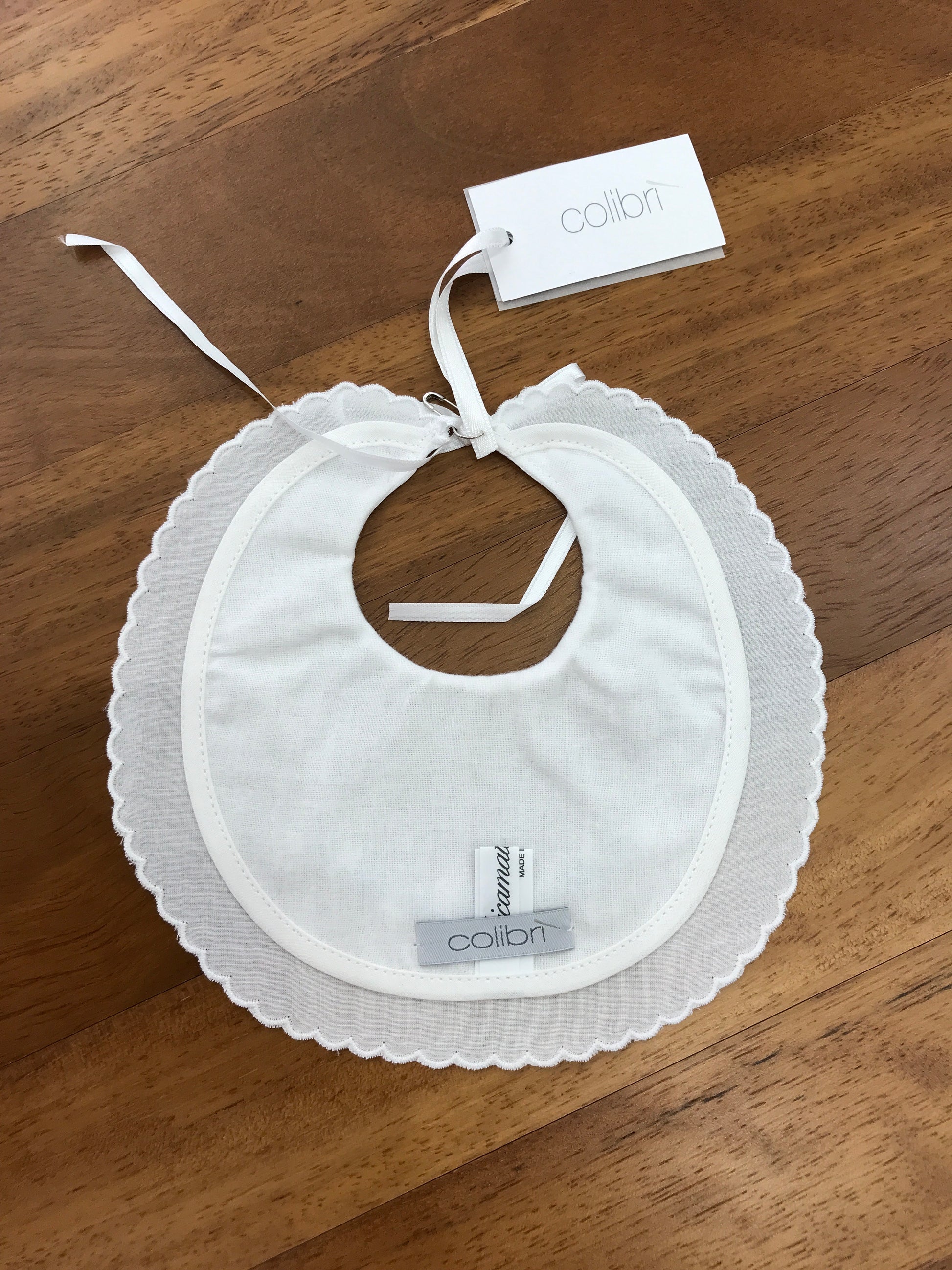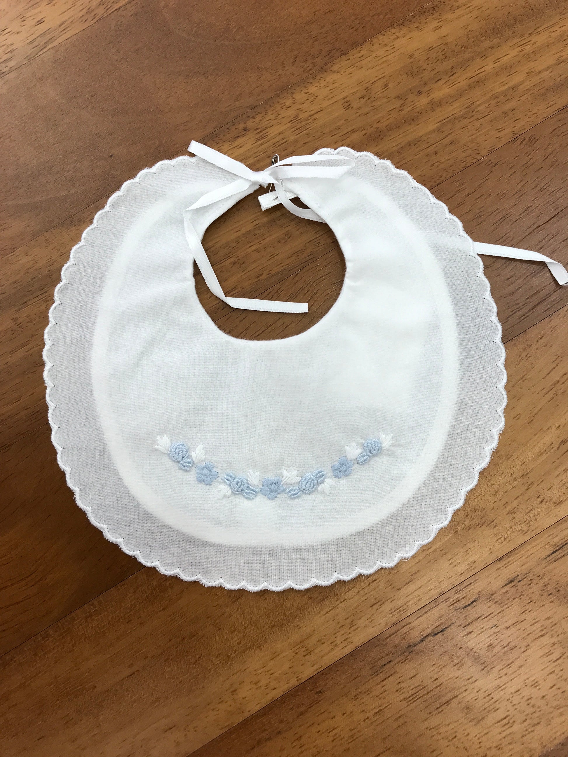 Bavetta realizzata in battista di cotone, rifinita con smerlo e decorata con piccoli fiorellini in due sfumature di celeste.