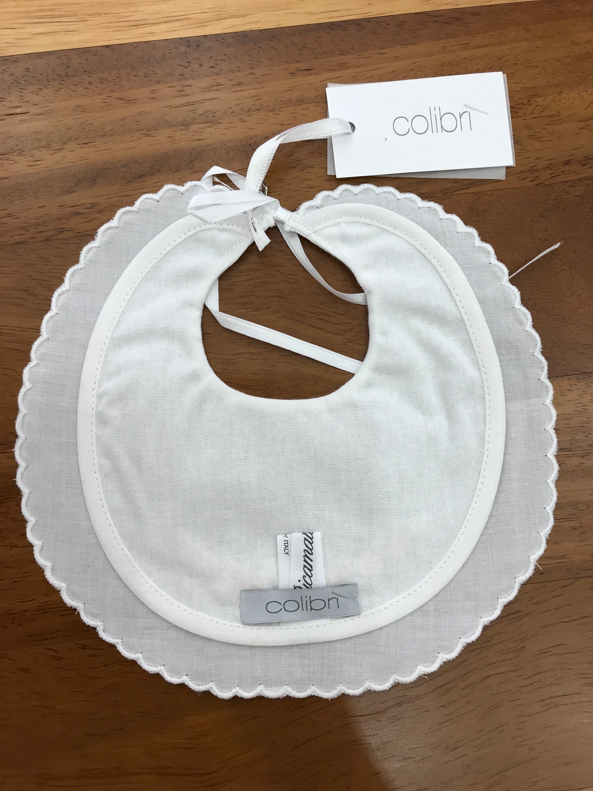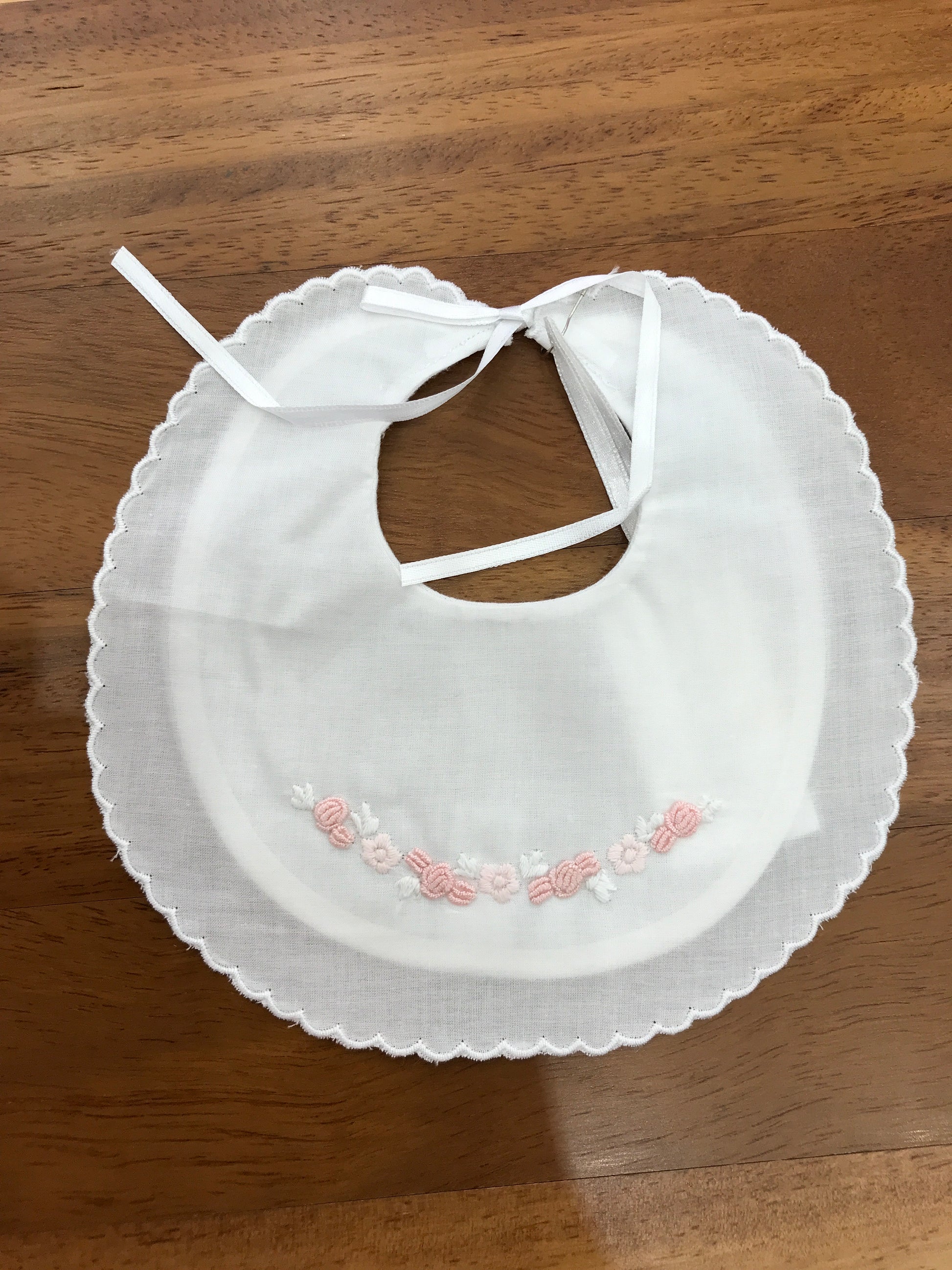 Bavetta realizzata in battista di cotone, rifinita con smerlo e decorata con piccoli fiorellini in due sfumature di rosa.