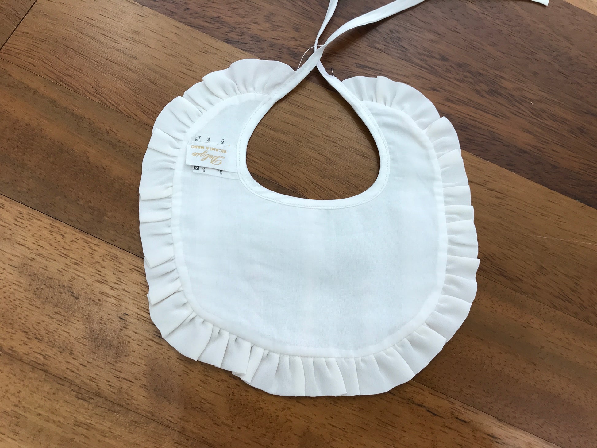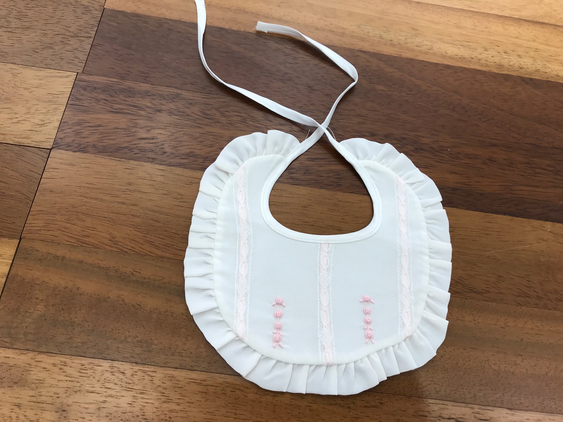 Bavaglino in seta color panna caratterizzato da una raffinata lavorazione con fiori rosa ricamati al centro. Il capo presenta inoltre un elegante merletto applicato simmetricamente su entrambi i lati, posizionato al centro e leggermente più lungo, per un dettaglio di classe che valorizza ogni occasione speciale.