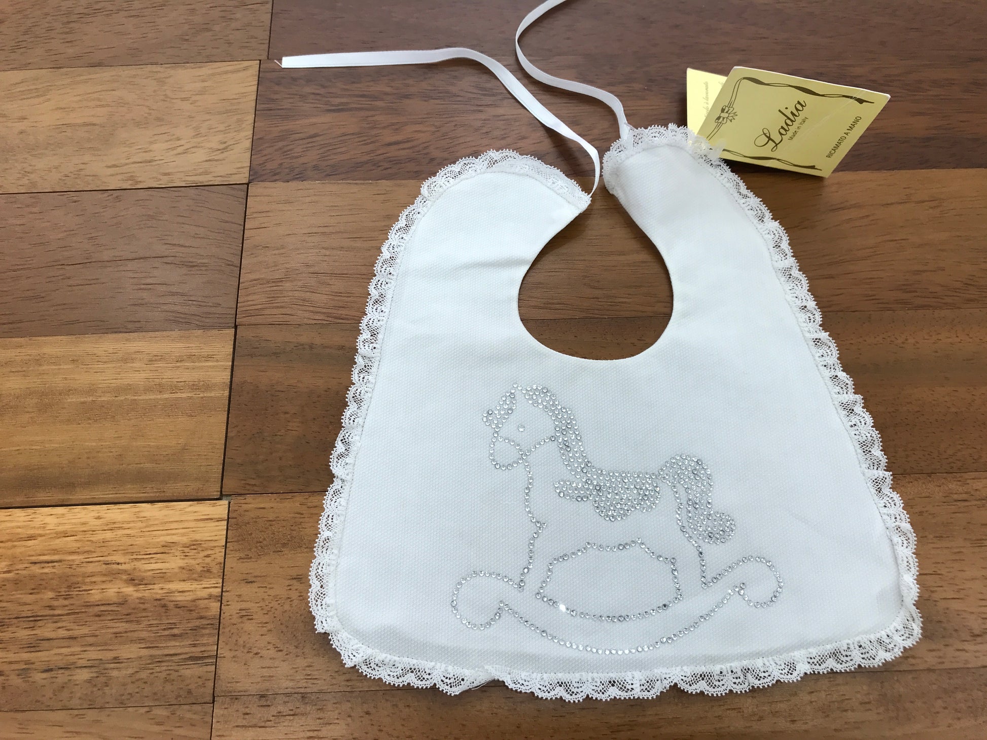 Questo bavaglino elegante presenta un delicato merletto ricamato che impreziosisce tutti i bordi, arricchito da un motivo a cavallo a dondolo realizzato con brillantini scintillanti. La chiusura sul retro, rifinita con un raffinato fiocchetto, garantisce una vestibilità comoda e sicura, unendo funzionalità e stile in un accessorio indispensabile per i momenti dedicati al tuo bambino.
