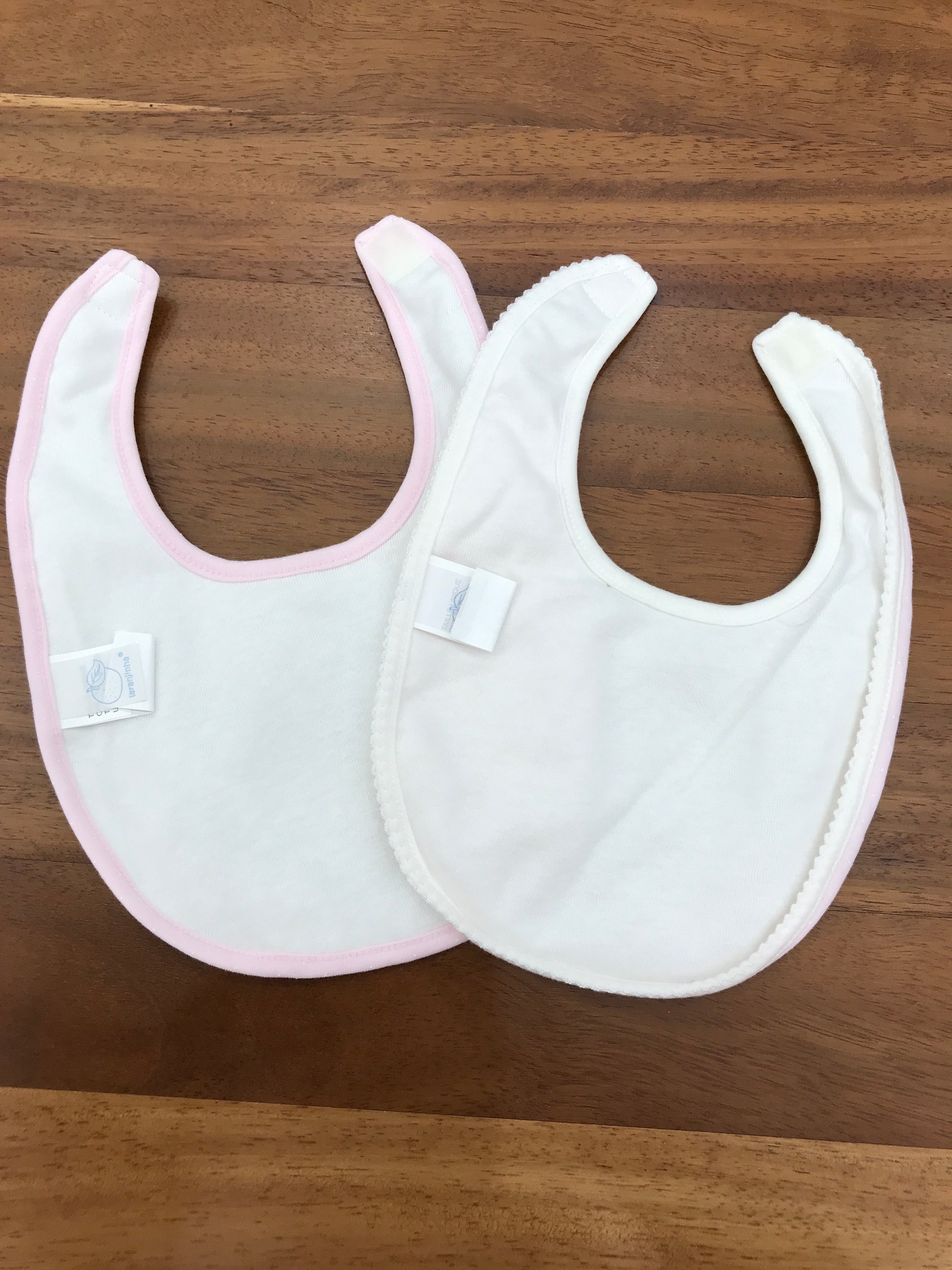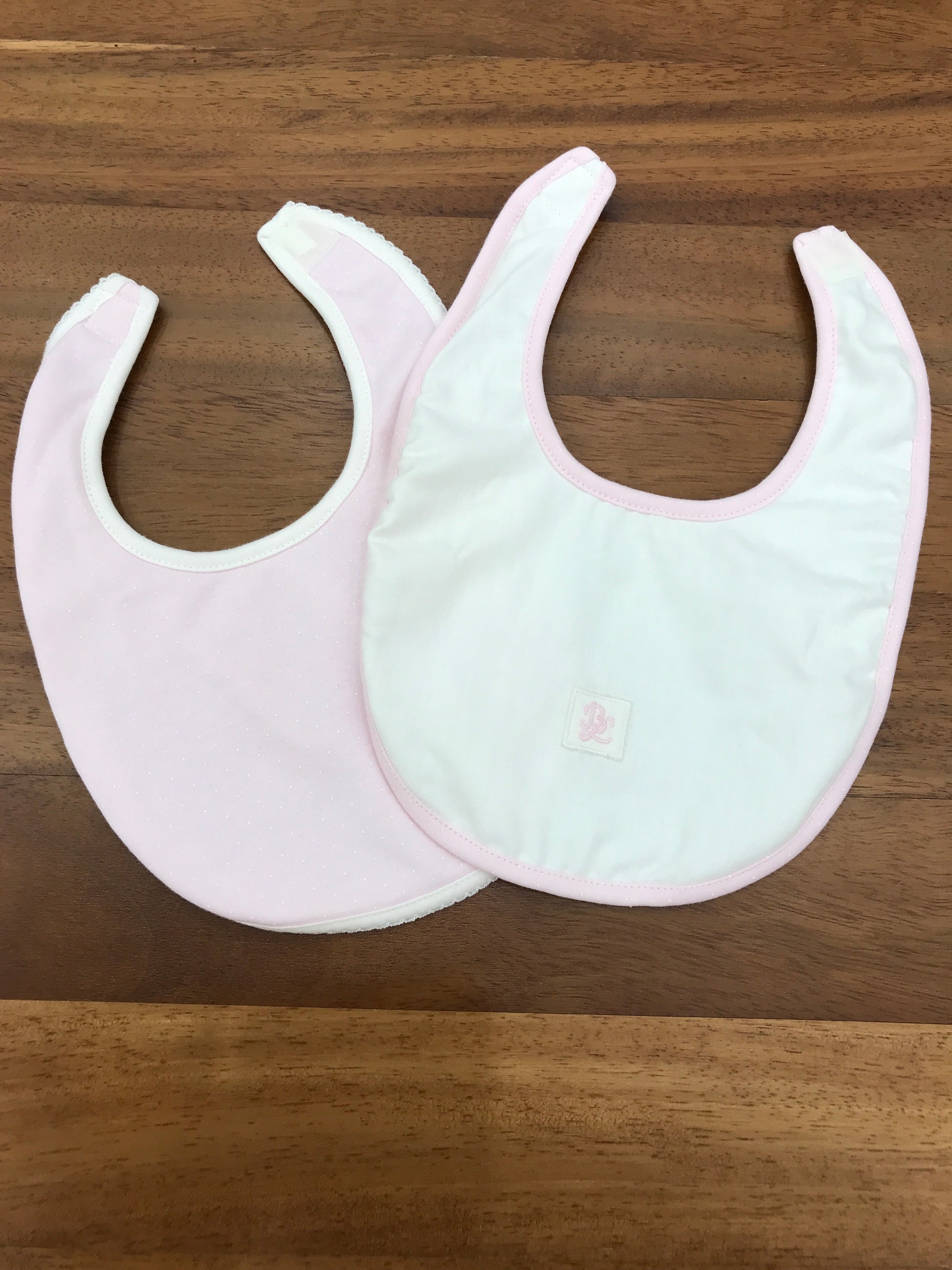 Set di due bavette nei toni rosa e panna dal design essenziale, dotate di pratico sistema di chiusura con velcro.