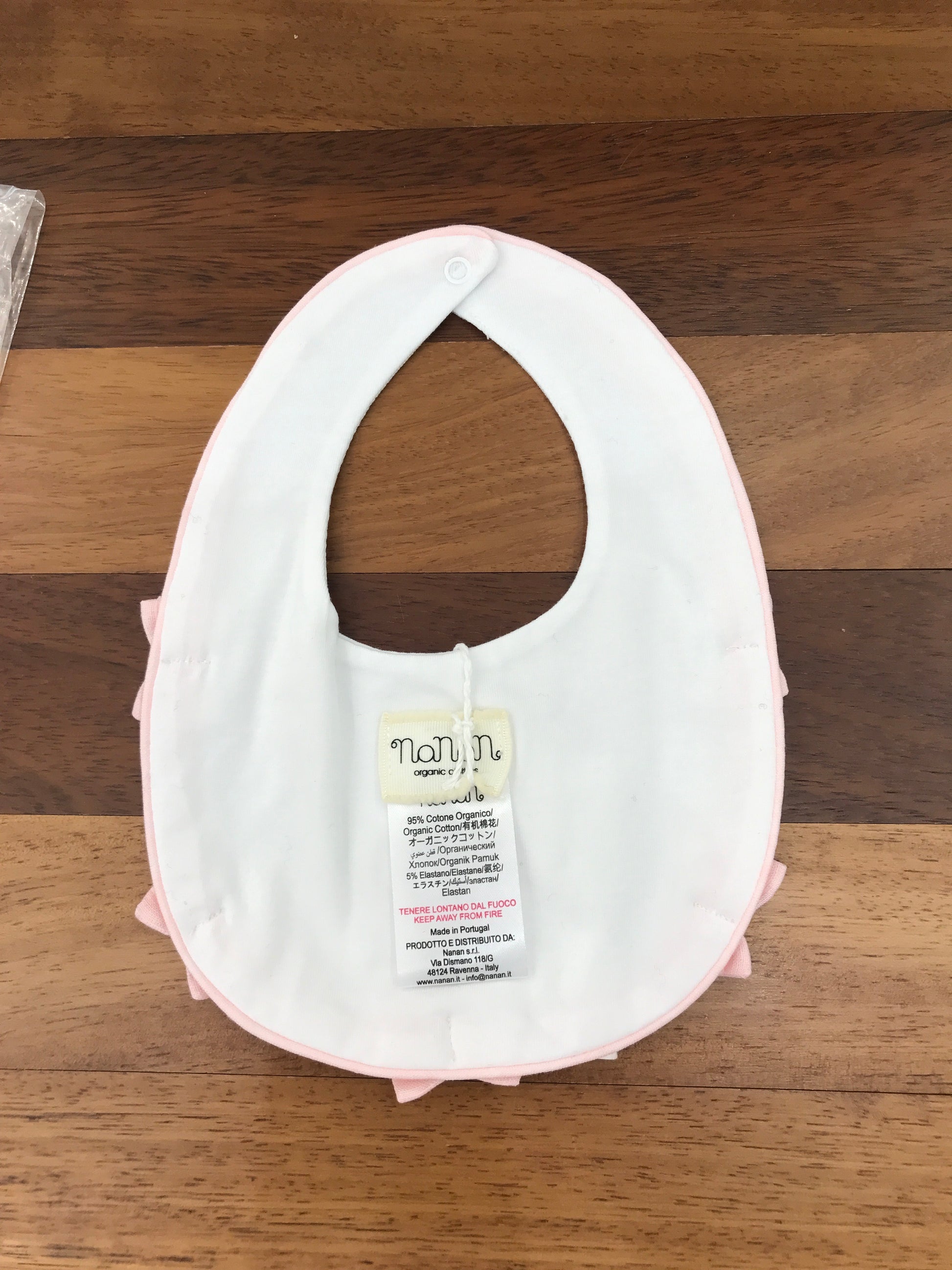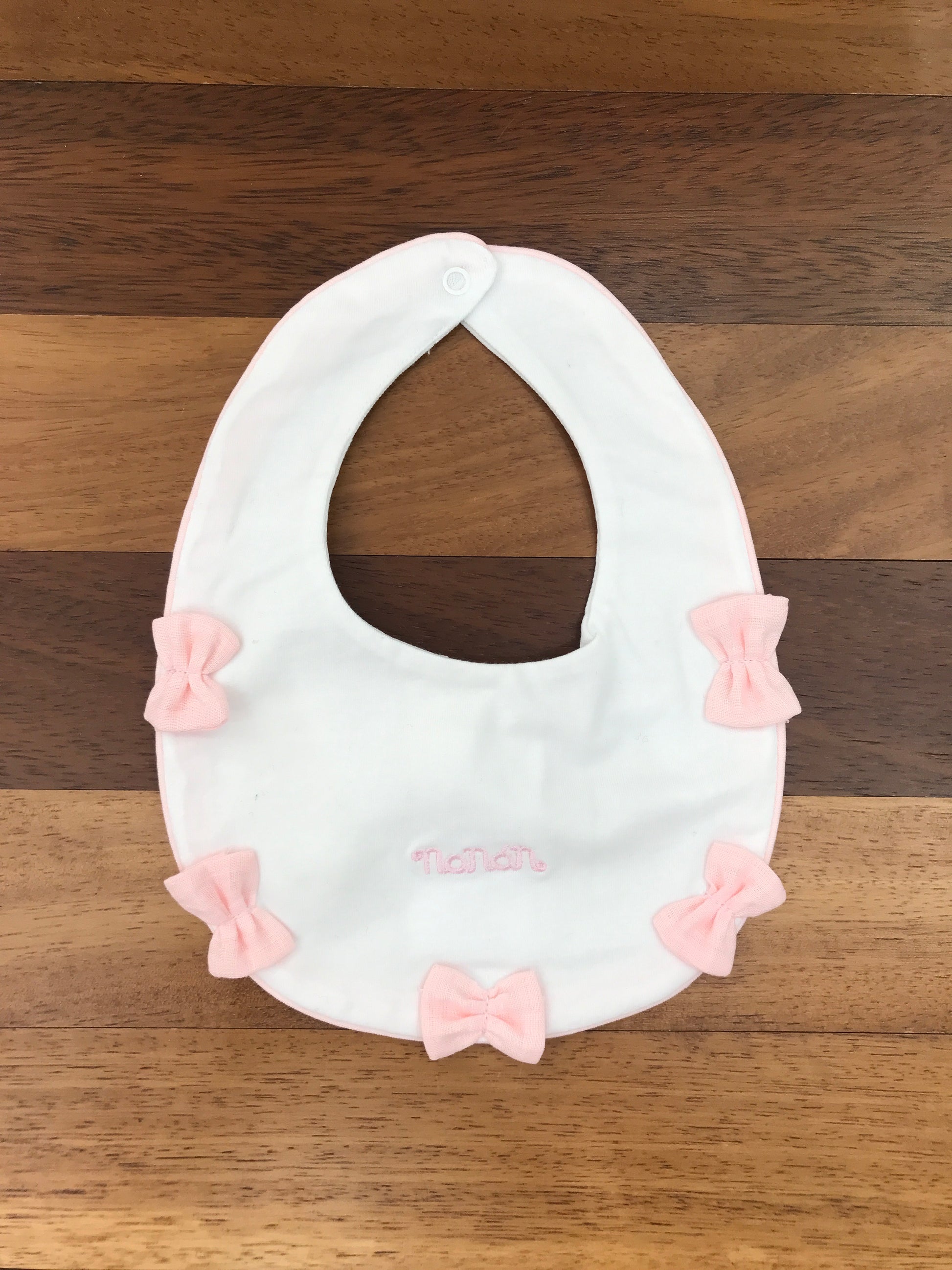 Delicato bavaglino realizzato in puro cotone bianco, arricchito da una raffinata finitura con fiocchetti rosa che percorrono tutto il perimetro. Un accessorio essenziale per proteggere gli indumenti del bambino durante i pasti, combinando praticità e eleganza con dettagli decorativi che aggiungono un tocco di dolcezza.
