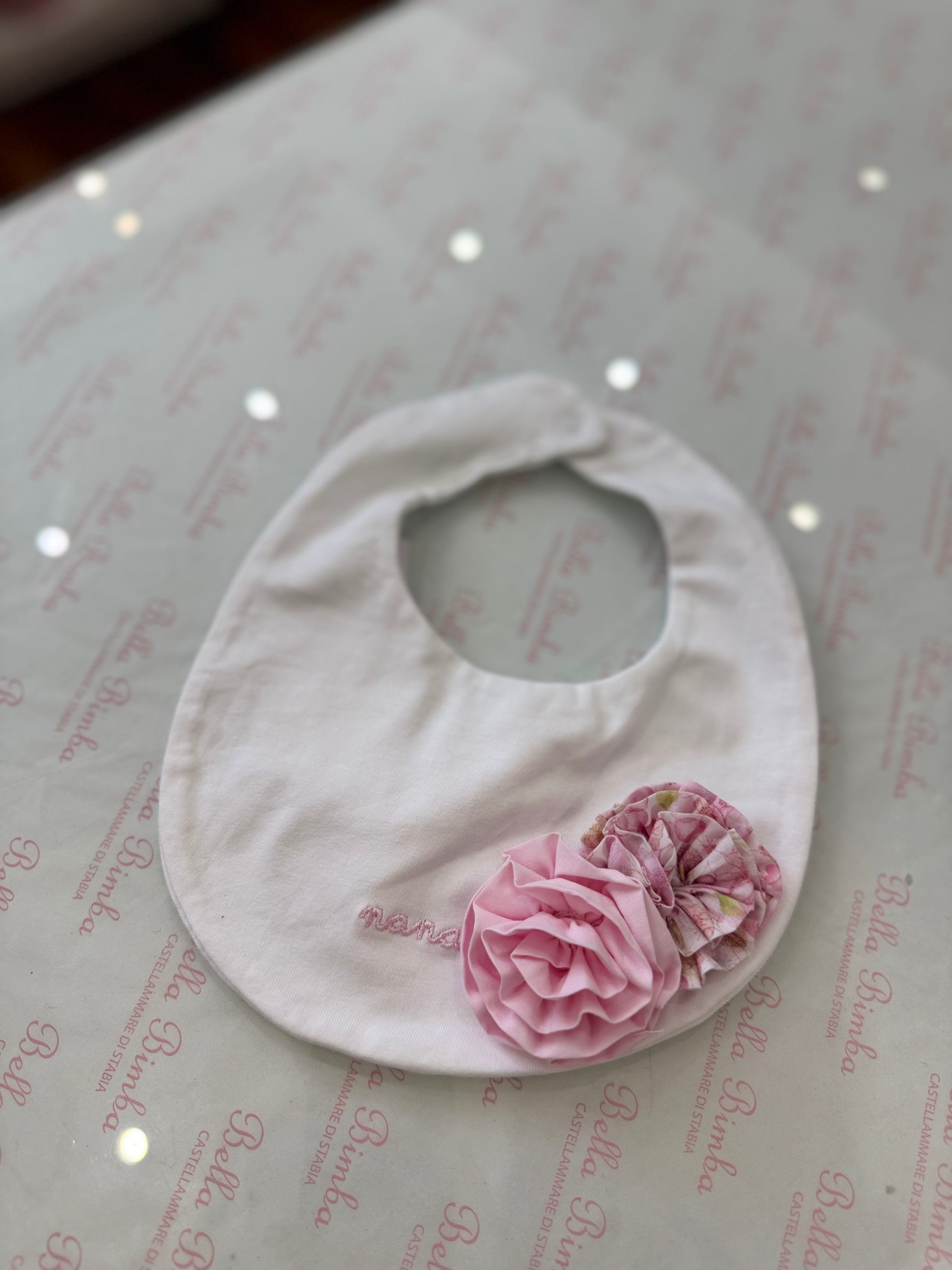 "Bavetta Nanan è realizzata in morbido cotone e impreziosita da 2 rose in tessuto floreale, per donare ad ogni pappa un tocco di stile ed eleganza. Ideale per mantenere pulito il tuo bambino senza rinunciare alla bellezza."