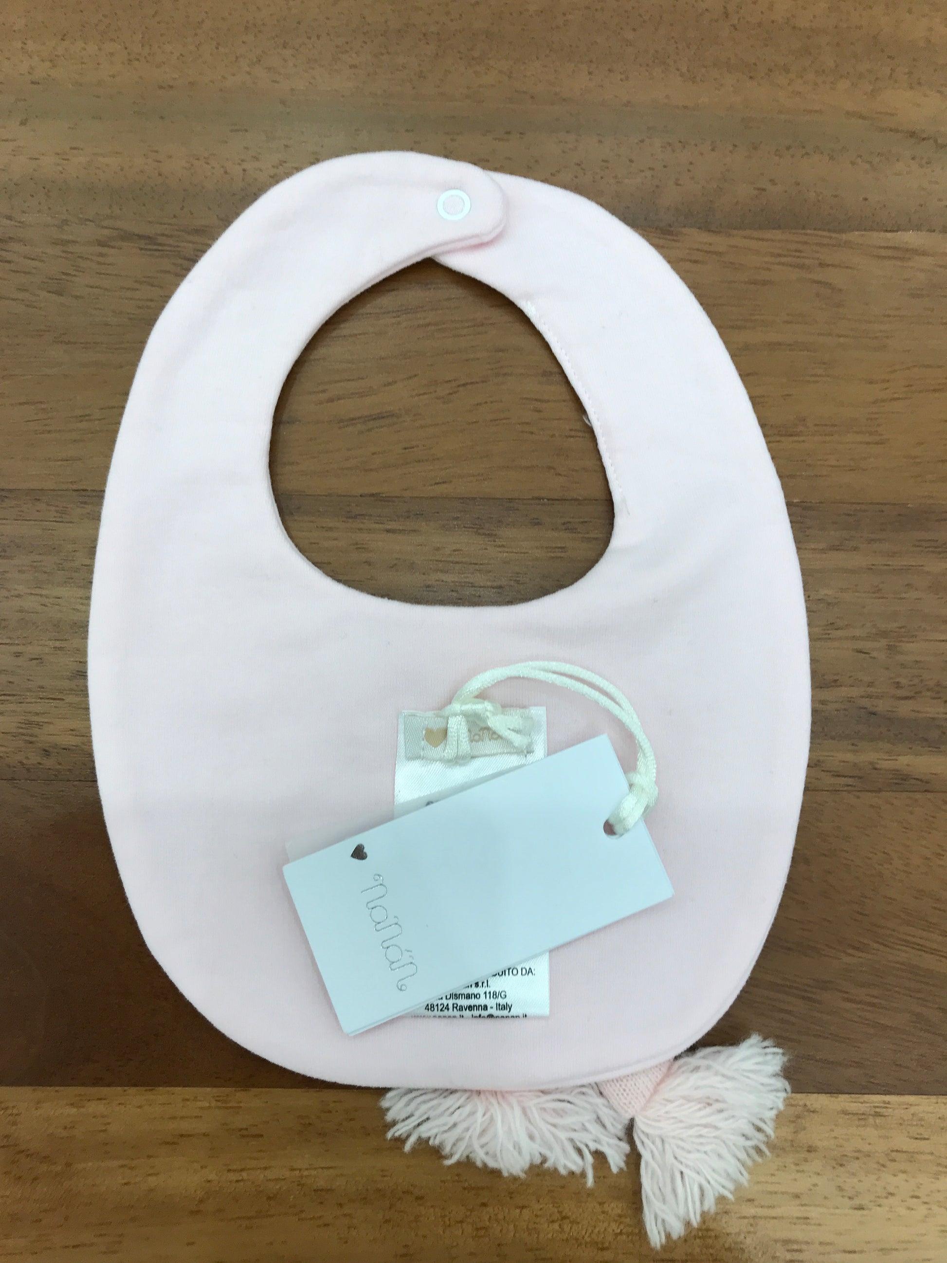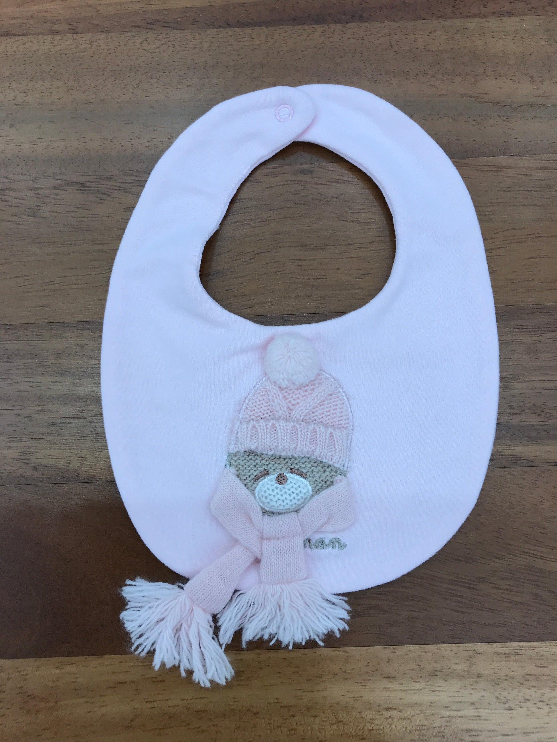 Bavetta caratterizzata da una forma rotonda, impreziosita da un orsetto in rilievo che indossa una sciarpa e un cappello, offrendo un design delicato e accogliente ideale per i più piccoli.